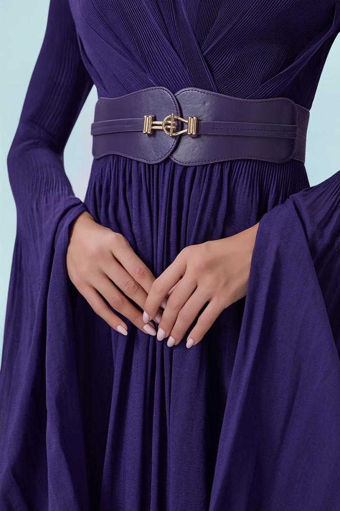 • الحزام: عريض باللون البنفسجي مع إبزيم أنيق