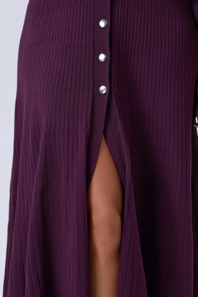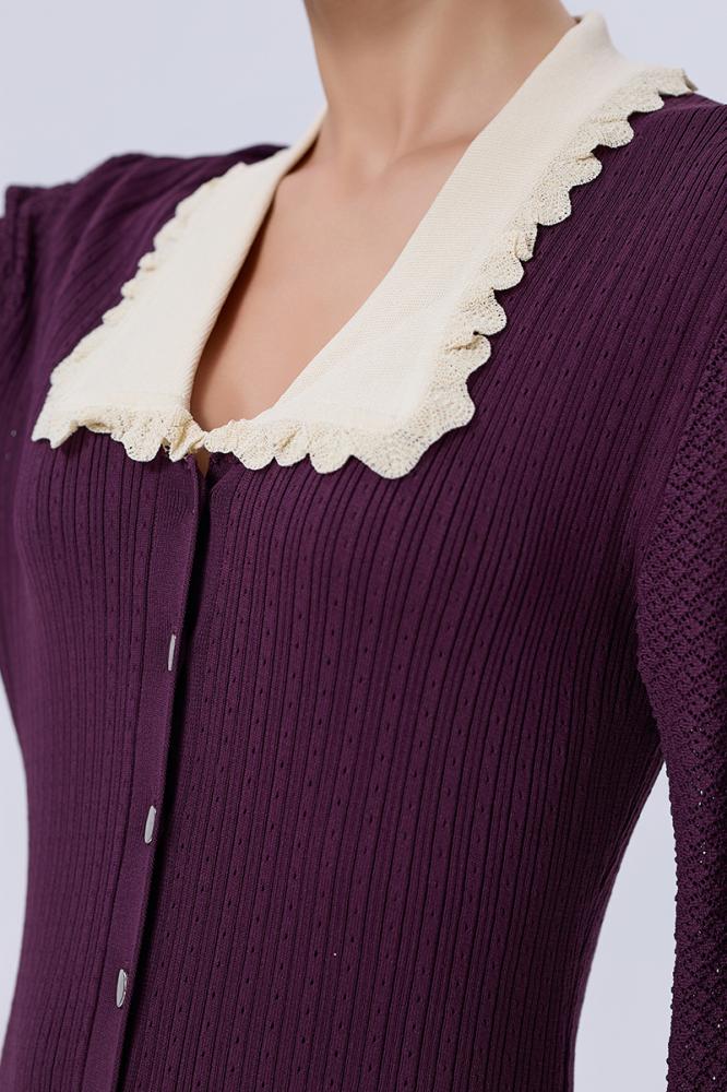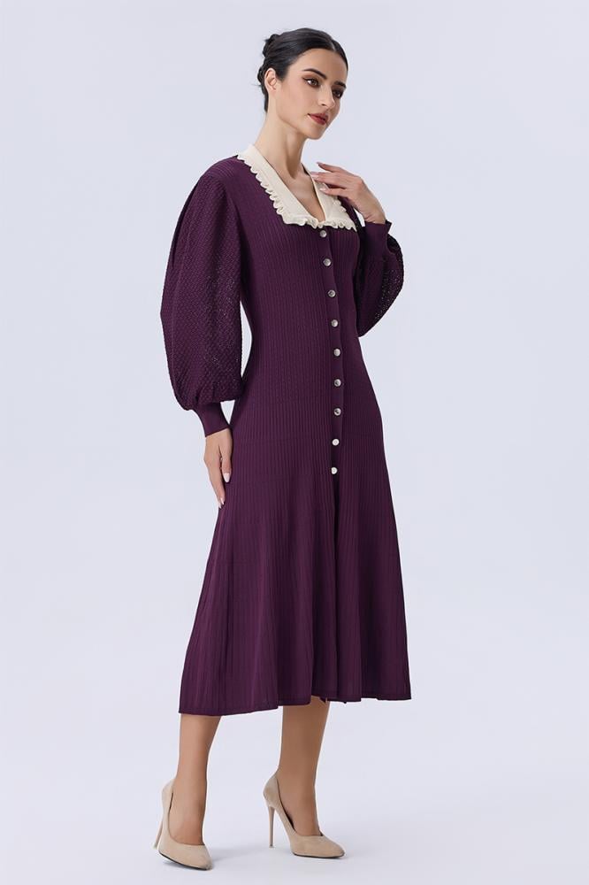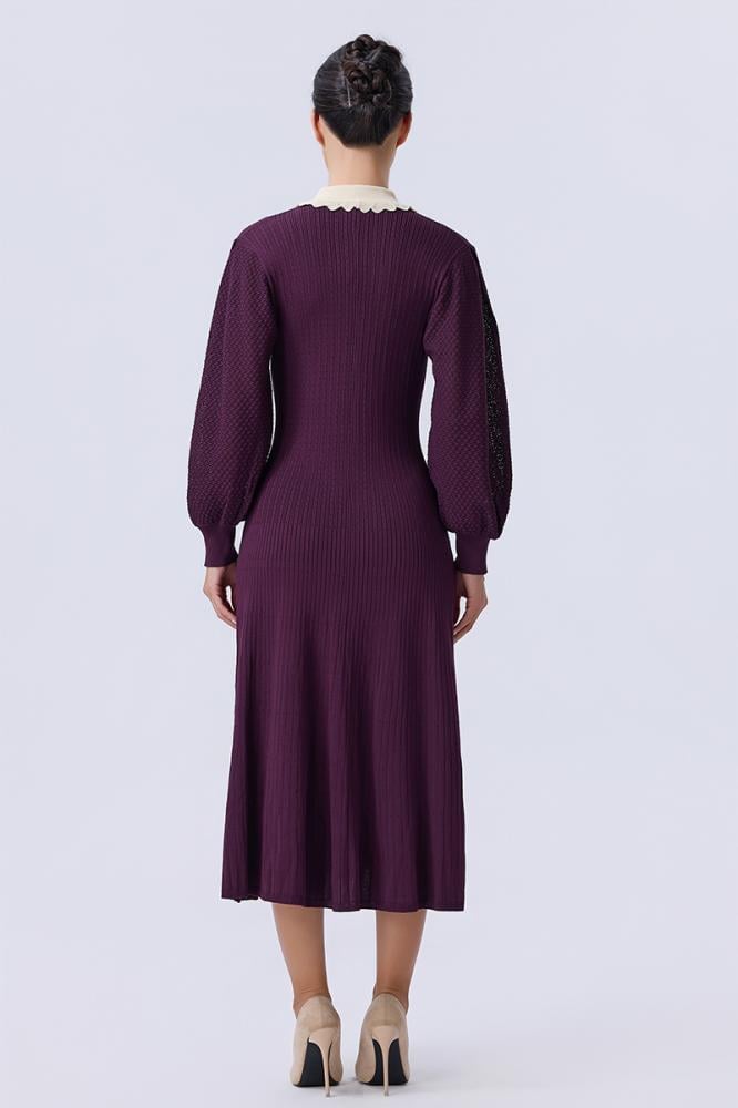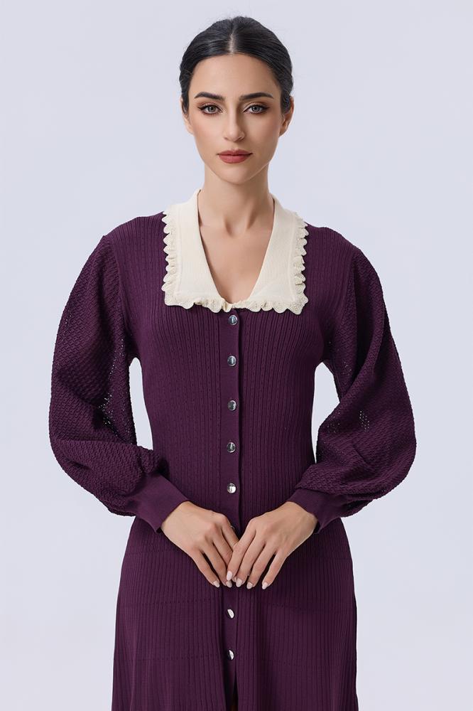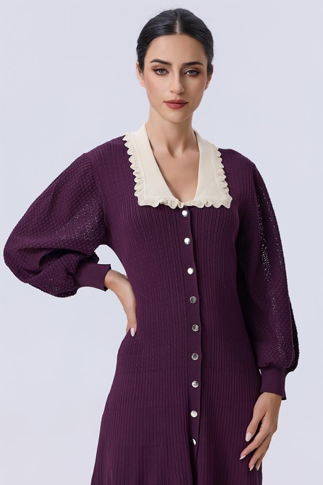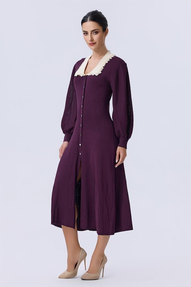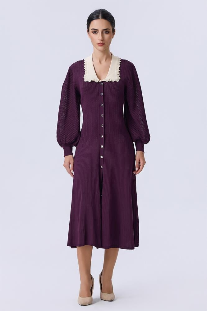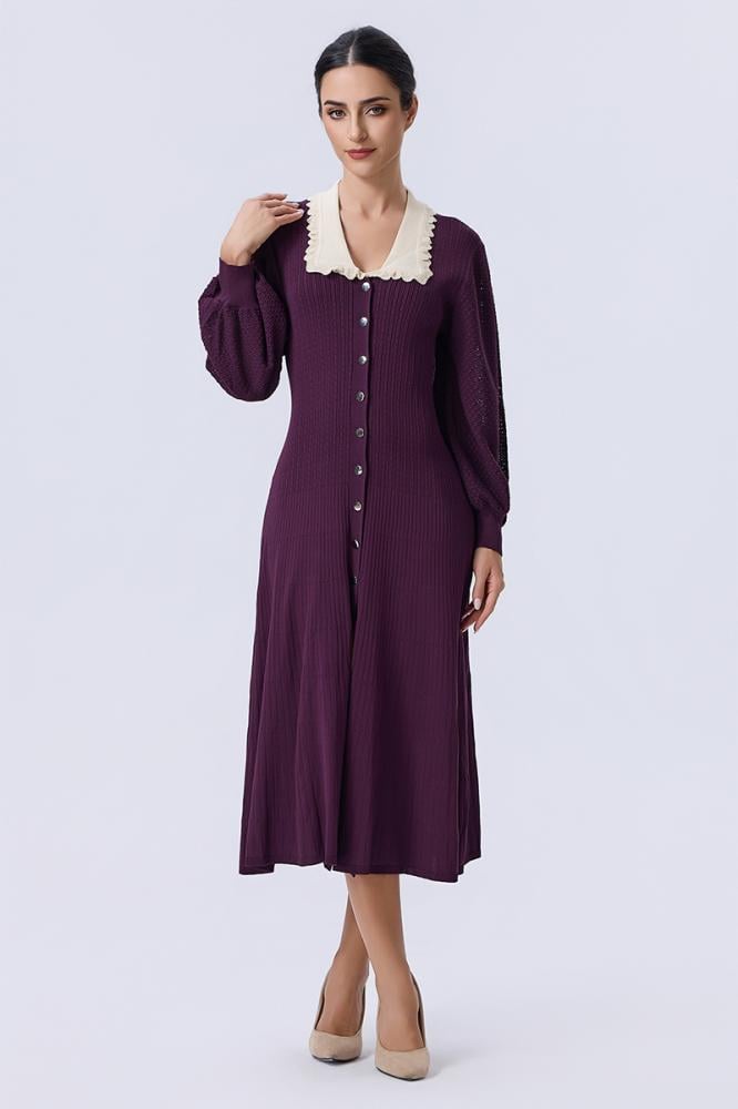 فستان بنفسجي بياقة بيج وأزرار أمامية