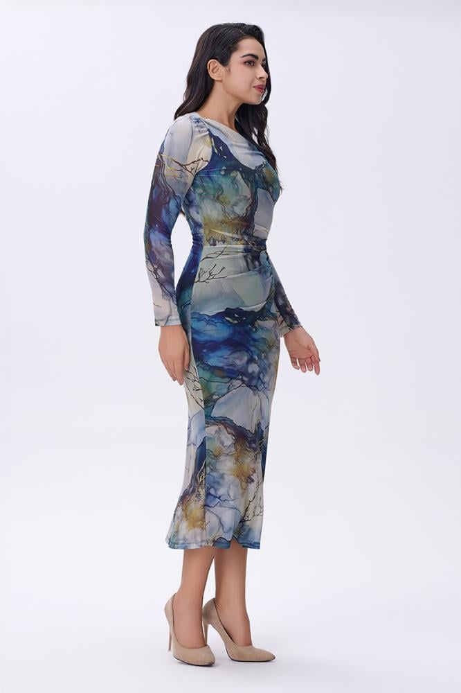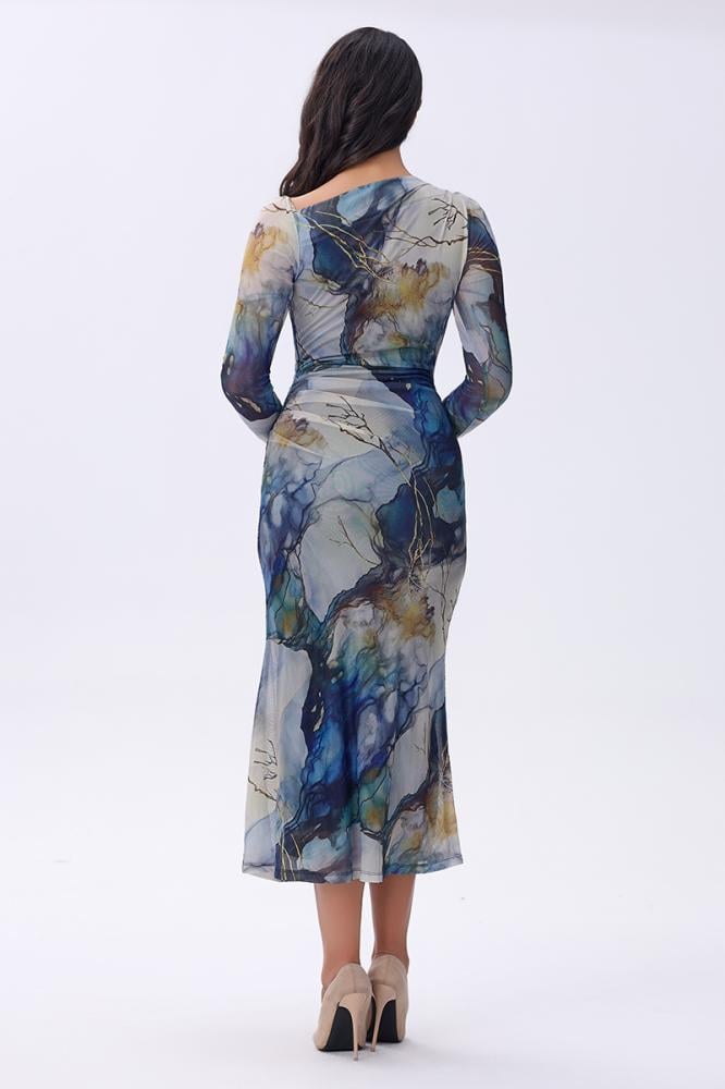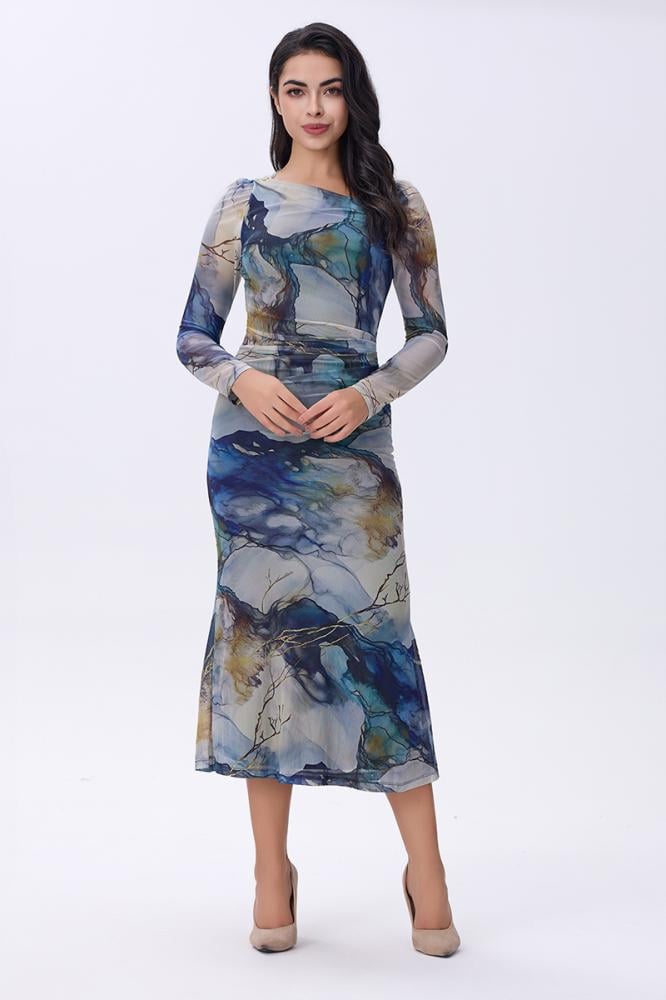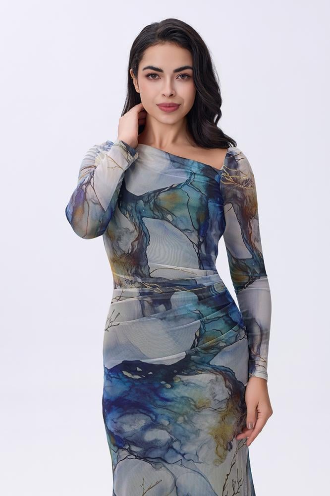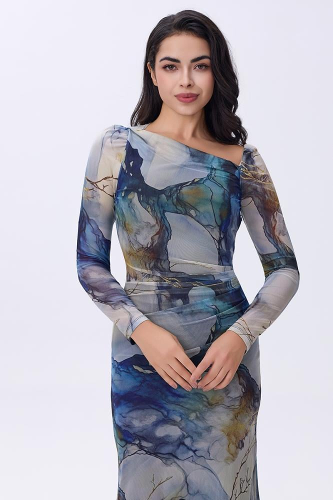 فستان أنيق بتصميم عصري مستوحى من لوحات الفن التجريدي، يتميز بطباعة فريدة تمزج بين درجات الزرق والأزرق و البيج بتناسق جذاب يعكس ذوقًا راقيًا. يأتي بقصة ضيقة تبرز القوام بانسيابية أنثوية، مع أكمام طويلة وقماش ناعم يمنح راحة وأناقة في الوقت ذاته. خيار مثالي لإطلالة مميزة في المساء أو المناسبات الخاصة.