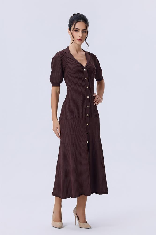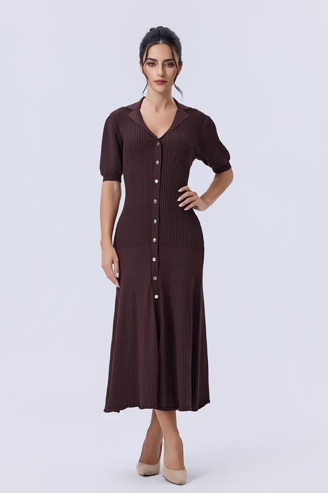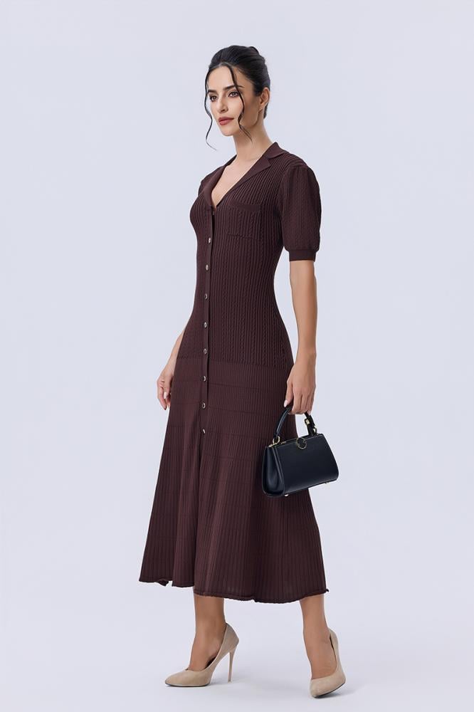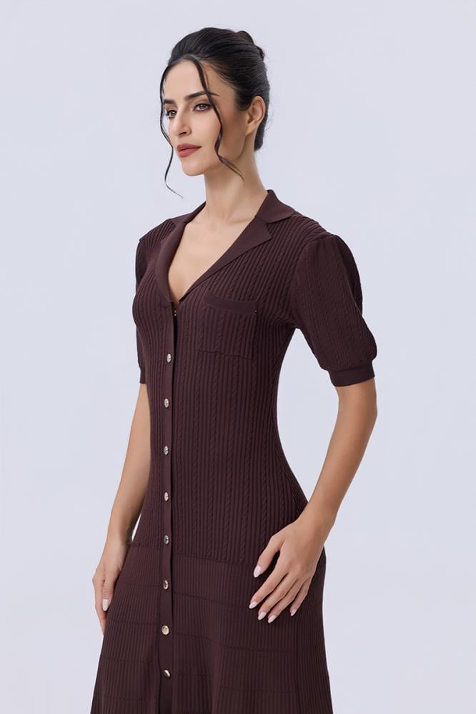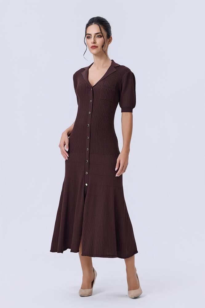 تألقي بأسلوب أنثوي أنيق مع هذا الفستان الميدي المصمم بلون بني غني يبرز جمال الإطلالة. يتميز بأزرار أمامية كاملة تمنح لمسة كلاسيكية عملية، مع ياقة مفتوحة وأكمام قصيرة مريحة تضيف توازناً مثالياً بين العصرية والاحتشام. قصة الفستان المستقيمة مع القماش المحبوك تمنحك مظهراً انسيابياً يعزز جاذبيتك في مختلف المناسبات.