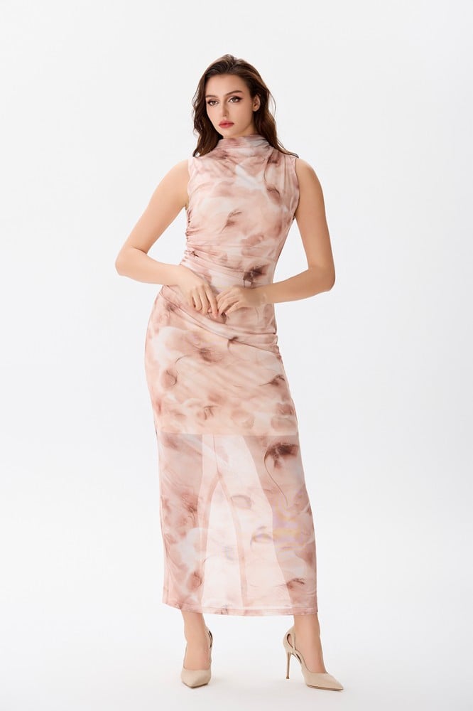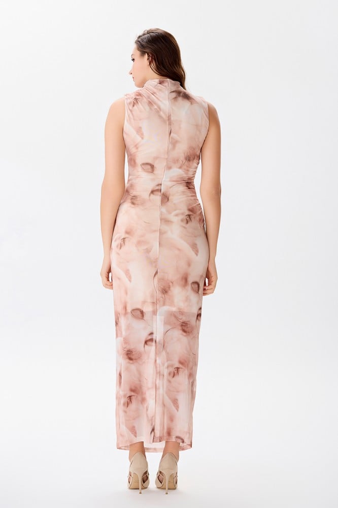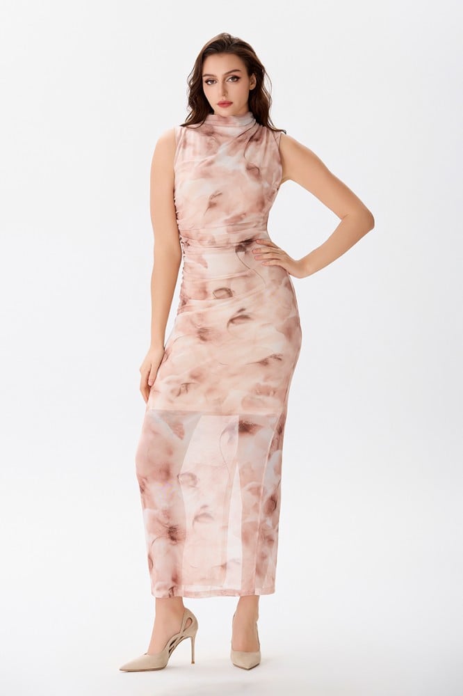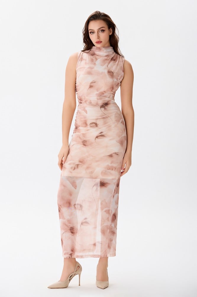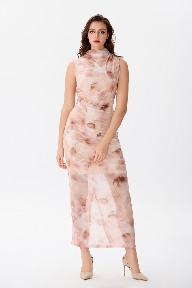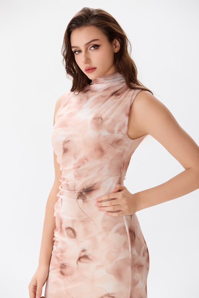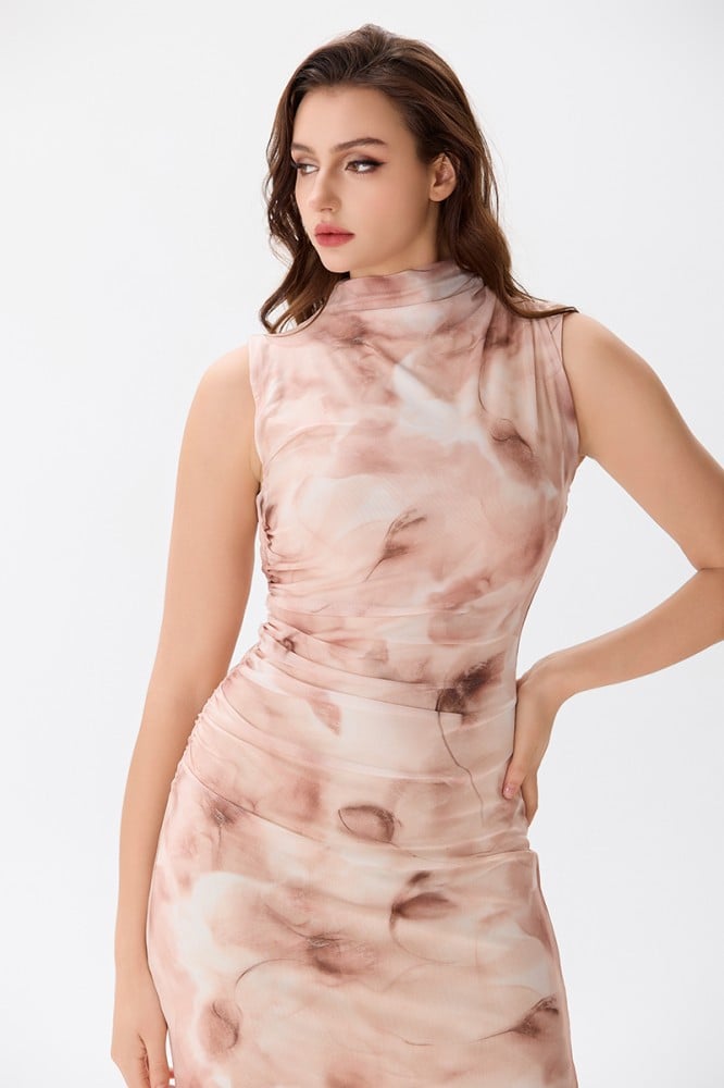 فستان تول استرتش بيج ياقة مرتفعة بدون أكمام مع ثنيات ناعمة على طول الصدر والخصر