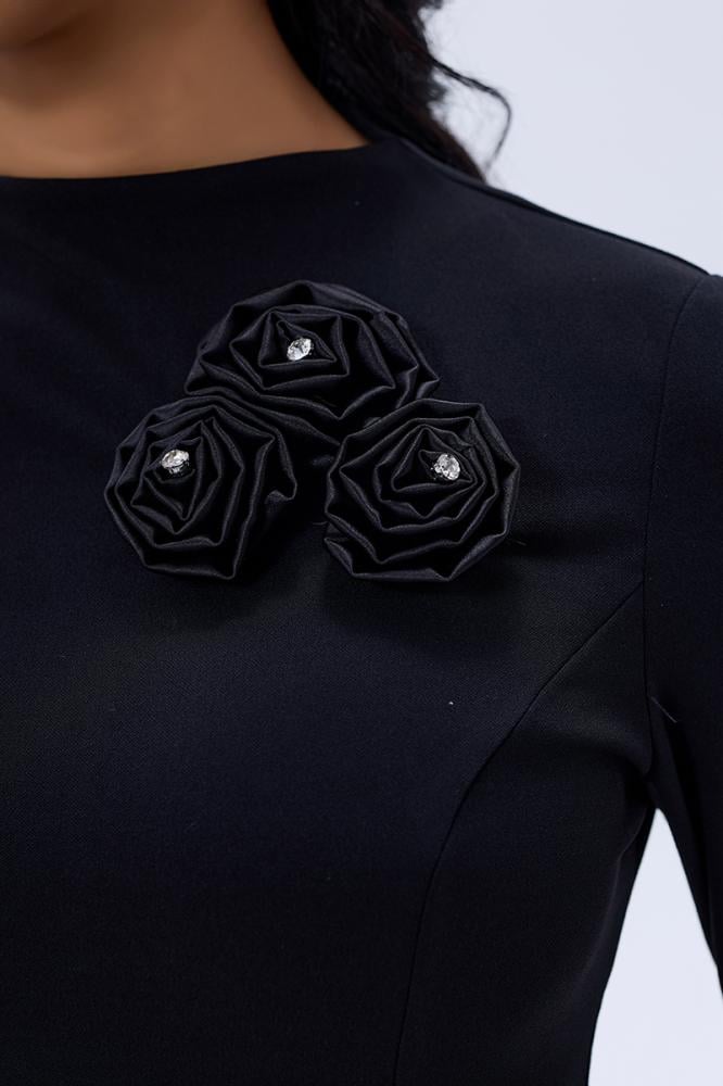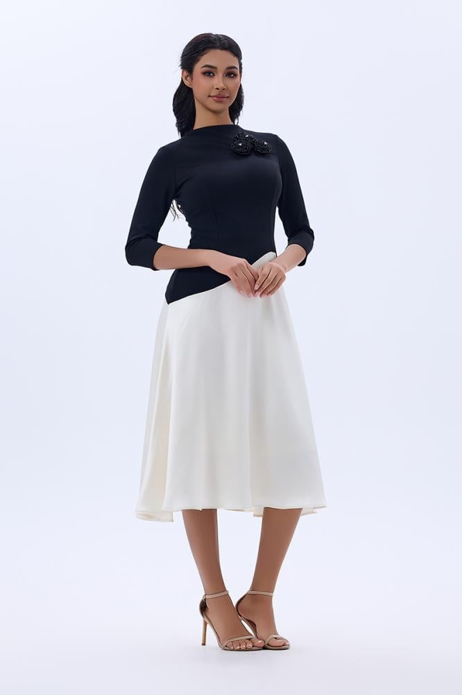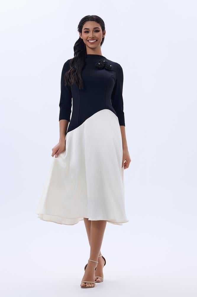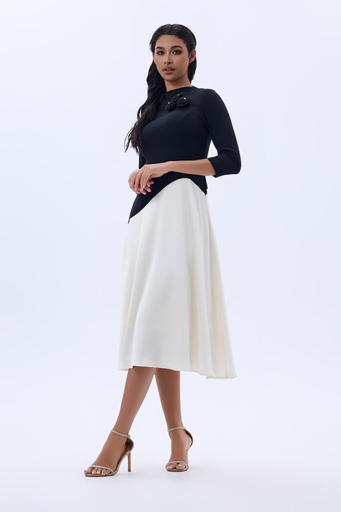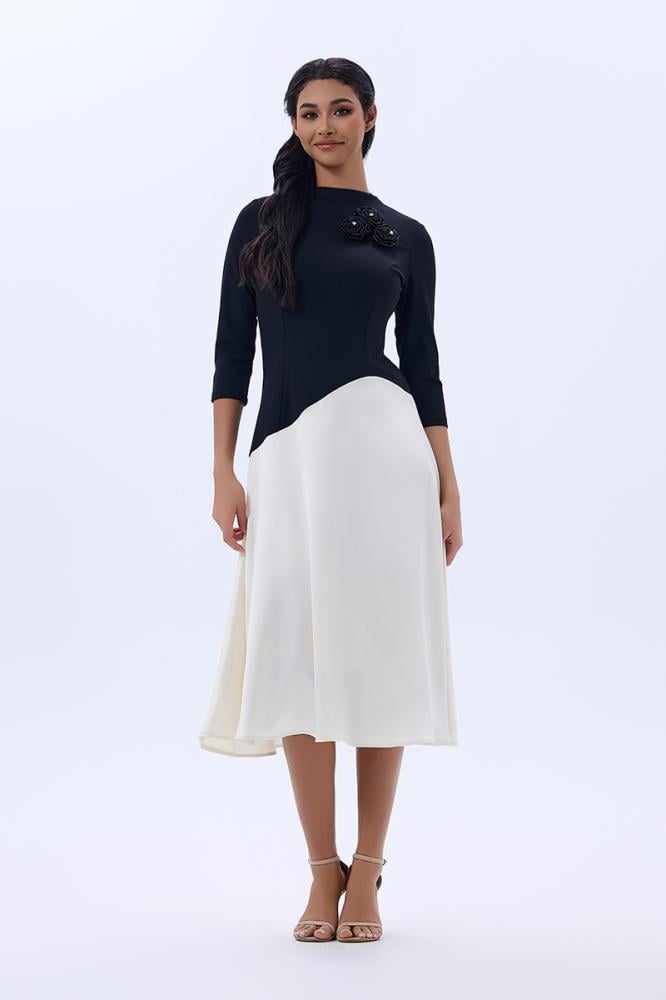 فستان بصدر كريب لون بيج مع اكمام طويلة مزين باكسسوار الورود وتنورة ستان بقصةكلوش عصرية