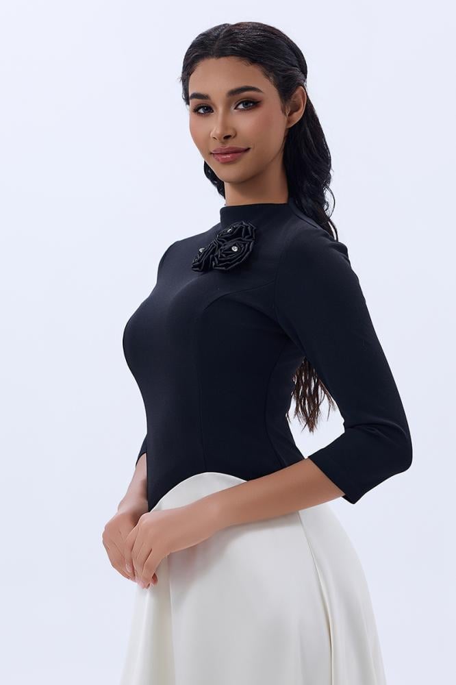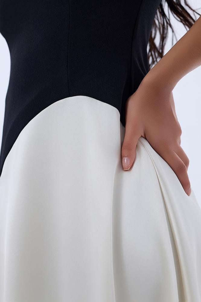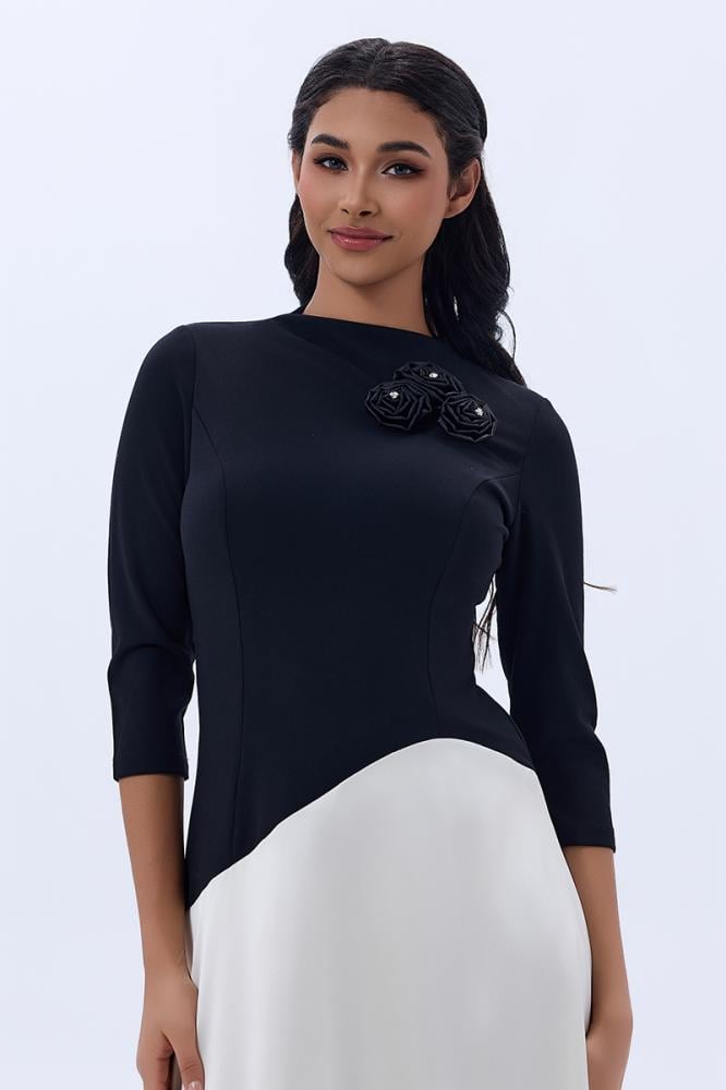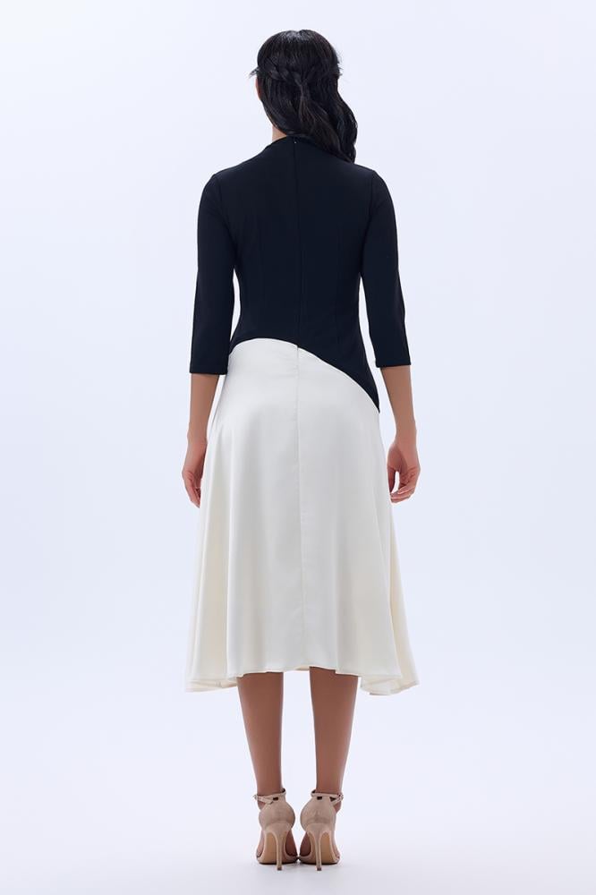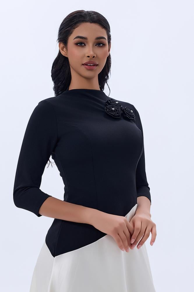 فستان بصدر كريب لون بيج مع اكمام طويلة مزين باكسسوار الورود وتنورة ستان بقصةكلوش عصرية