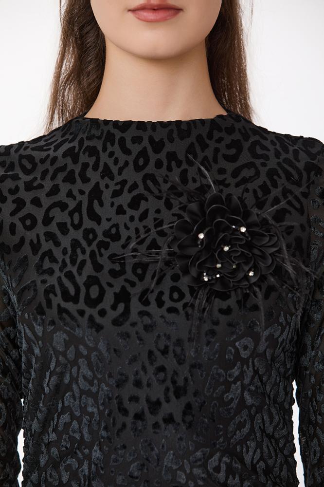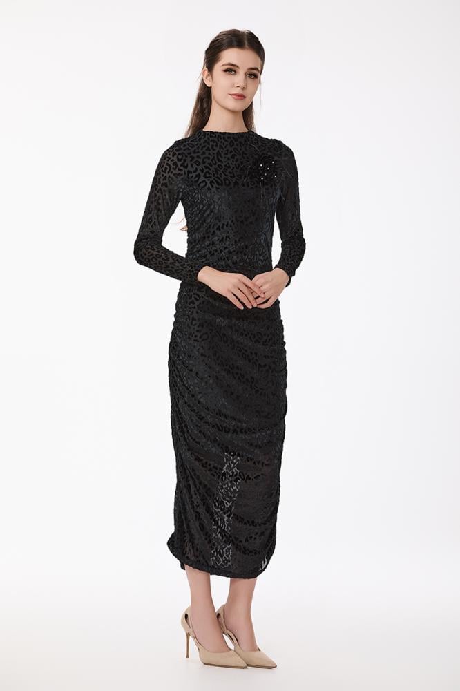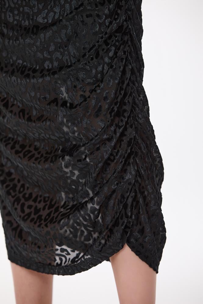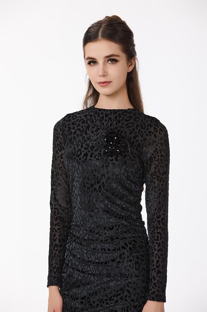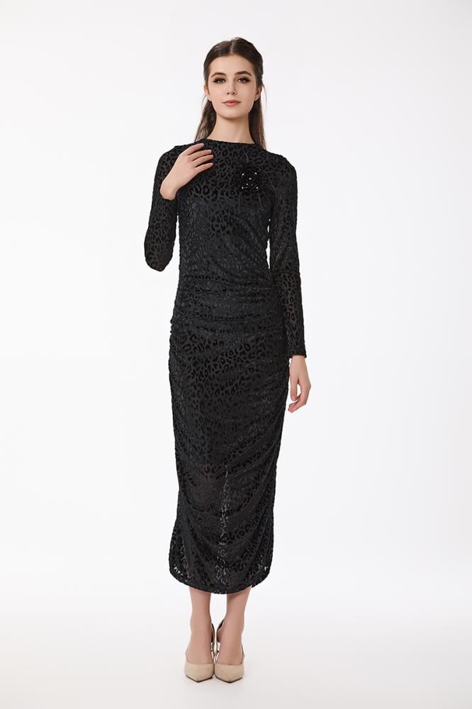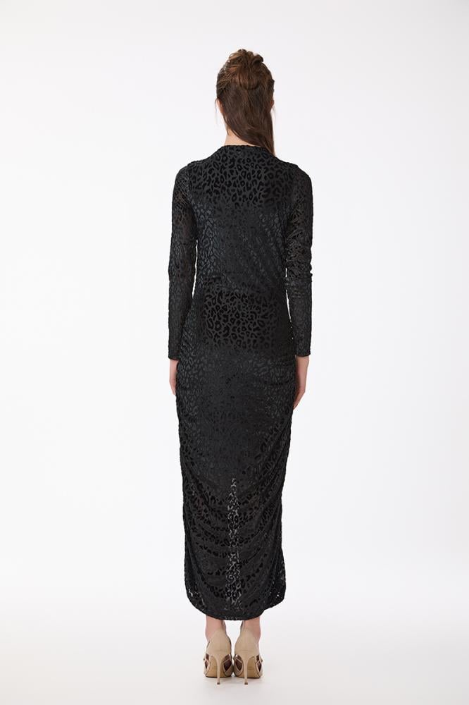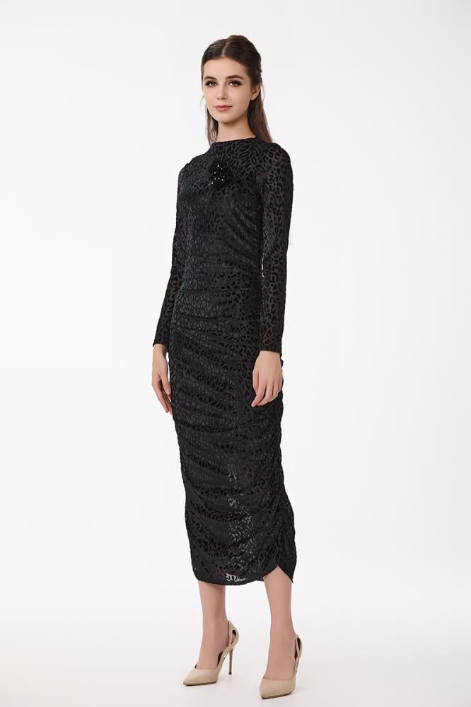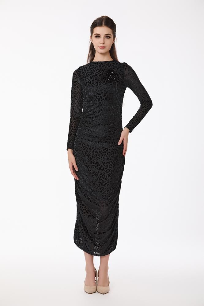 • فستان تول استرتش لون اسود نقشة الفهد بثنيات ناعمة مع اكمام طويلة وقصة ماسكة