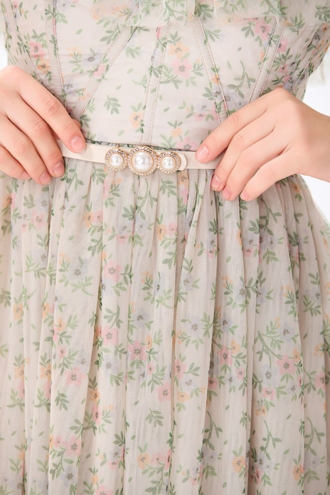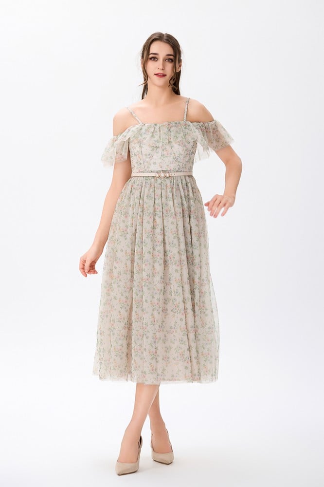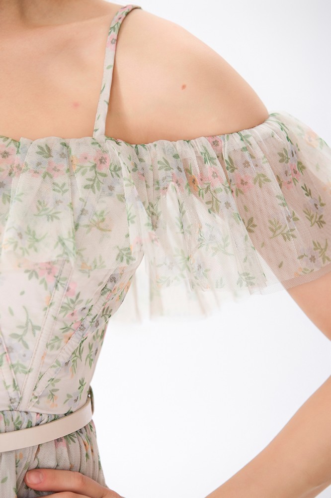 فستان تول بيج بنقشة الزهور الملونة قصة كروسية على الصدر مع كشكش على الزراع تنورة كلوش بثنيات ناعمة مع حزام مميز على الخصر