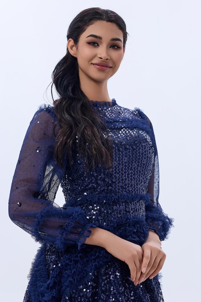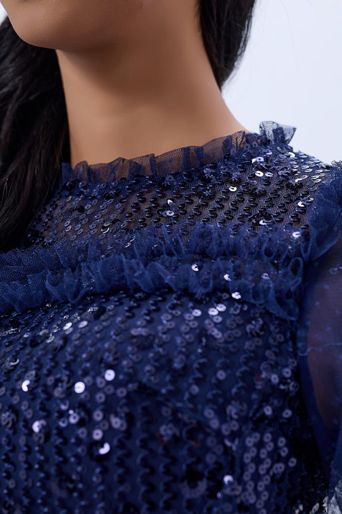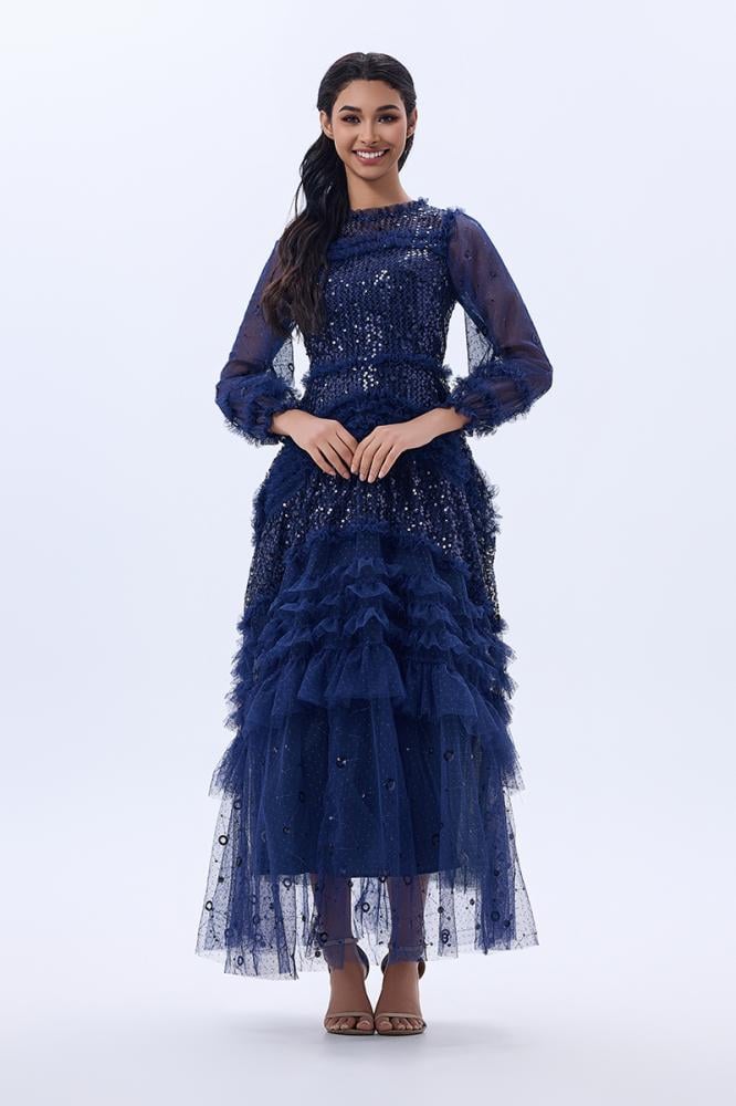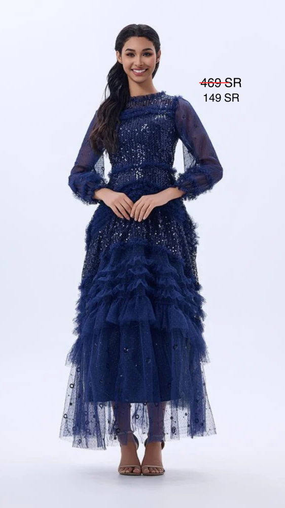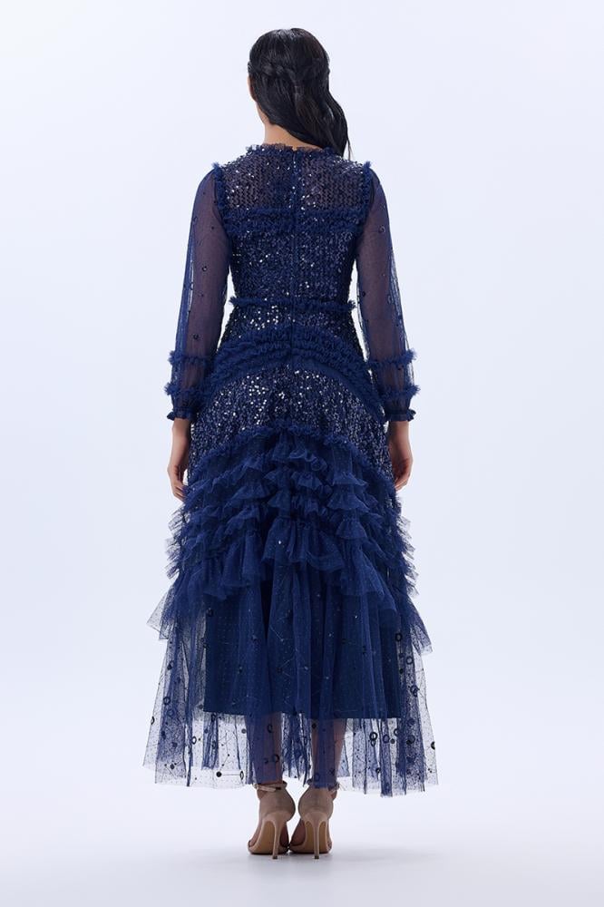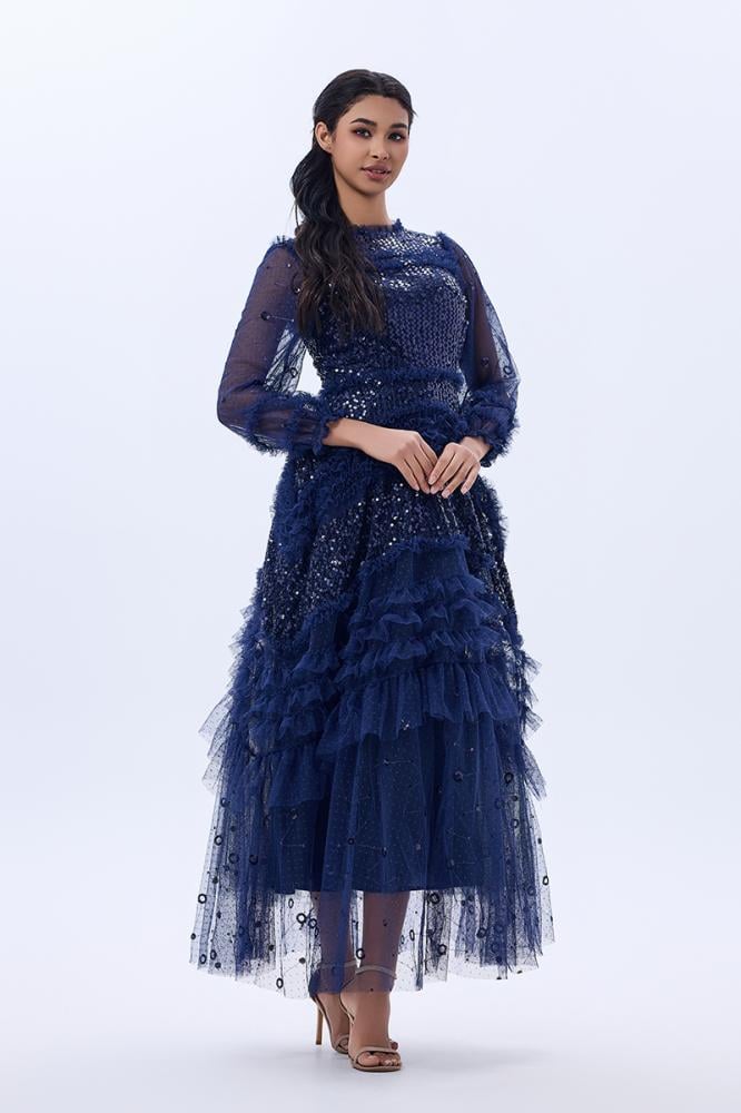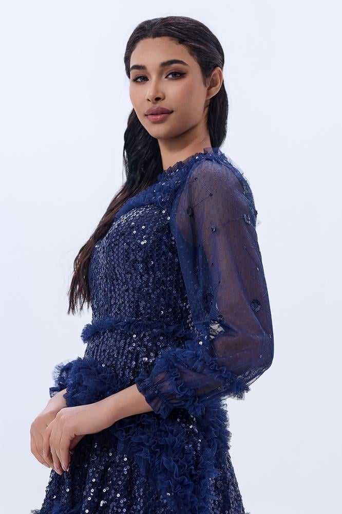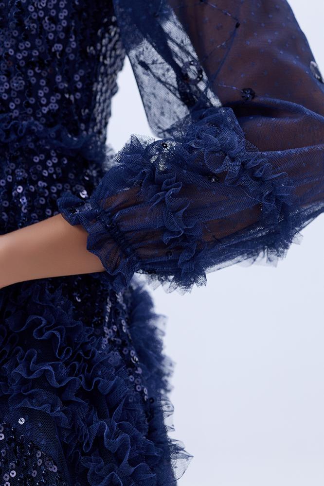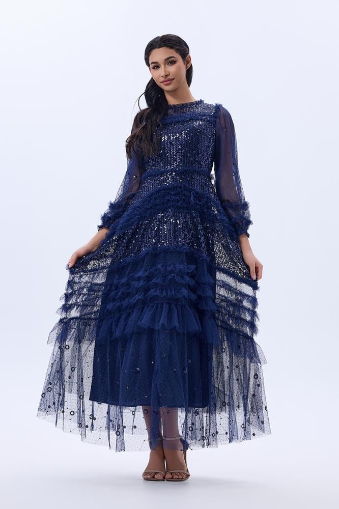 فستان كلوش تول كحلي مع ترتر بطبقات كشكش غنية و بتصميم ساتر