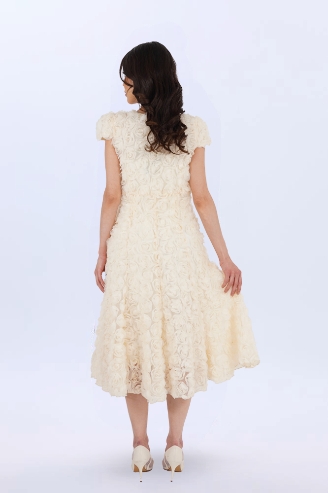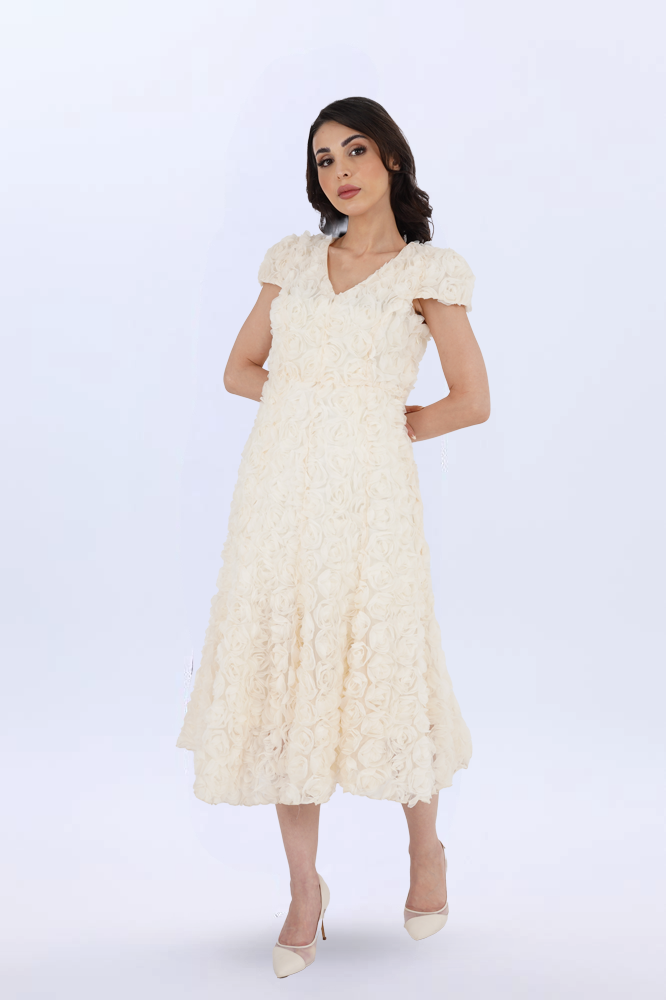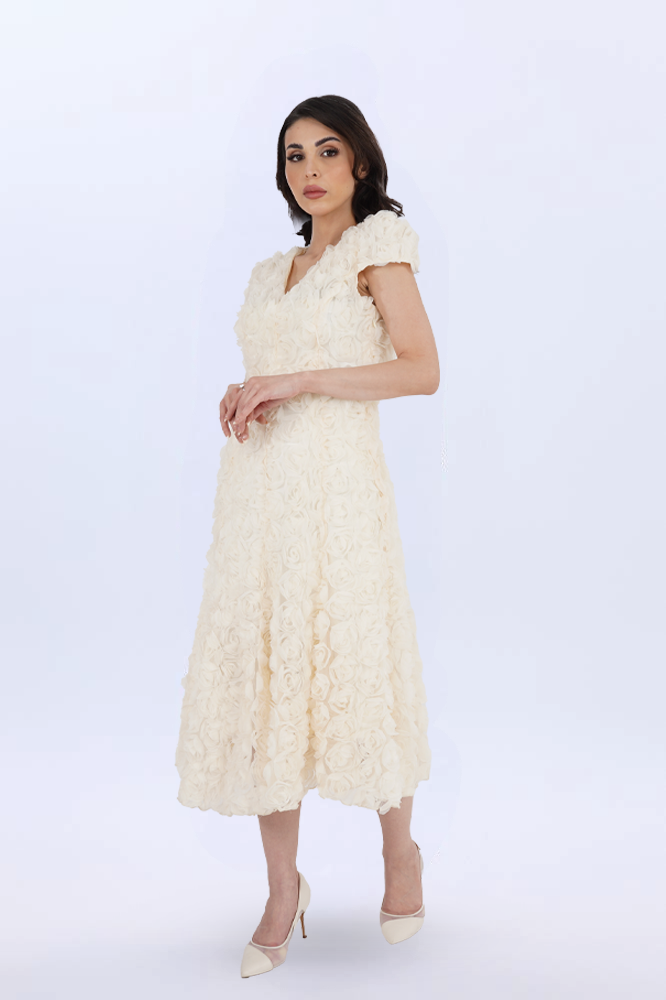 فستان كلوش تول ورد بيج بقصة كلاسيكية واكمام قصيرة ساترة