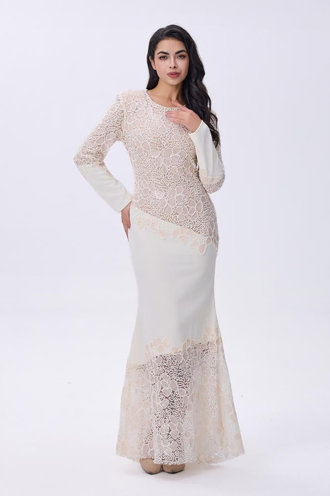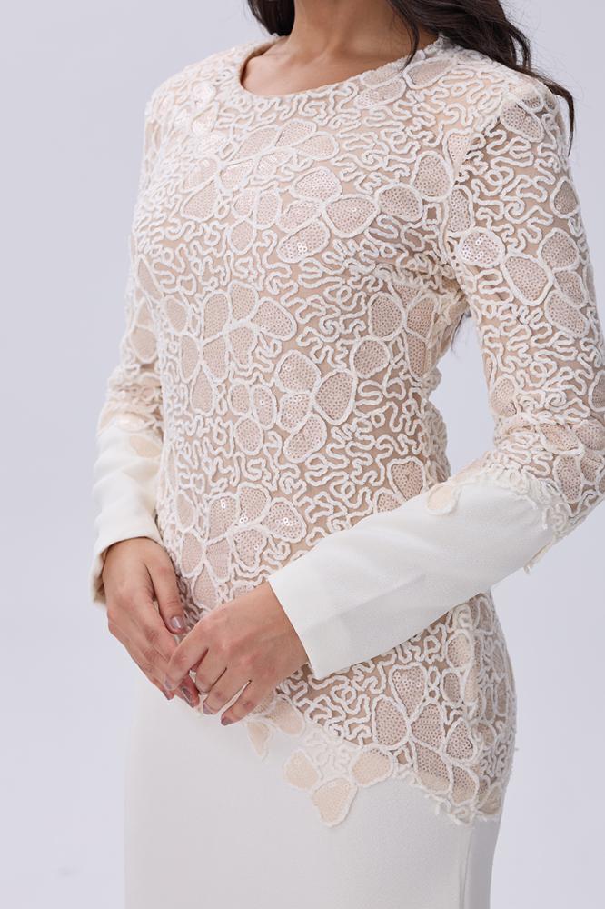 تألّقي بإطلالة راقية وأنثوية مع فستان دانتيل أوف وايت أنيق يجمع بين الفخامة والنعومة في تصميم واحد. يتميز الفستان بقماش دانتيل فاخر بنقوش زهرية فريدة بالكرستالات تغطي الجزء العلوي وتنتهي بتفاصيل شفافة في الأطراف تمنحك لمسة من الرقي والجاذبية.