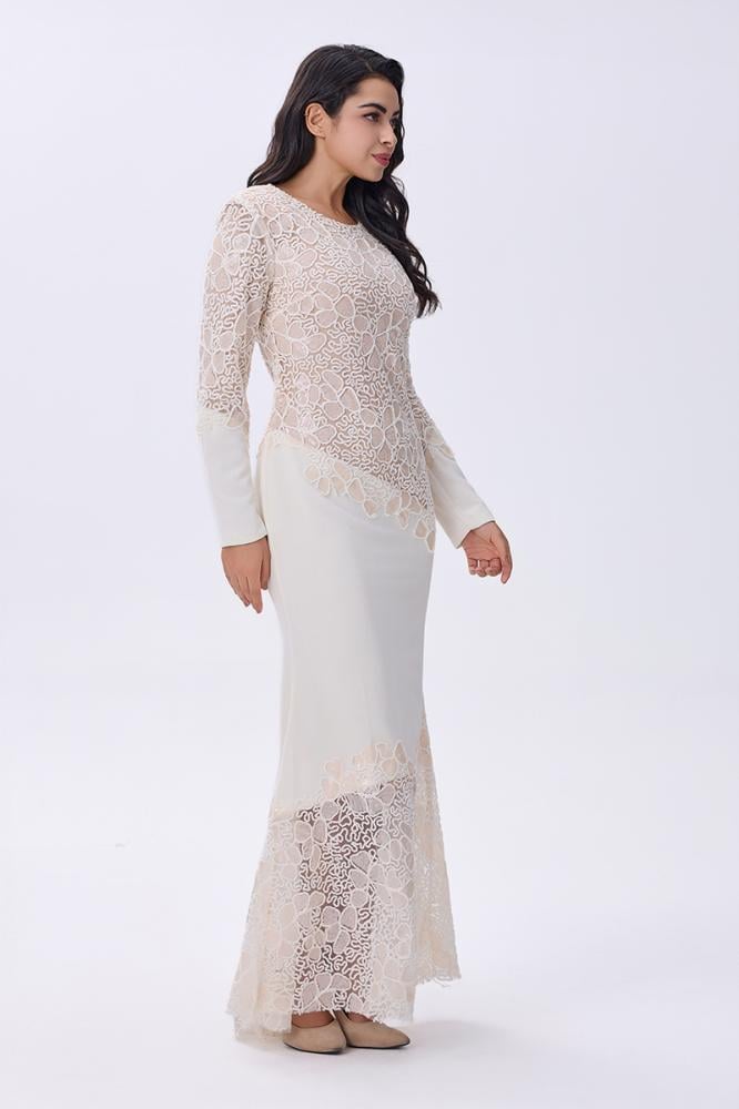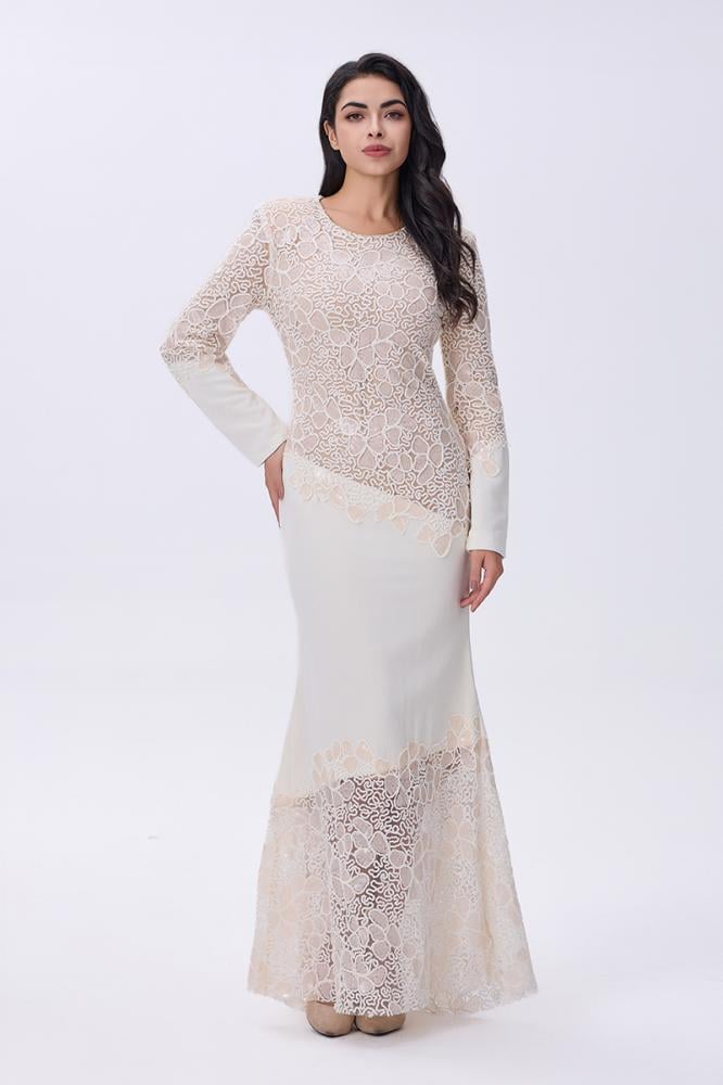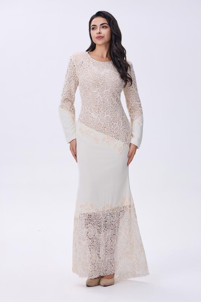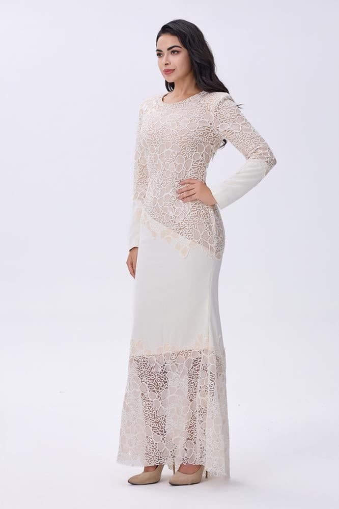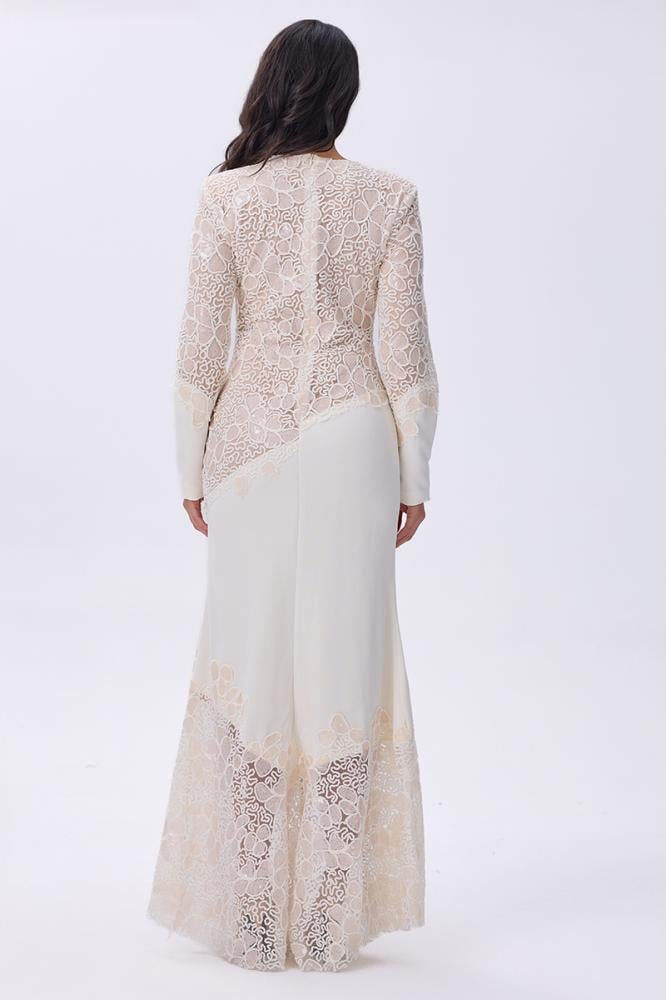 فستان دانتيل أوف وايت طويل بأكمام طويلة