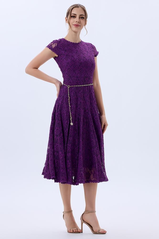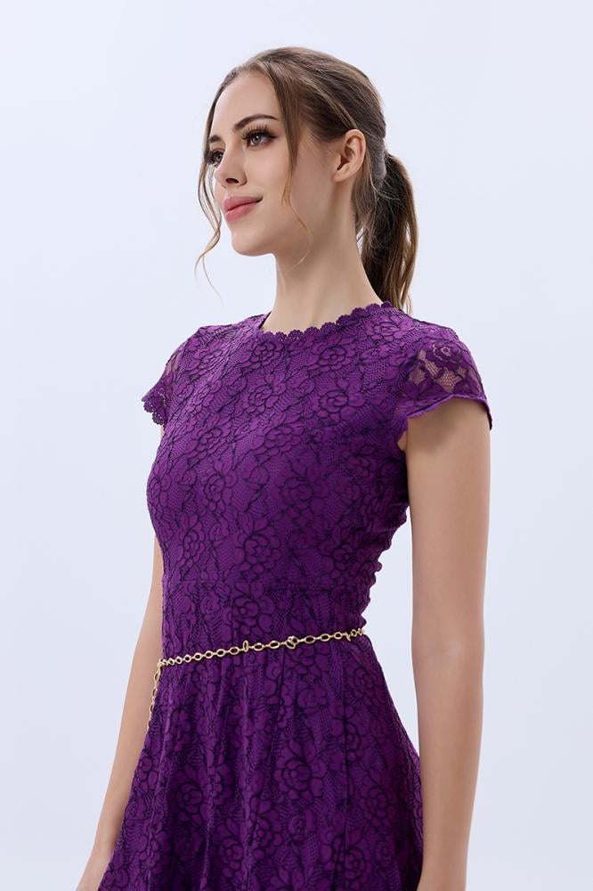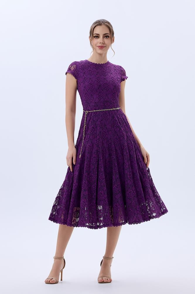 فستان دانتيل كلاسيكي بنفسجي باكمام ساترة الزند وتنورة كلوش غنية مع حزام معدني لتحديد الخصر