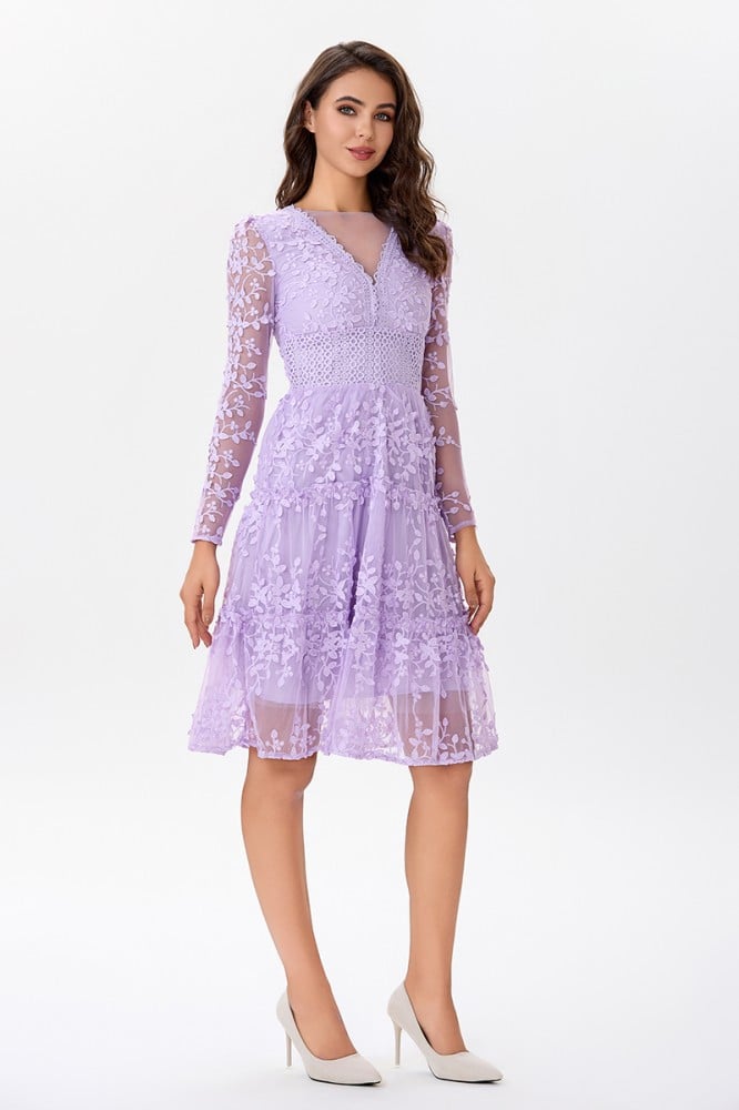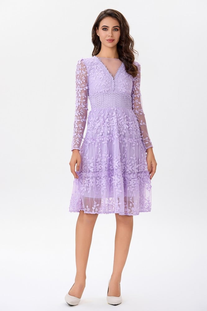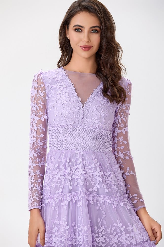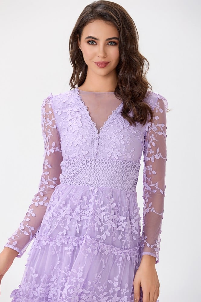 فستان دانتيل ليلكي مفتوح على الصدر مع تول مزبن بكلف من الغيبور قصة كلاسيكيةالخامة دانتيل : غير قابلة للتمددسماكة النسيج : خفيفةدليل المقاسات