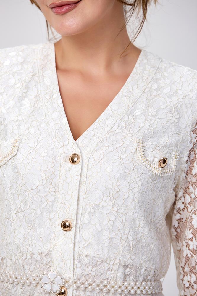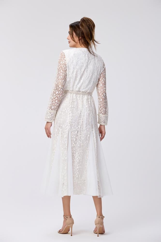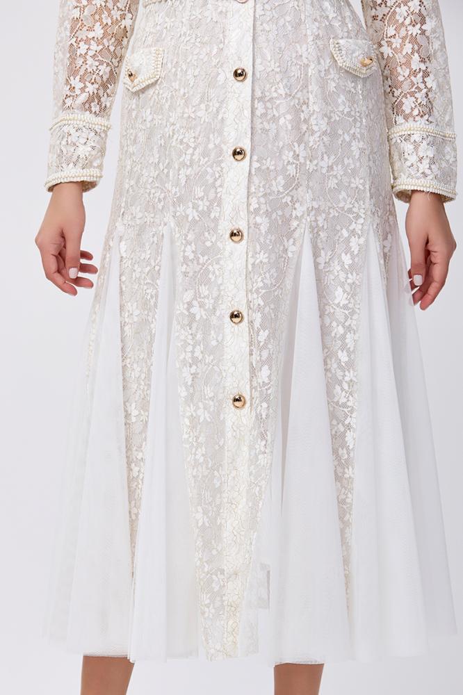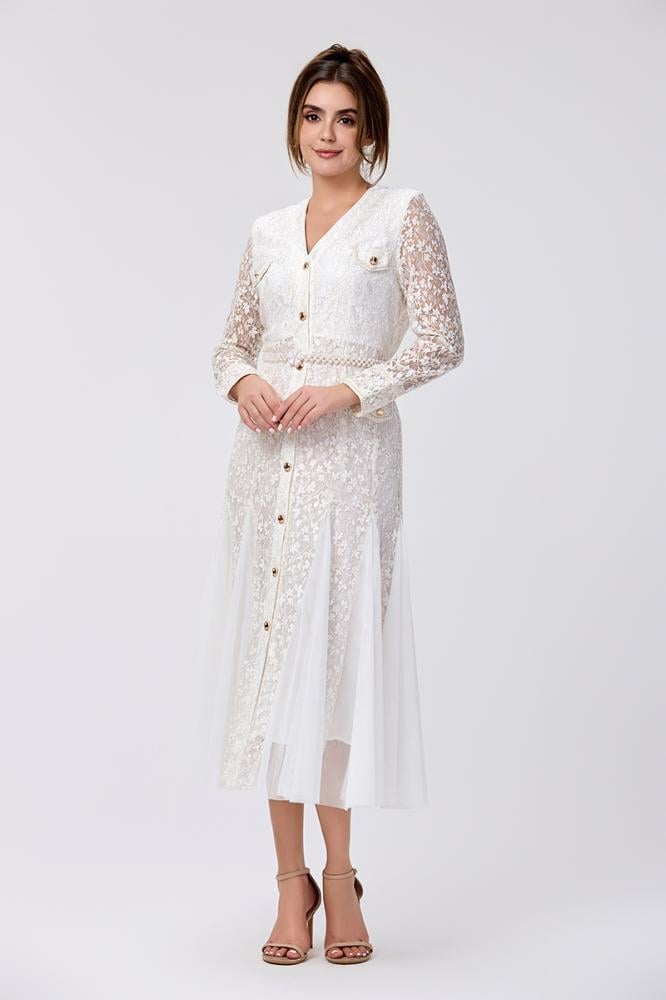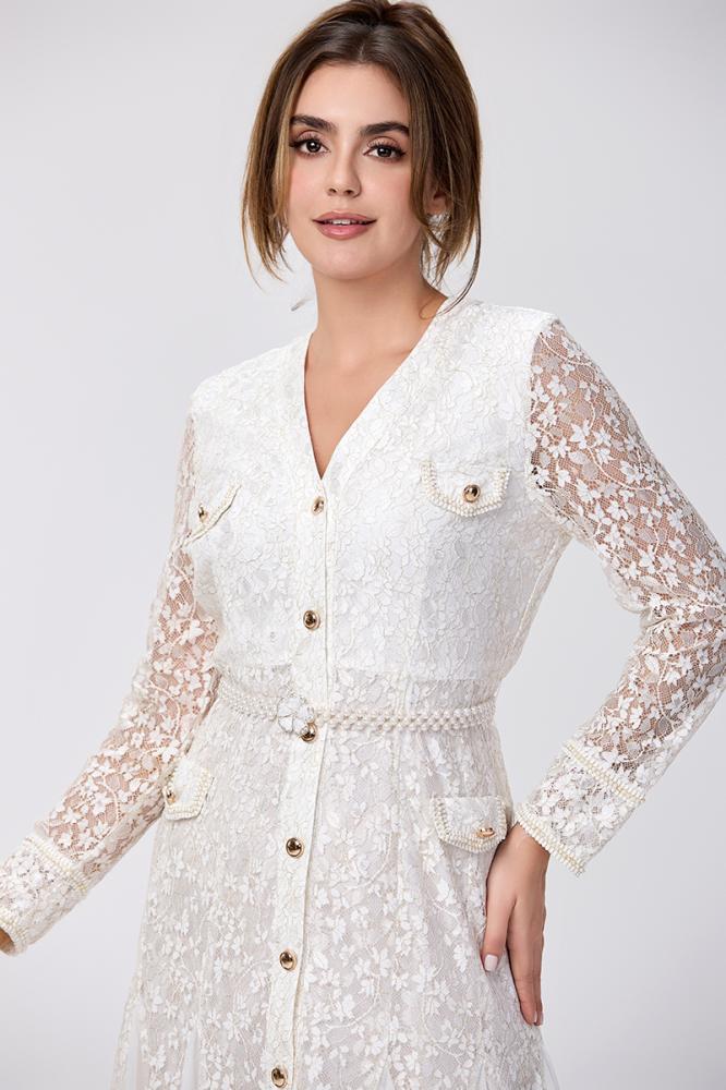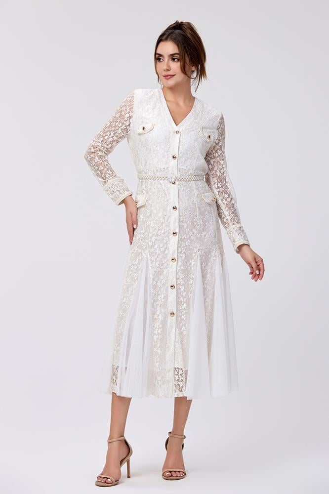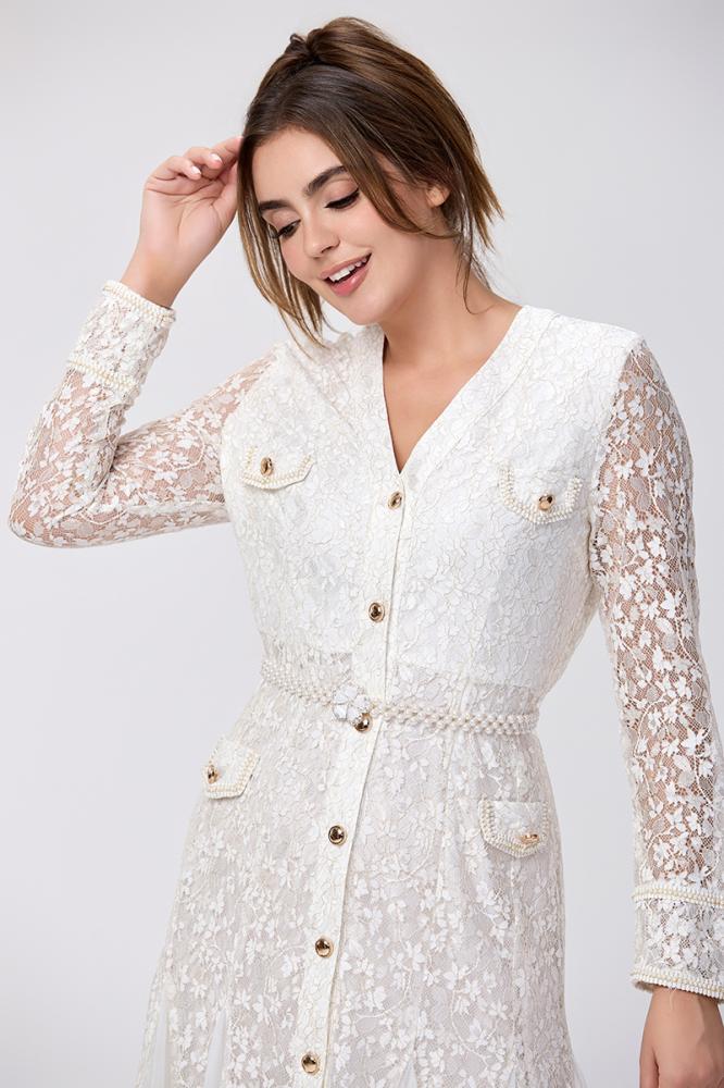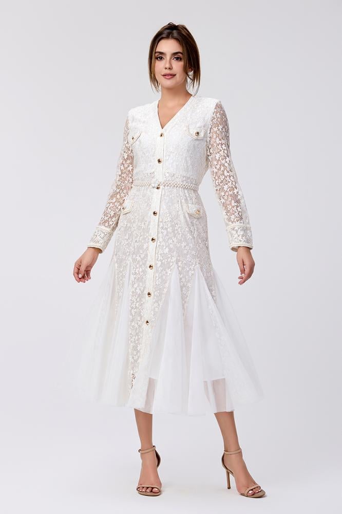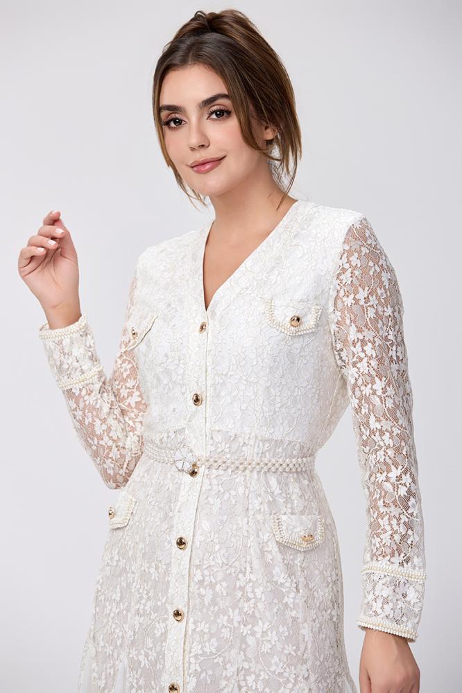 فستان دانتيل اوف وايت مع كلف الؤلؤ ياقة سبعة مع ازرار ذهبية على طول وسط الفستان مع أكمام طويلة وتنورة بقصة مريحة بقصات كلوش مع الأورغنزا