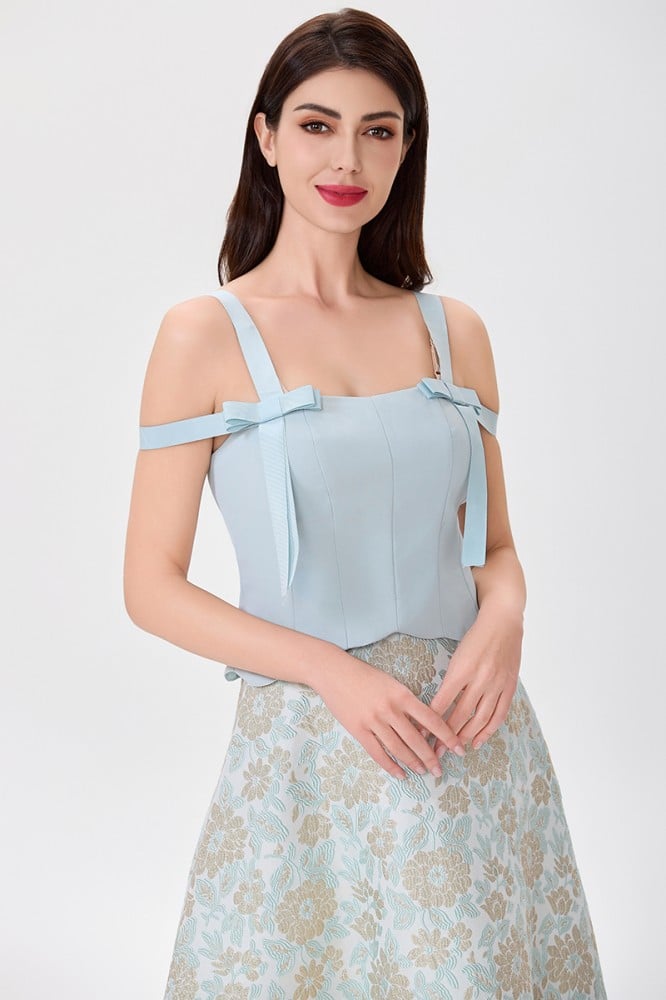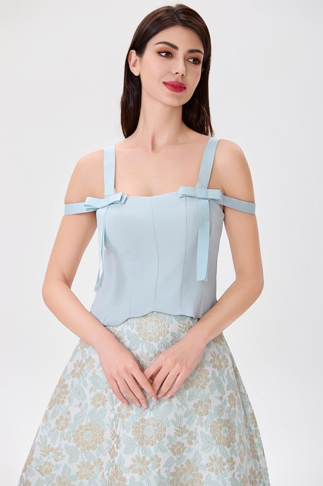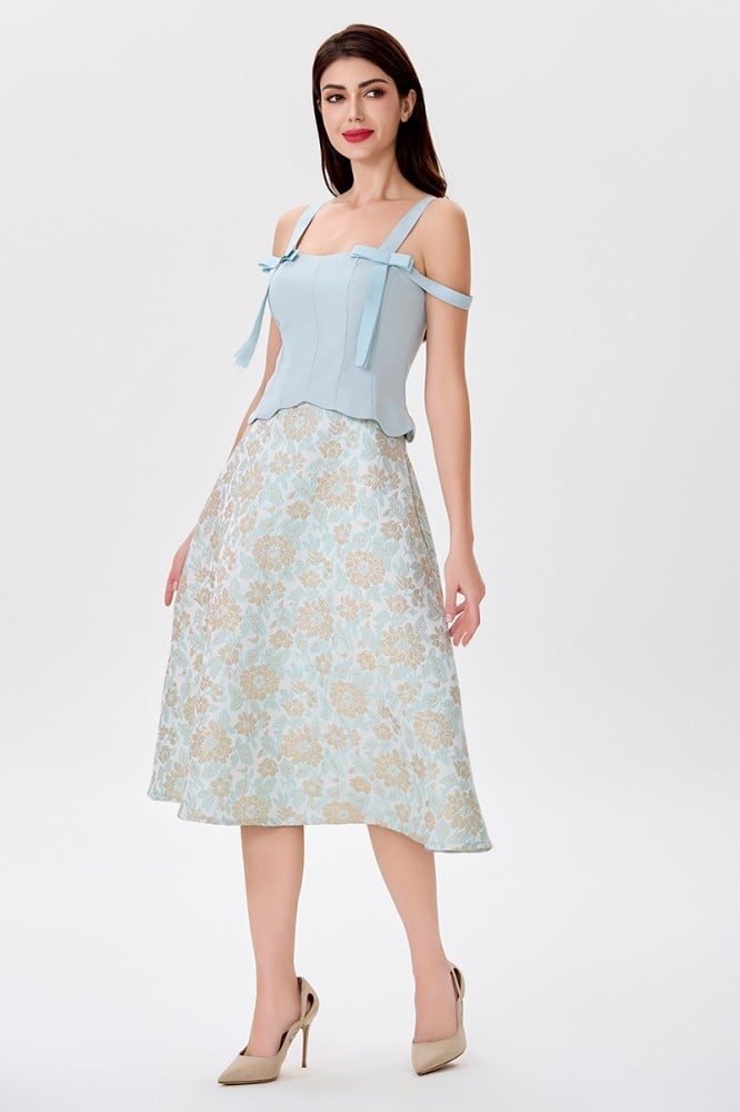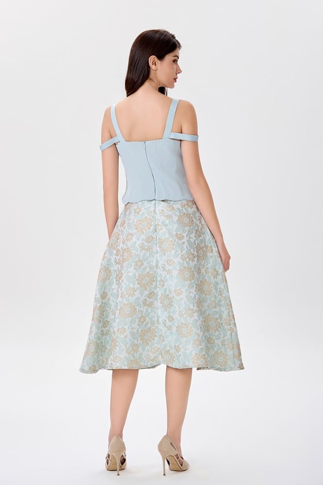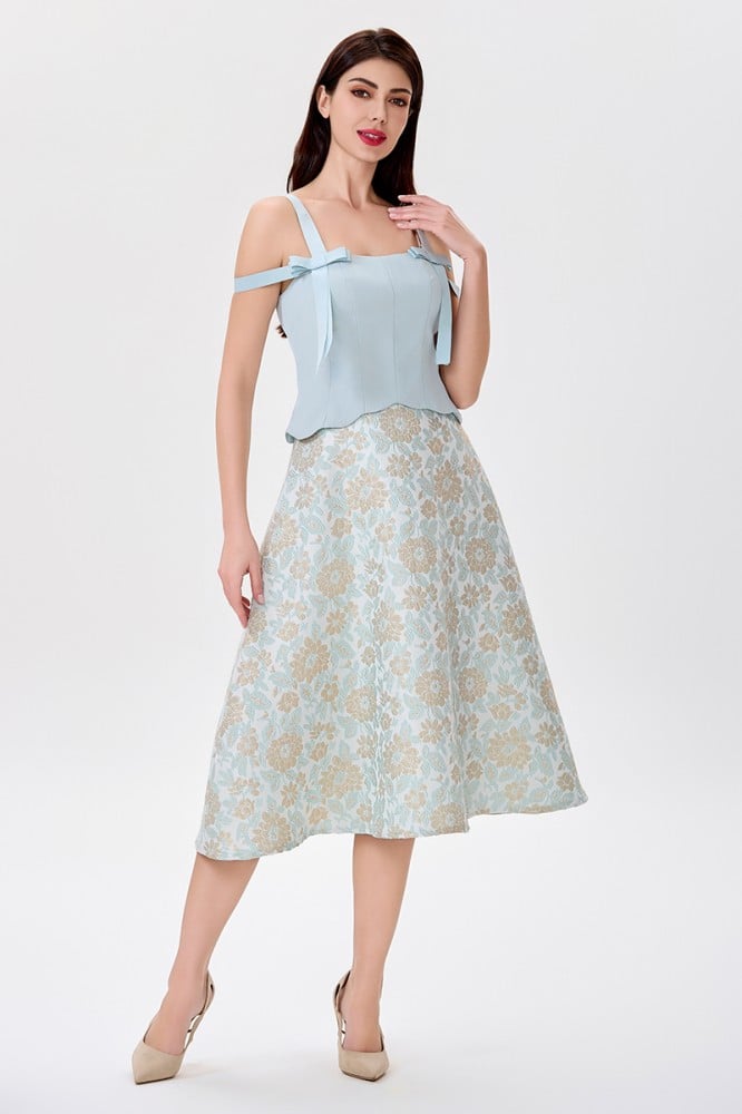 فستان ستان برو كارد كورسية ازرق هادئ بقصة مميزة على الطرف مع تنورة برو كارد بطبعة الورود الذهبية والزرقاء قصة كلوش ناعمةالخامة ستان : غير قابلة للتمددسماكة النسيج : متوسطةدليل المقاسات