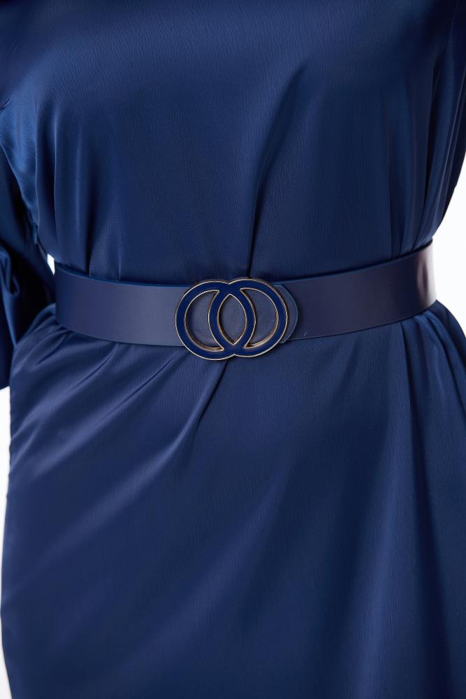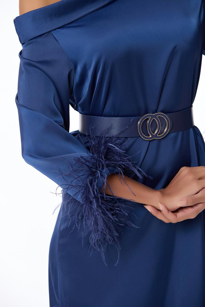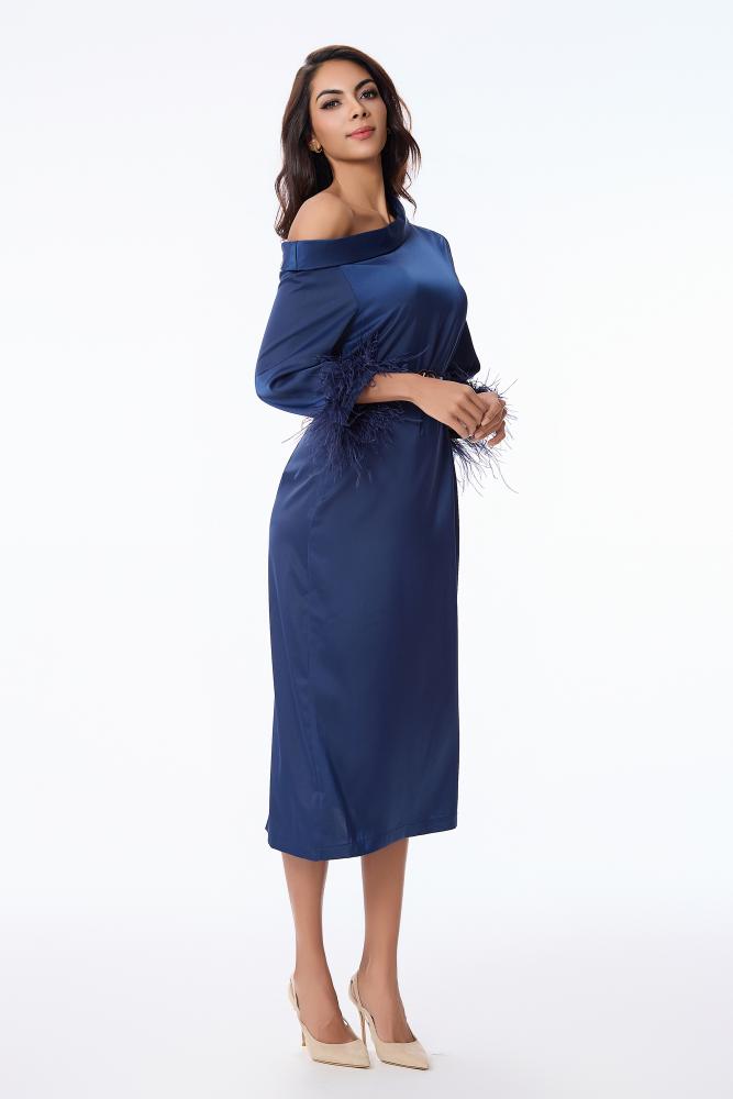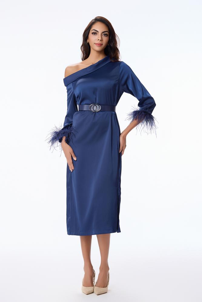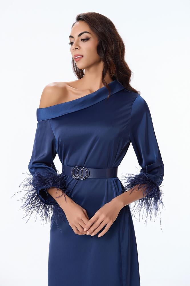 فستان ستان كحلي بكتف روماني مع اكمام طويلة بطرف ريش وتصميم مريح مع حزام لتحديد الخصر