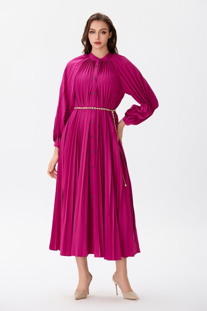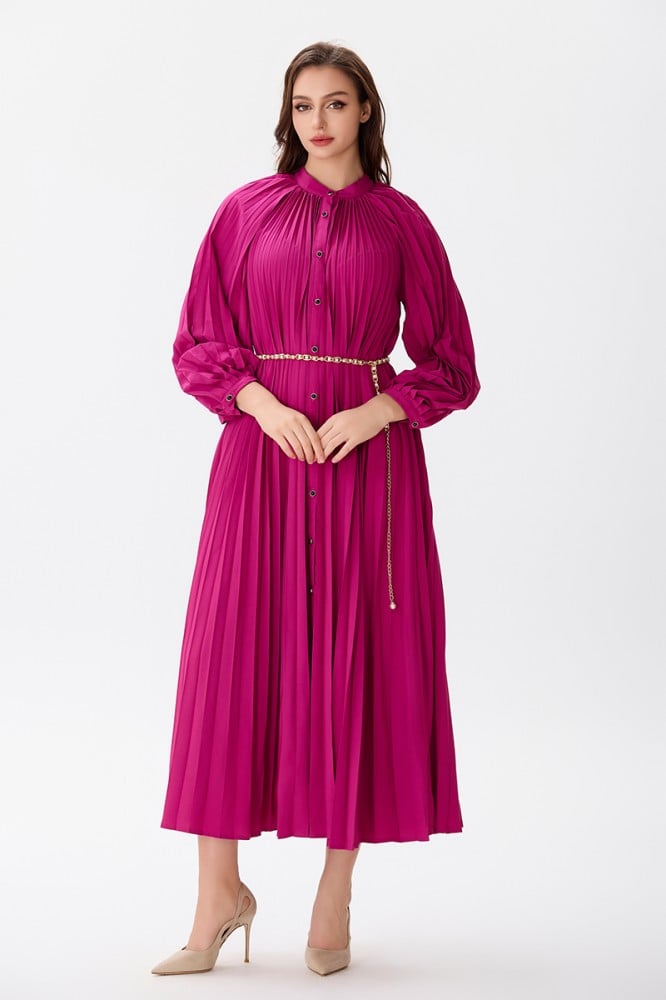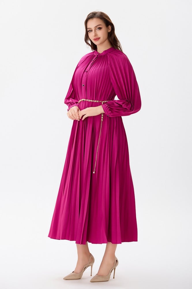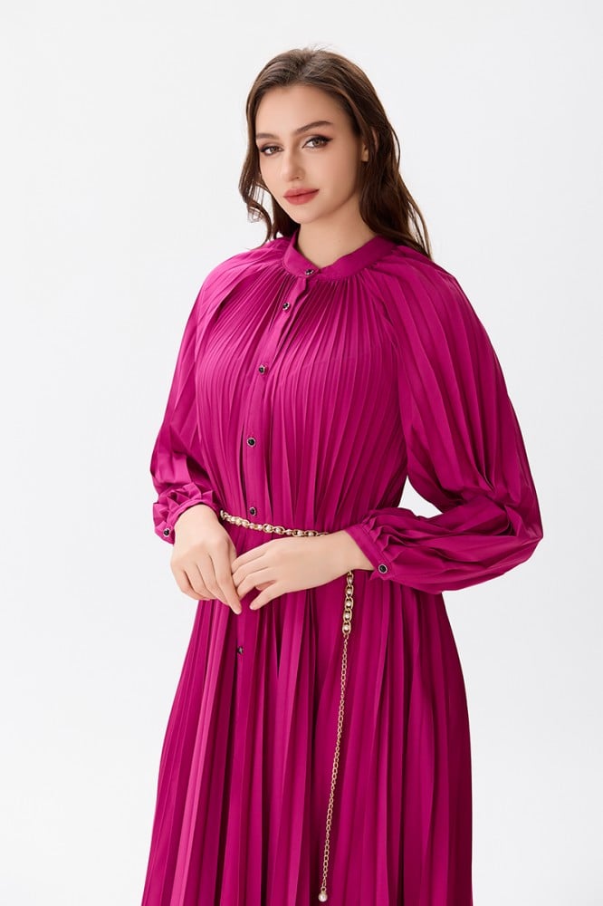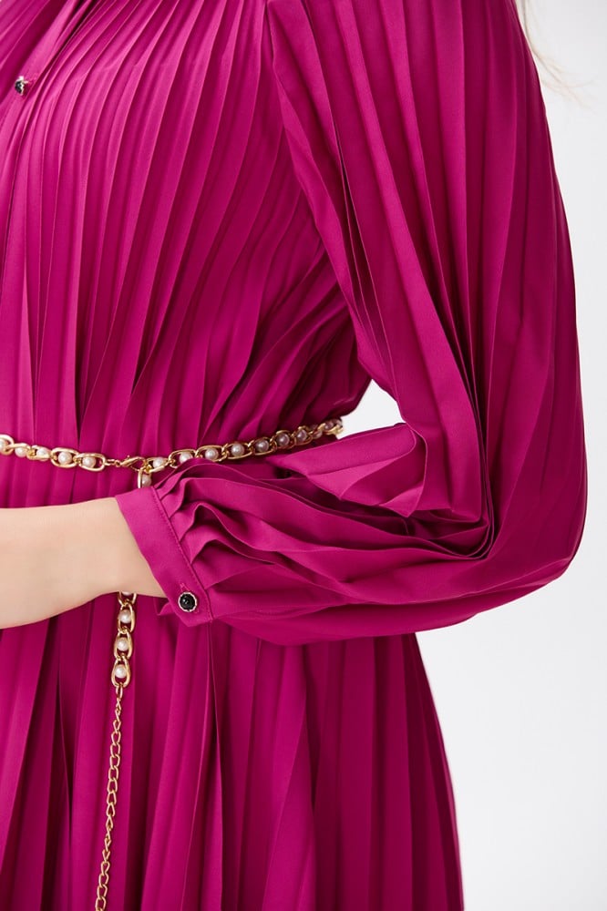 فستان الستان البليسية باللون الفوشي يُجسّد الأناقة والرقي بتصميمه العصري الفضفاض الذي يتماشى مع أحدث صيحات الموضة.
