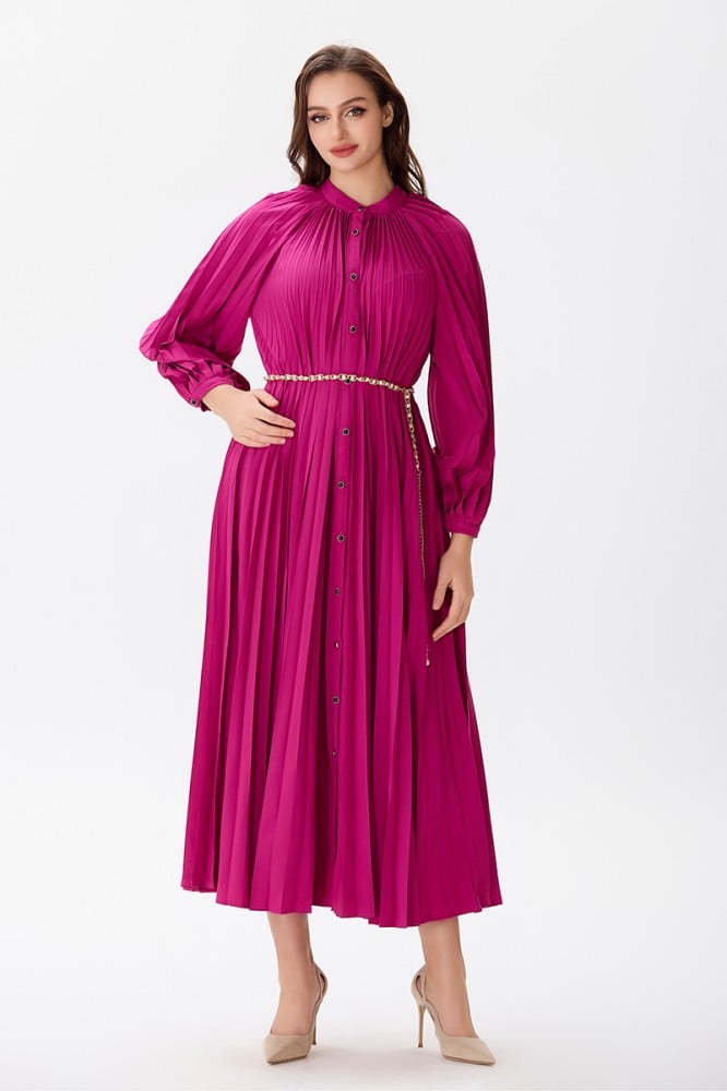 يتميز الفستان بلون فوشي زاهي، الذي يضفي لمسة من الجمال والجاذبية. يعتبر اللون الفوشي خيارًا مثاليًا لمظهر أنثوي ومميز، ويجعل الفستان ملائمًا للمناسبات المختلفة.