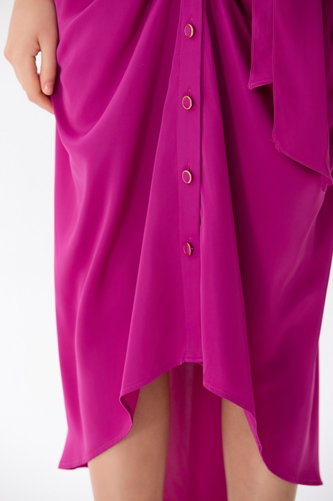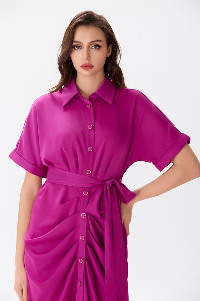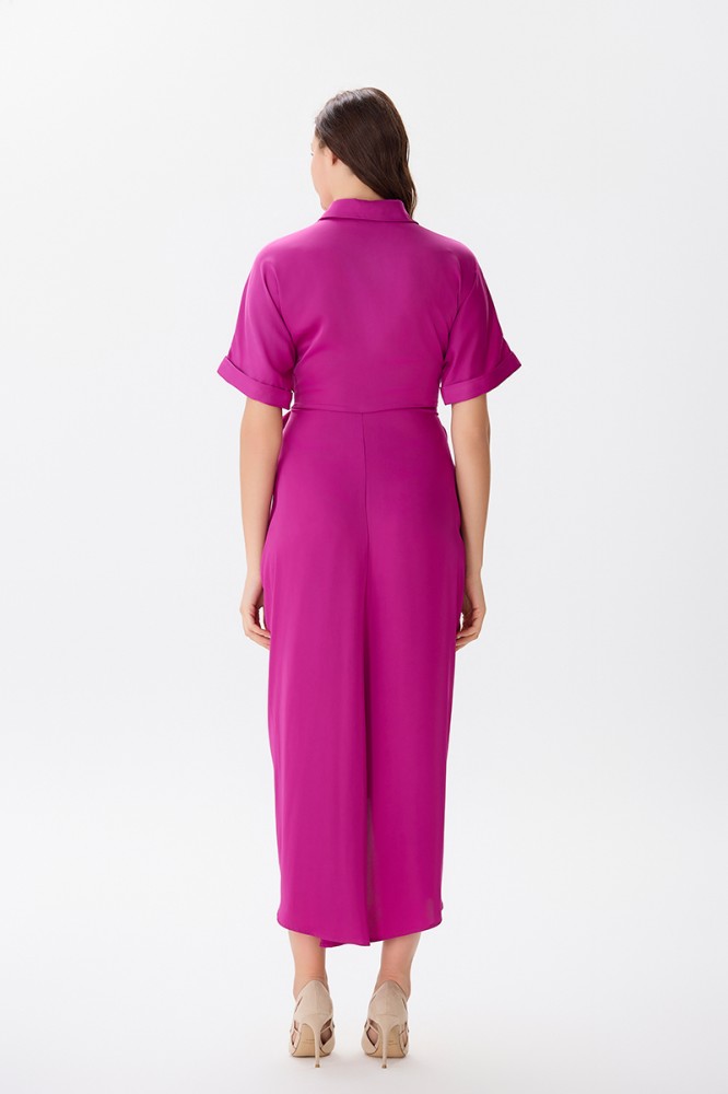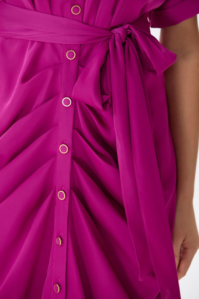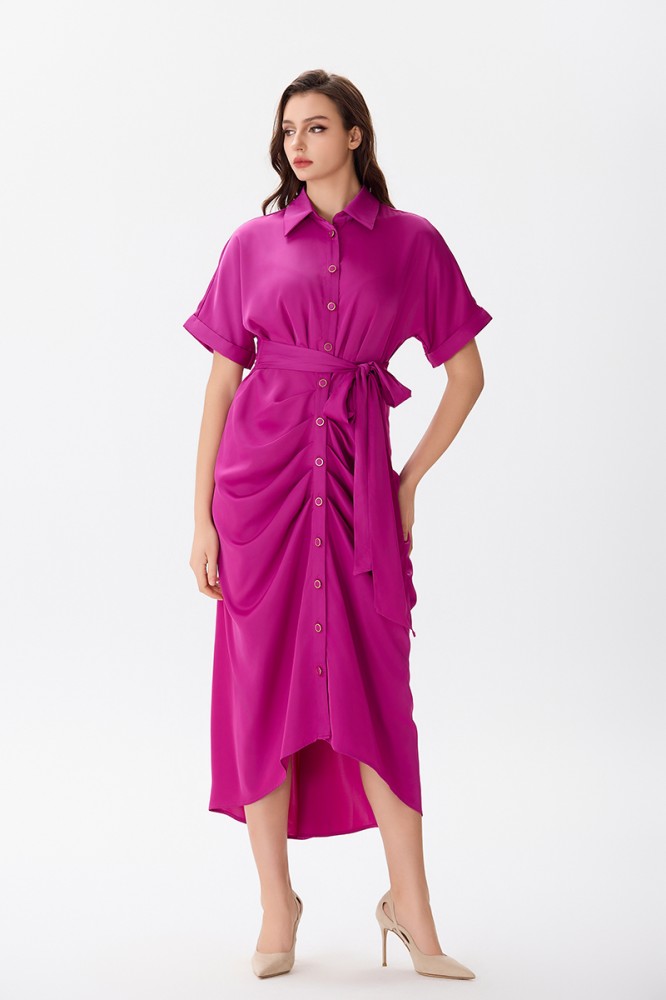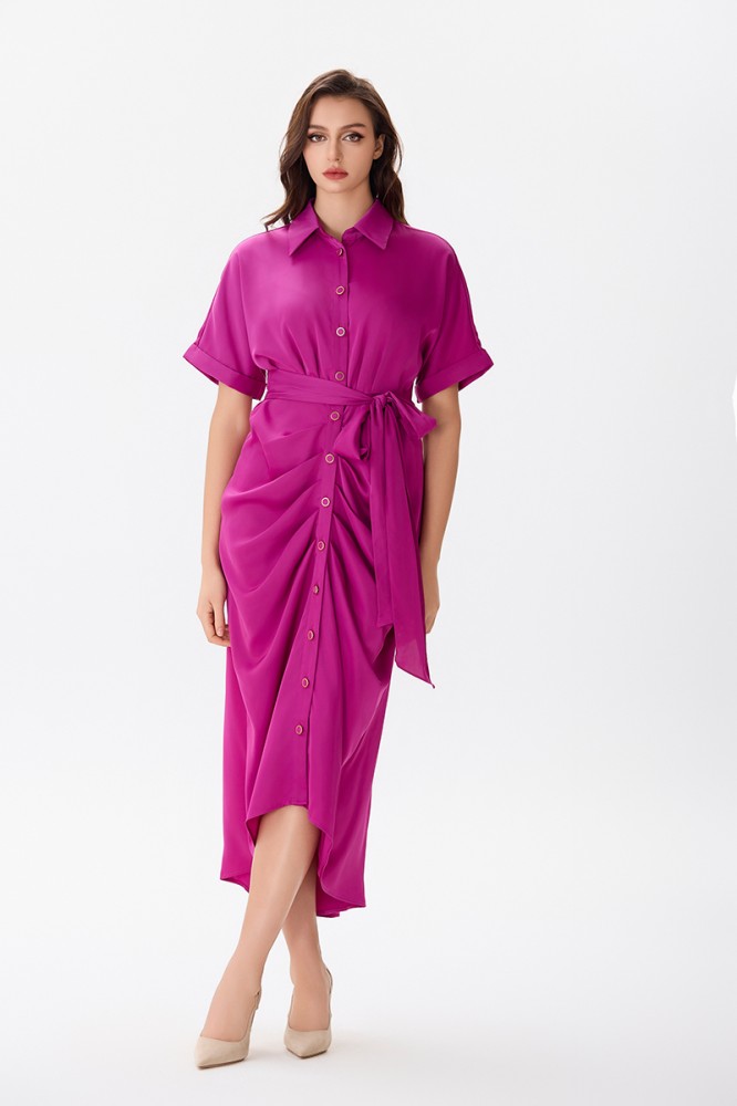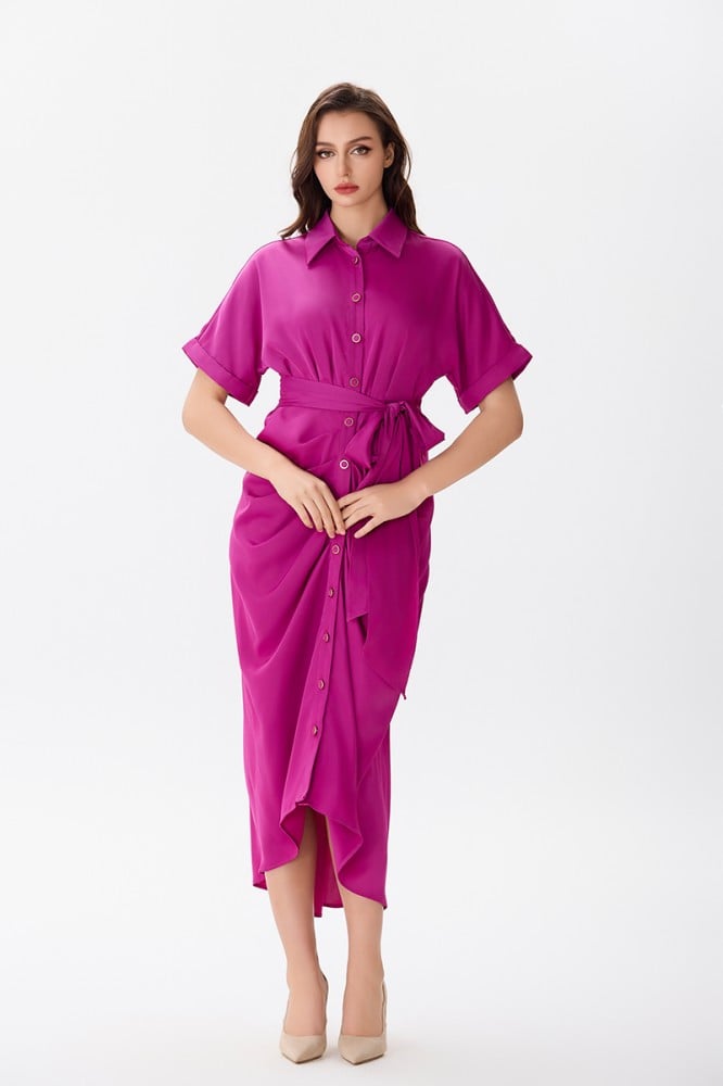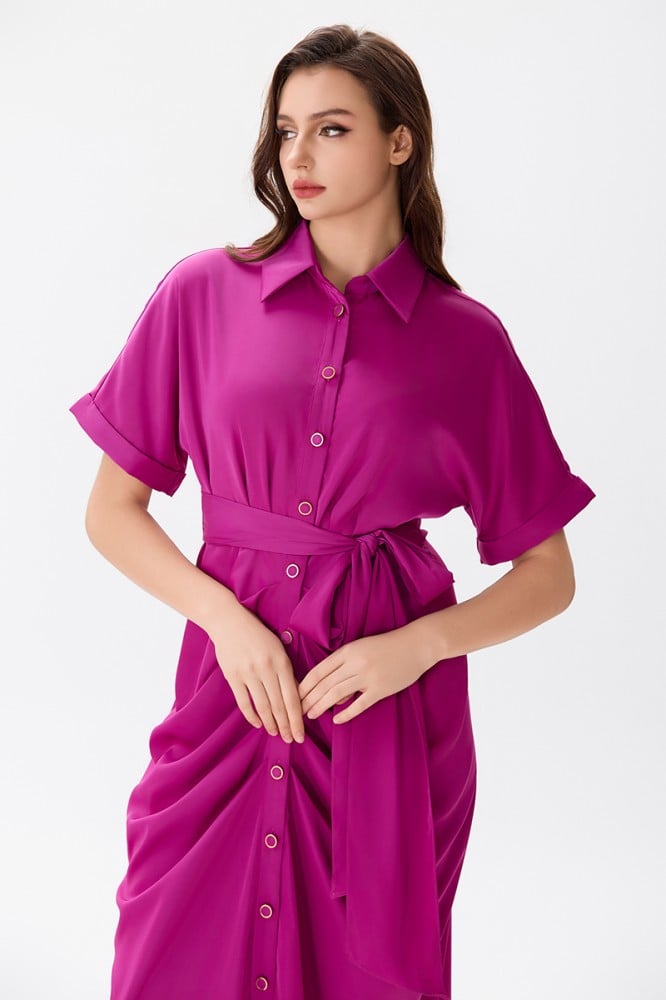 باختصار، يجمع فستان الستان الفوشيا بياقته الكلاسيكية وأزرار الوسط المميزة مع ثنيات ناعمة وأكمام قصيرة لتقديم إطلالة عصرية وأنيقة تتألق بلمسات فاخرة وأنوثية.