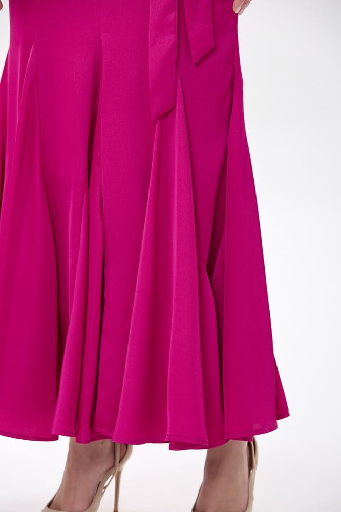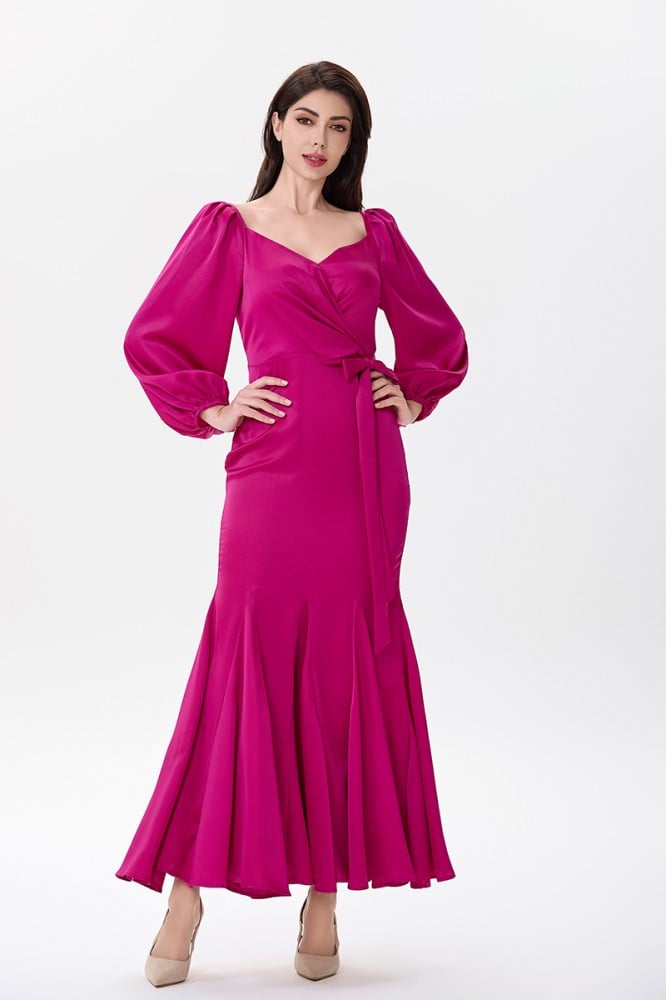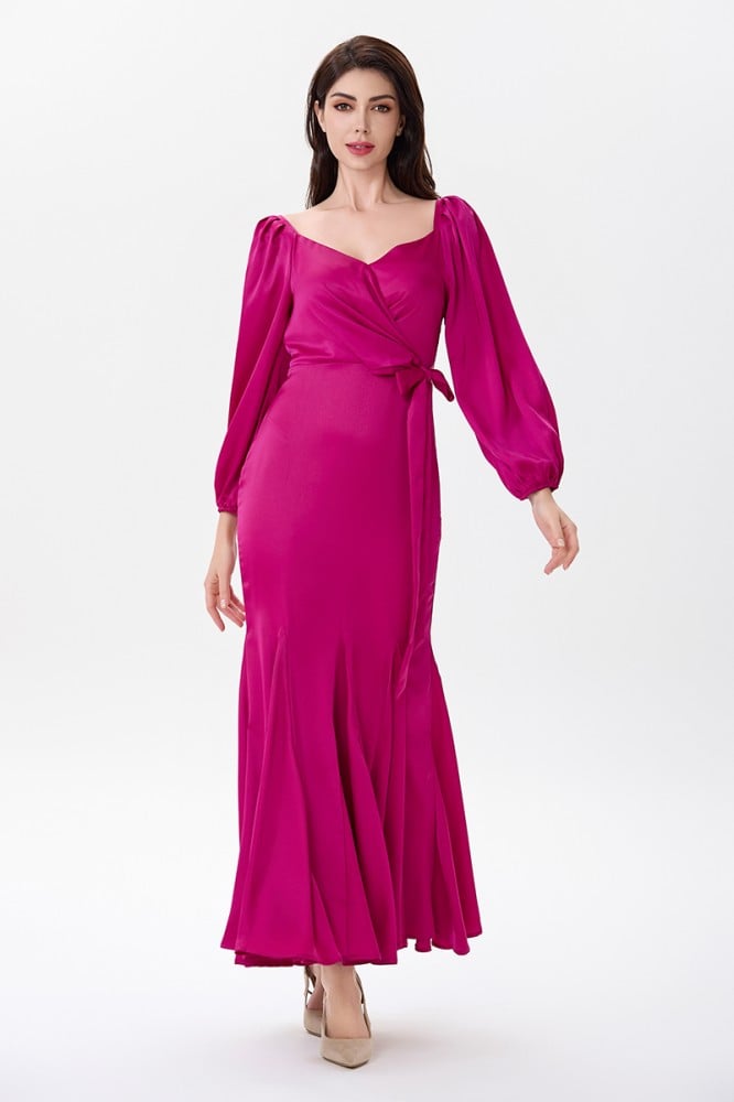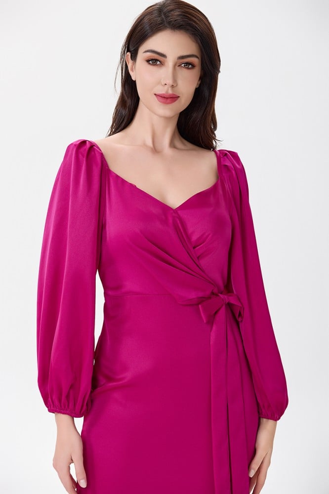 فستان ستان فوشيا قصة صدر مزدوجة مع ثنيات ناعمة ورباط جانبي على الخصر قصة تنورة بطرف كلوش من الاسفل