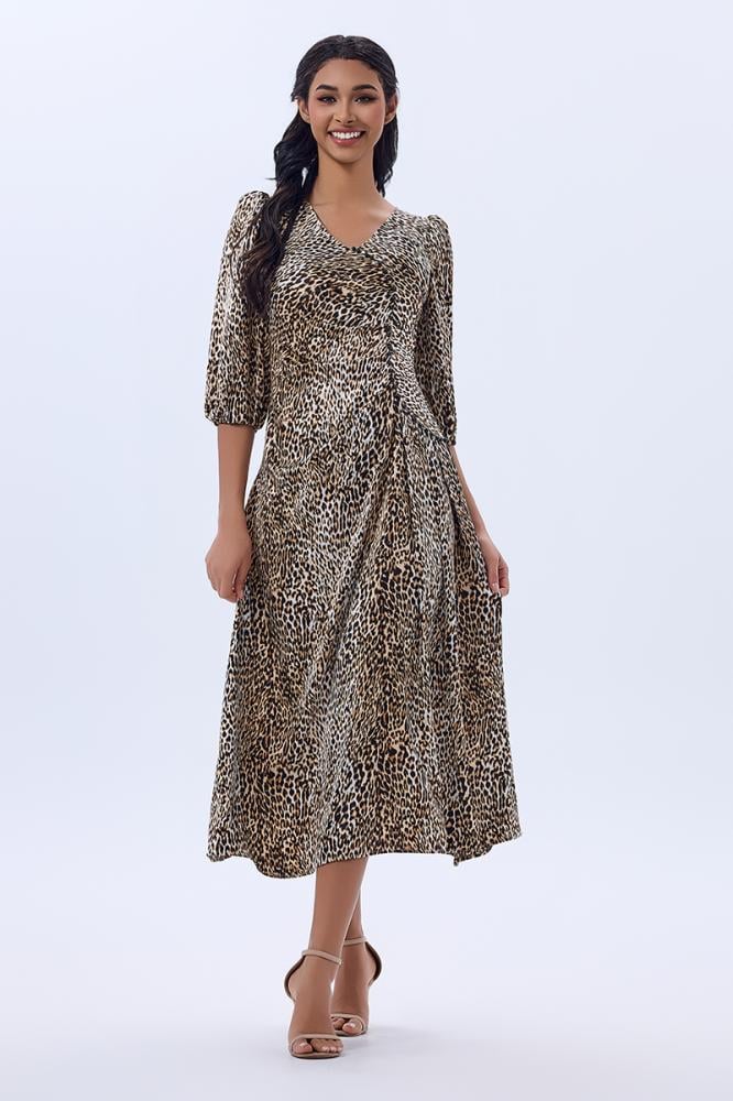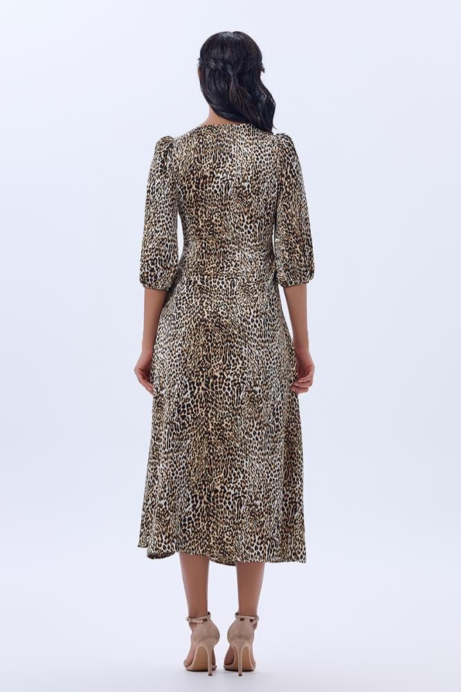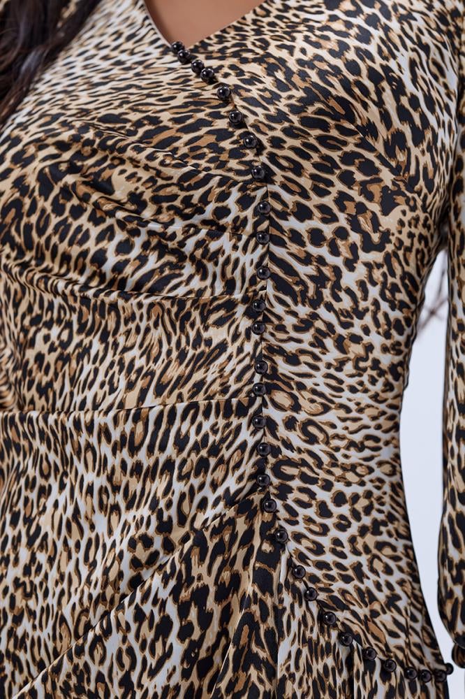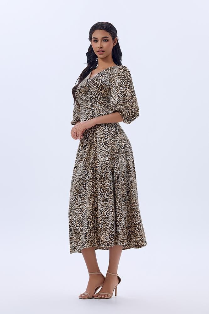 • فستان ستان بنقشة الفهد بثنيات غنية و قصة جانبية محددة بالؤلؤ الاسود