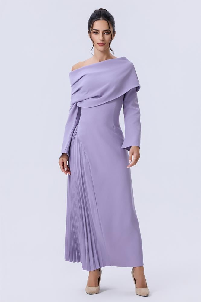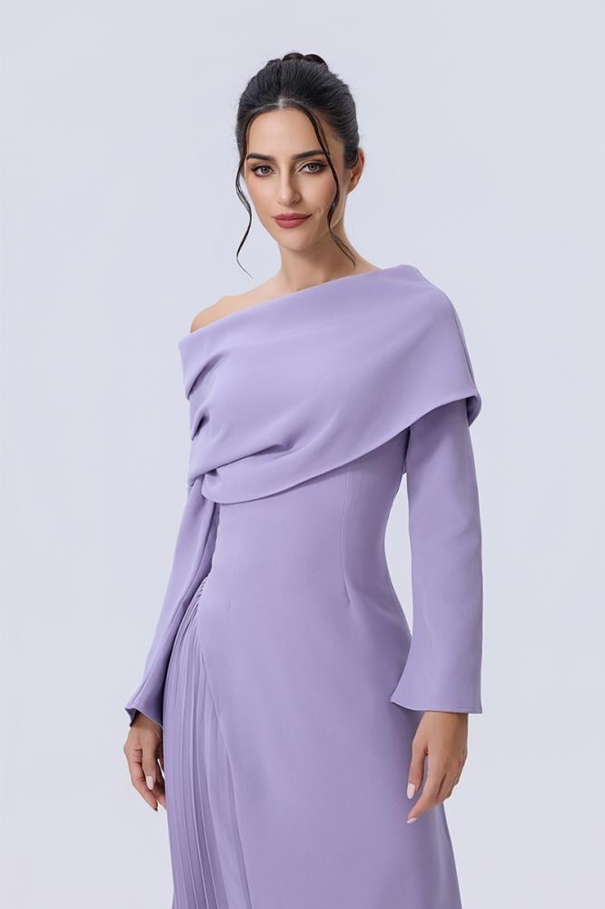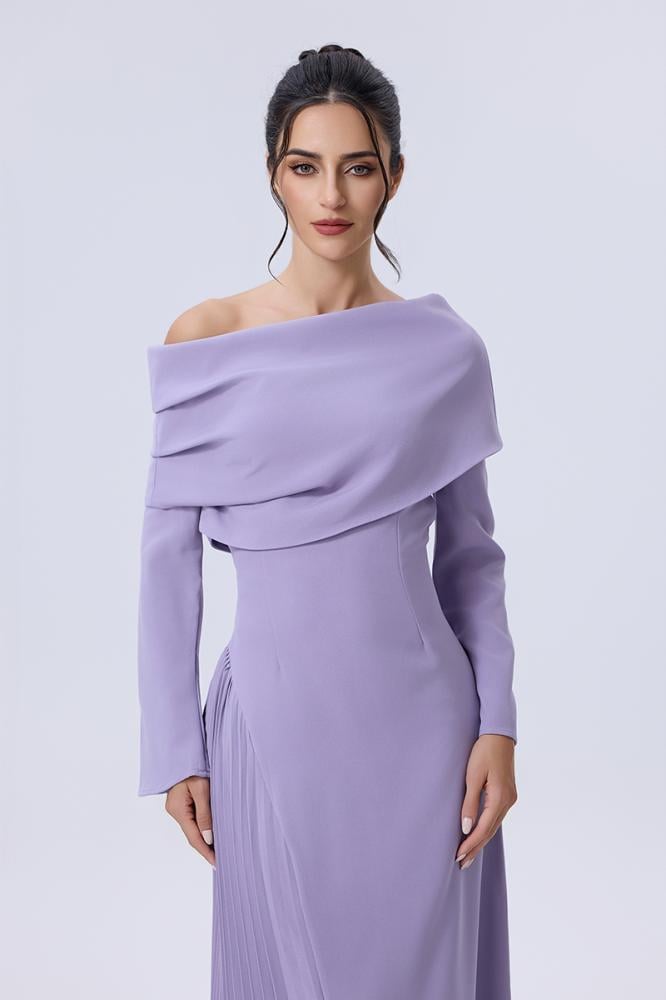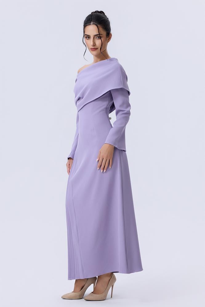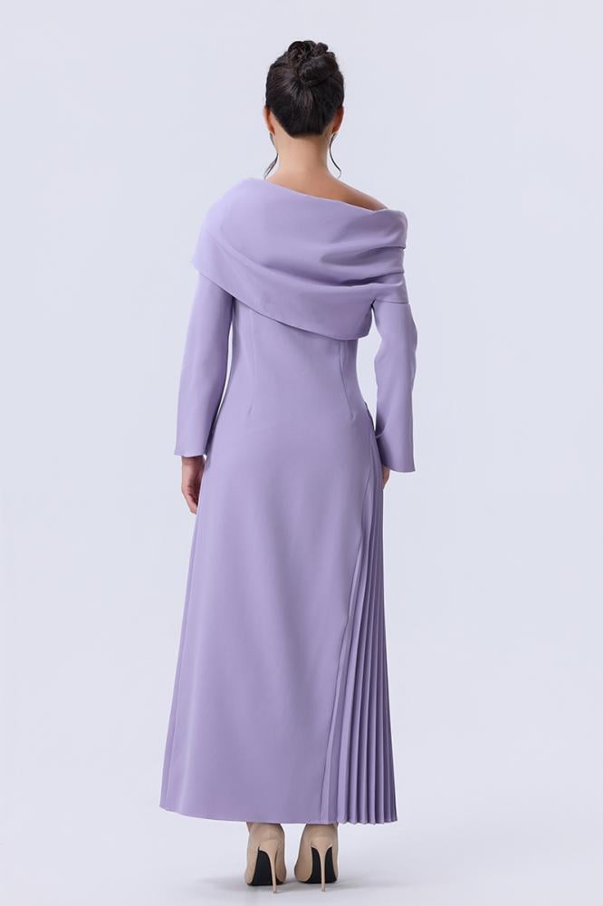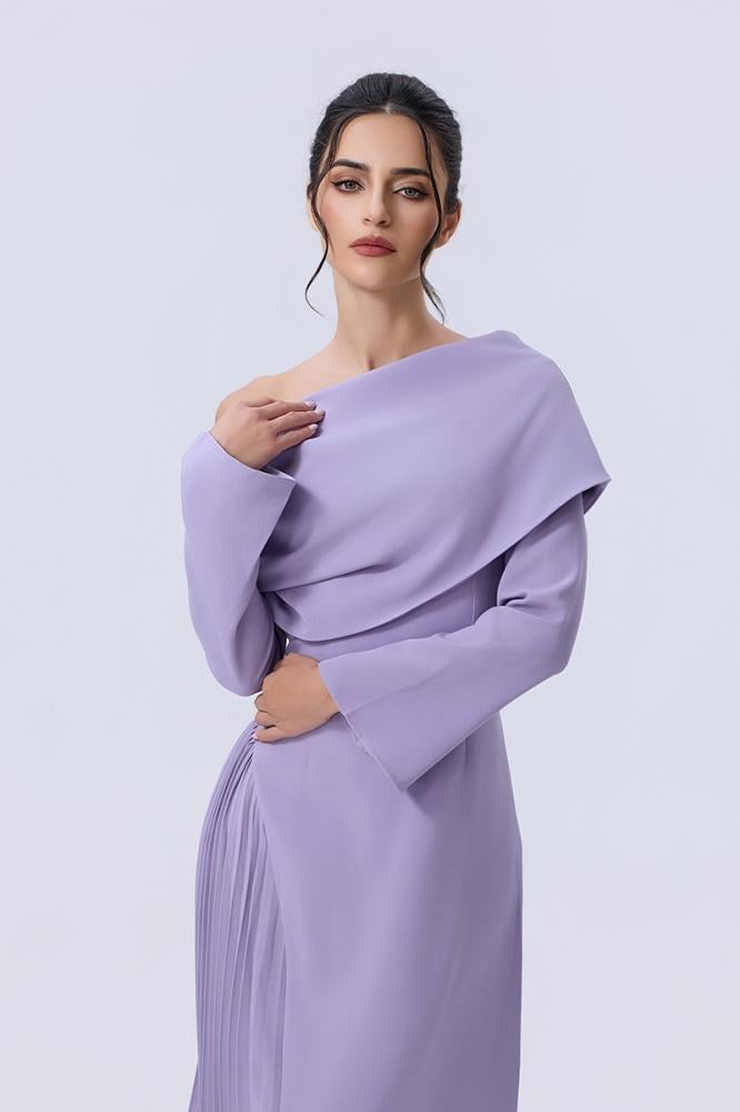 تألقي بإطلالة ساحرة تخطف الأنظار مع هذا الفستان الموف الطويل المصمم بعناية ليمنحك مظهراً أنيقاً ولافتاً. يأتي بقصة فاخرة مع ياقة عريضة تنسدل على الأكتاف لتضفي لمسة درامية ناعمة، بينما تضيف الأكمام الطويلة توازناً مثالياً بين الجرأة والرقي. الكسرات الجانبية الواسعة تبرز تفاصيل التصميم وتمنحك حرية حركة وانسيابية ملفتة، ما يجعله خياراً مثالياً لكل مناسبة راقية تستدعي حضوراً مميزاً.