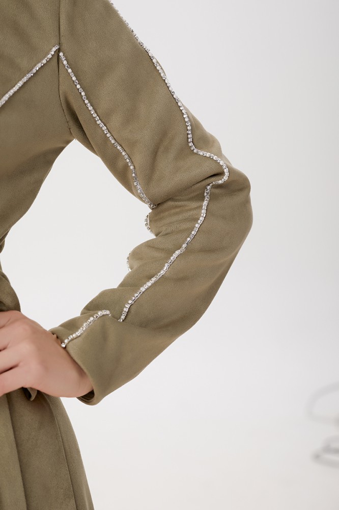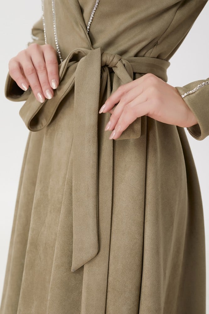 فستان شمواه لون كاكي صدر مزدوج برباط جانبي على الخصر مع اكسسوار كريستال داخل القصات تنورة كلوش كامل طول تحت الركبة