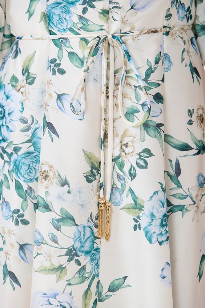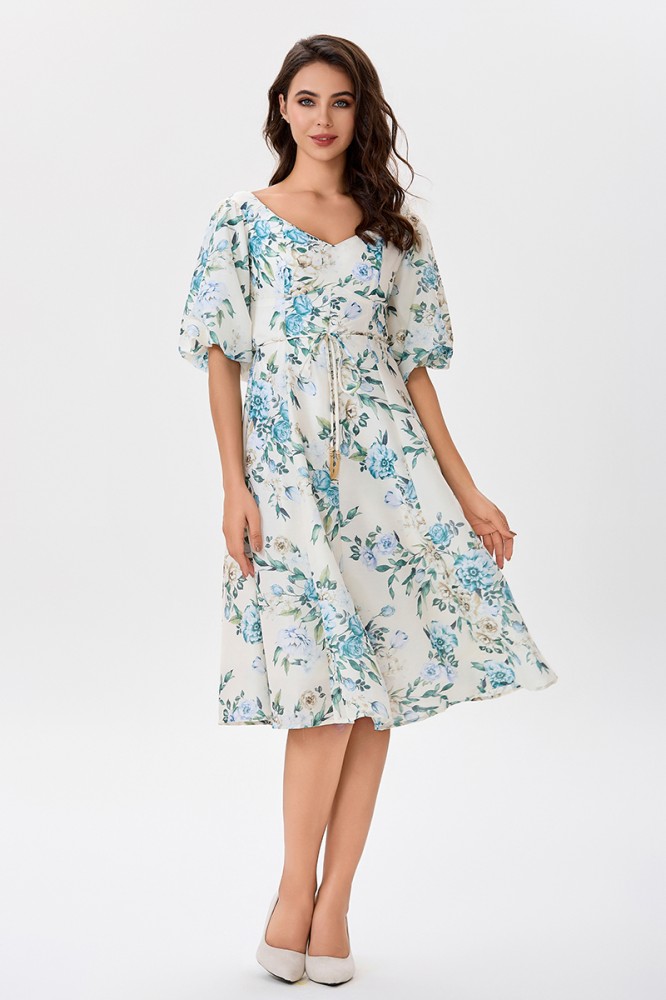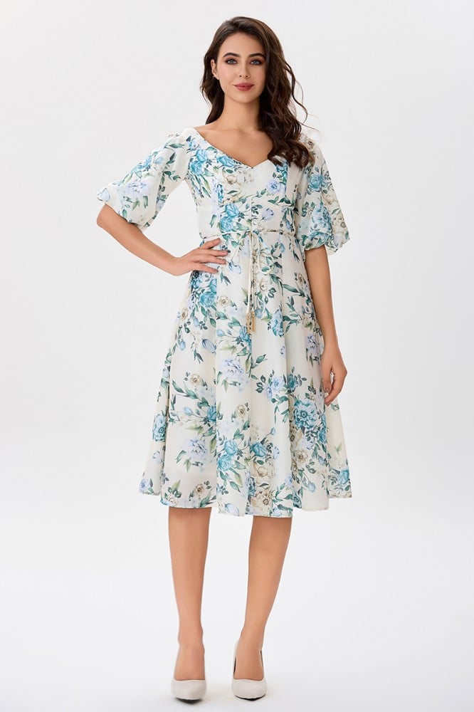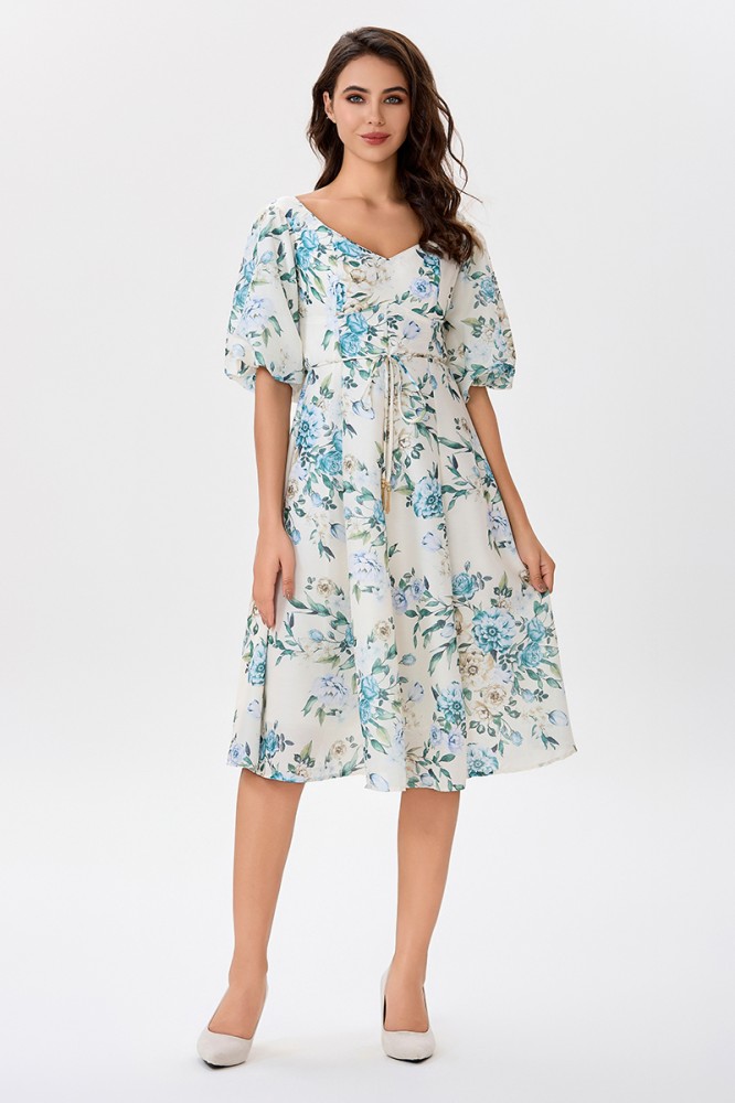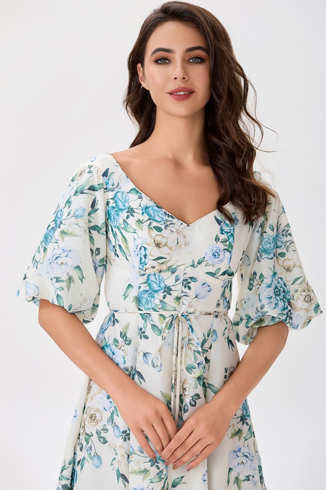 فستان شيفون اوف وايت بنقشة الزهور بألوان الأزرق قصة كلاسيكية بياقة سبعة مع اكمام قصيرة فضفاضة بطرف مغاط قصة صدر كورسية مع رباط رفيع على الخصرالخامة شيفون : غير قابلة للتمددسماكة النسيج : خفيفة