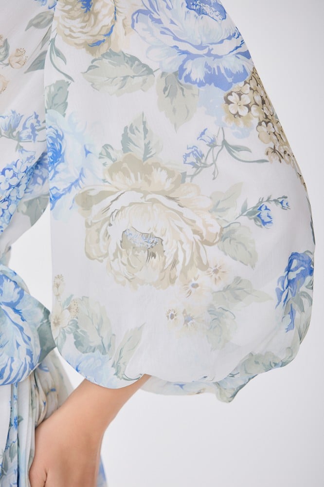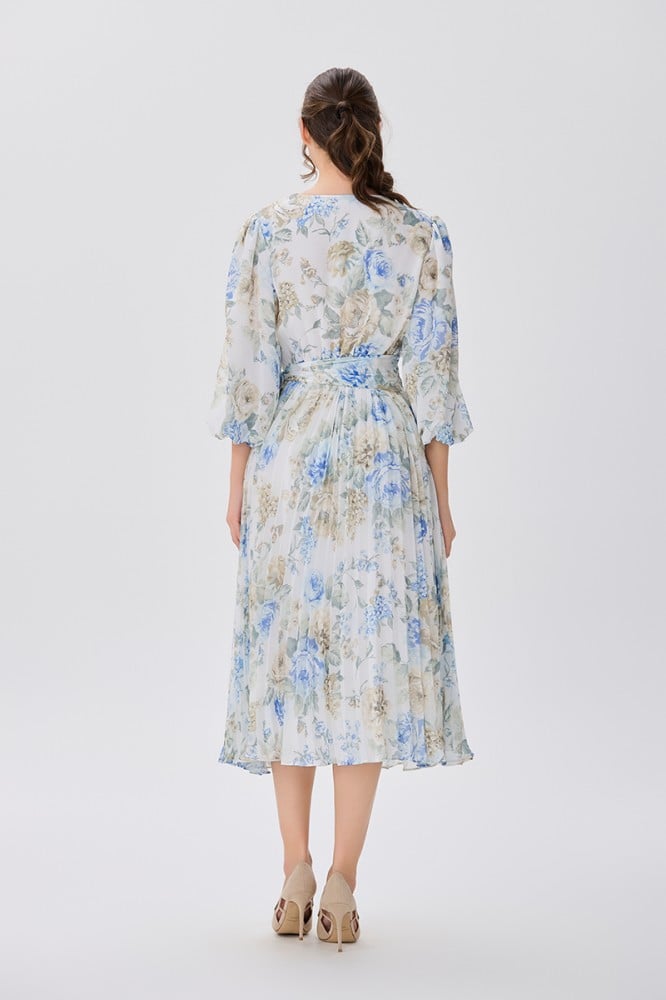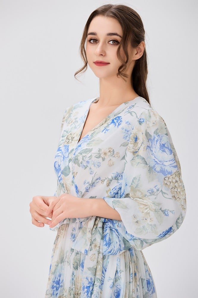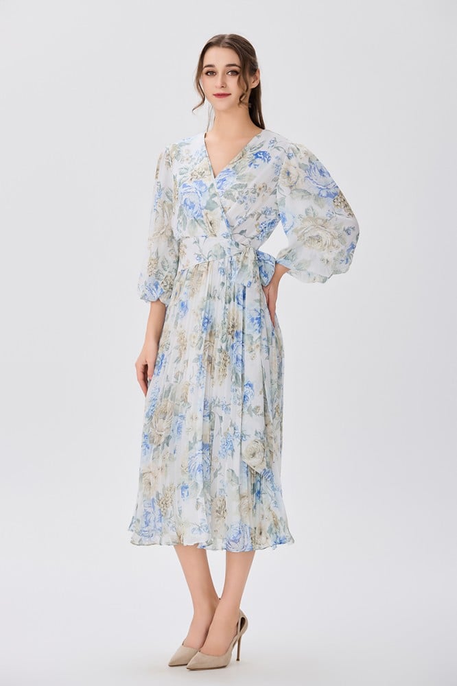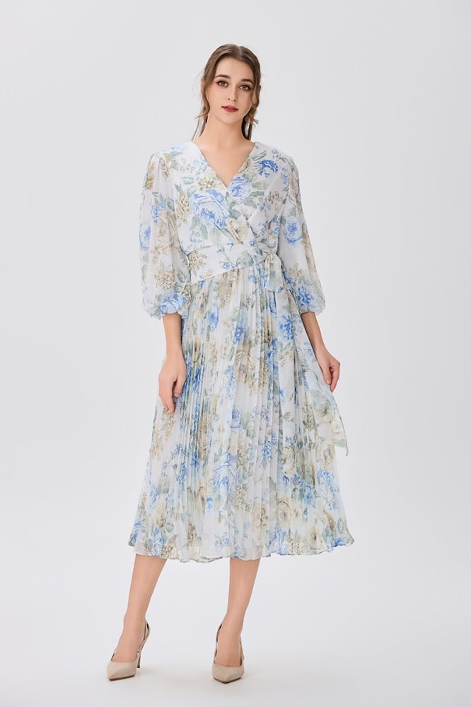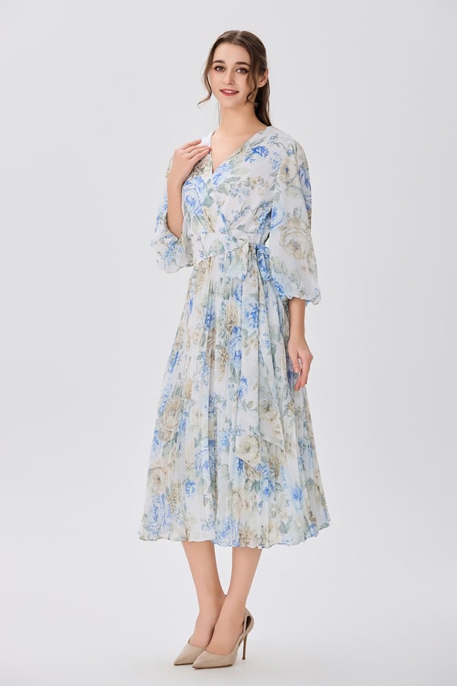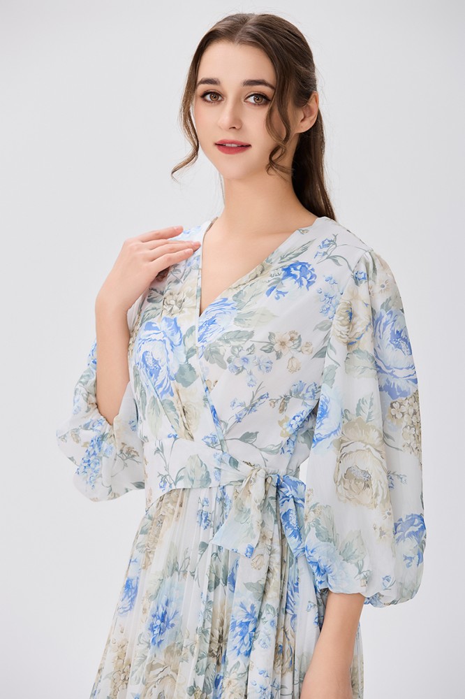 فستان شيفون اوف وايت بنقشة الورد صدر مزدوج وأكمام فضفاضة قصة خصر عريض مع رباط جانبي وتنورة كلوش بليسيةالخامة شيفون : غير قابلة للتمددسماكة النسيج : خفيفة