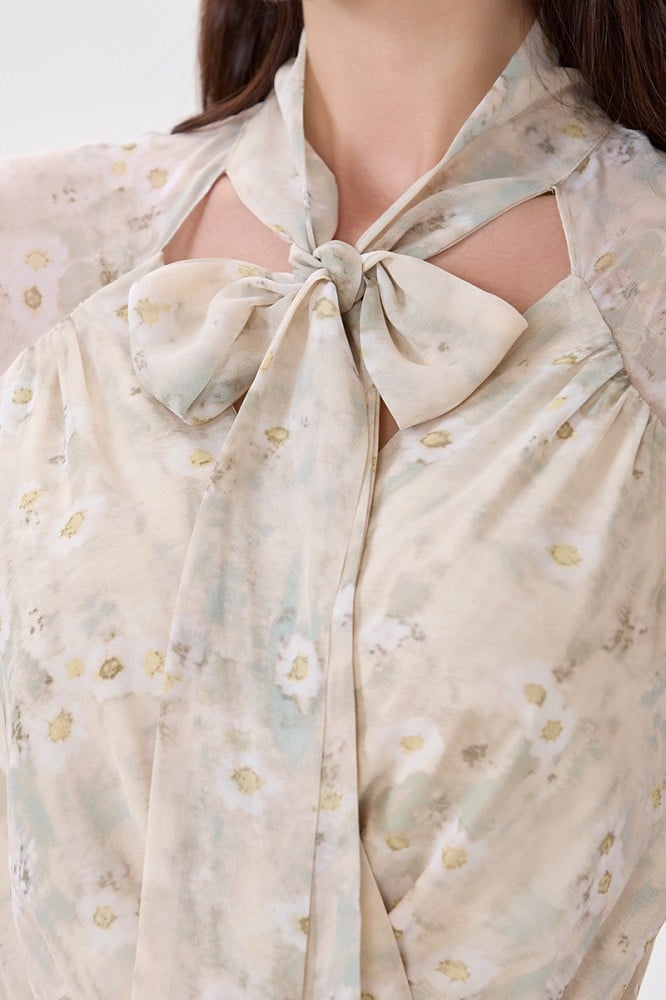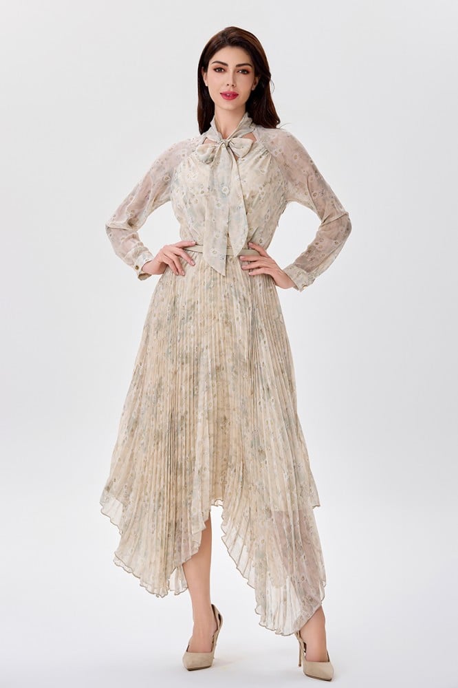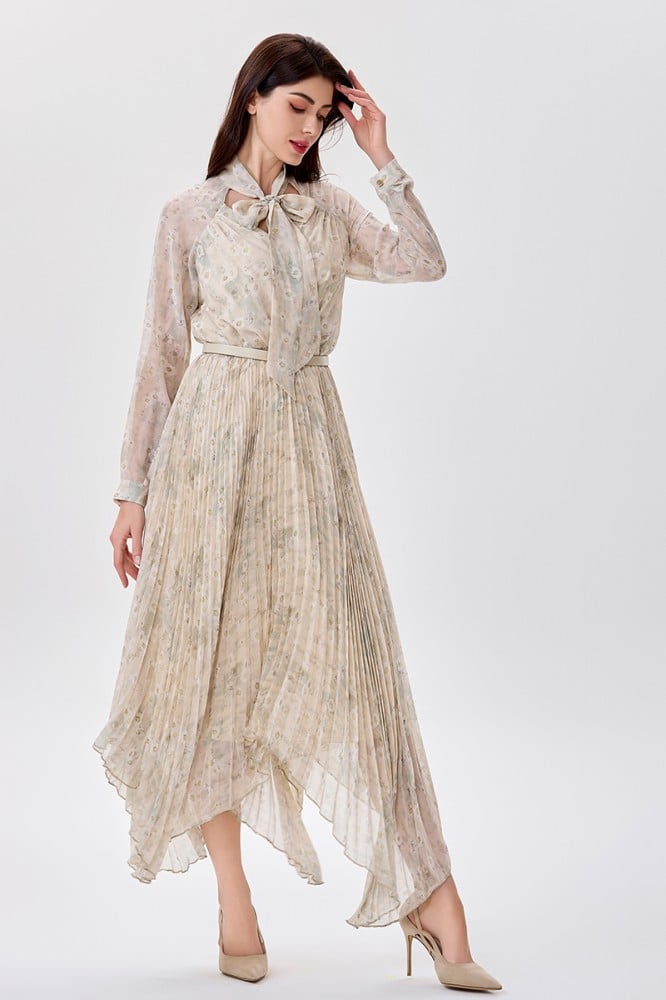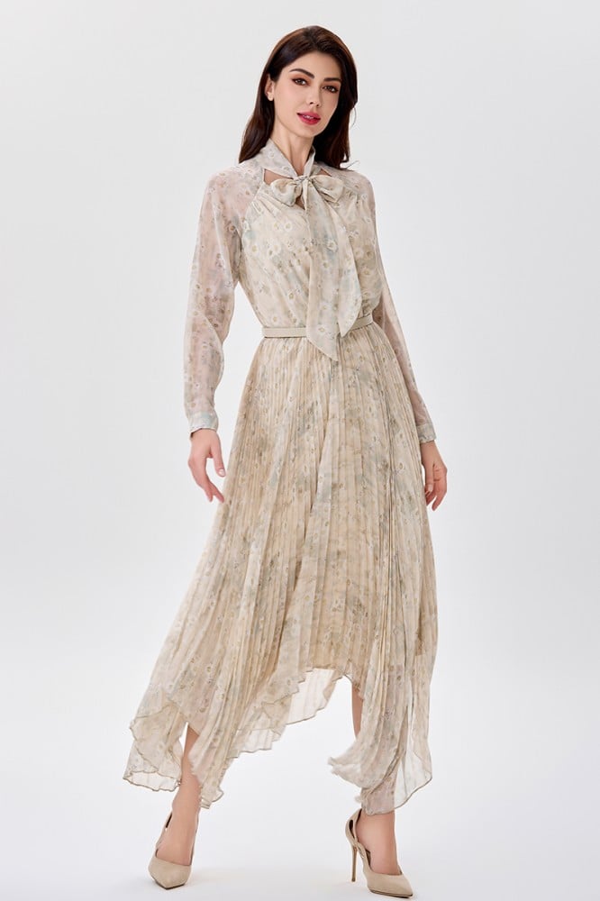 فستان شيفون بنقشة الزهور مع رباط على الياقة صدر مزدوج مع حزام على الخصر وتنورة بليسية كلوش الخامة شيفون : غير قابلة للتمددسماكة النسيج : خفيفه دليل المقاسات