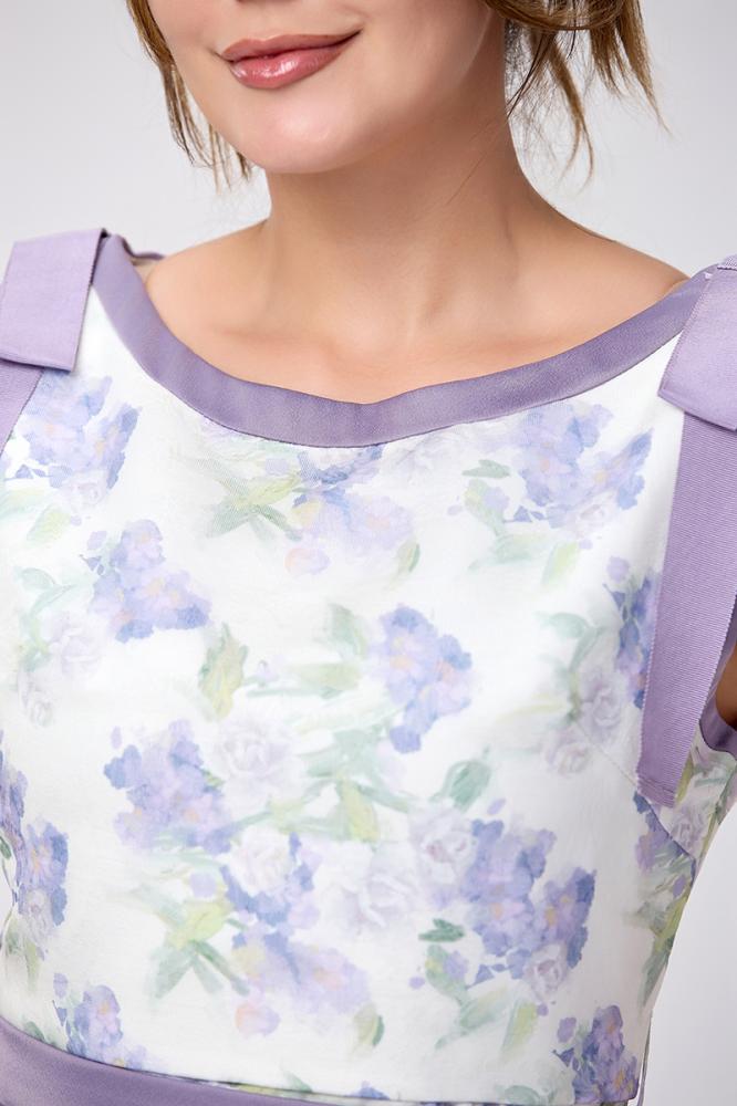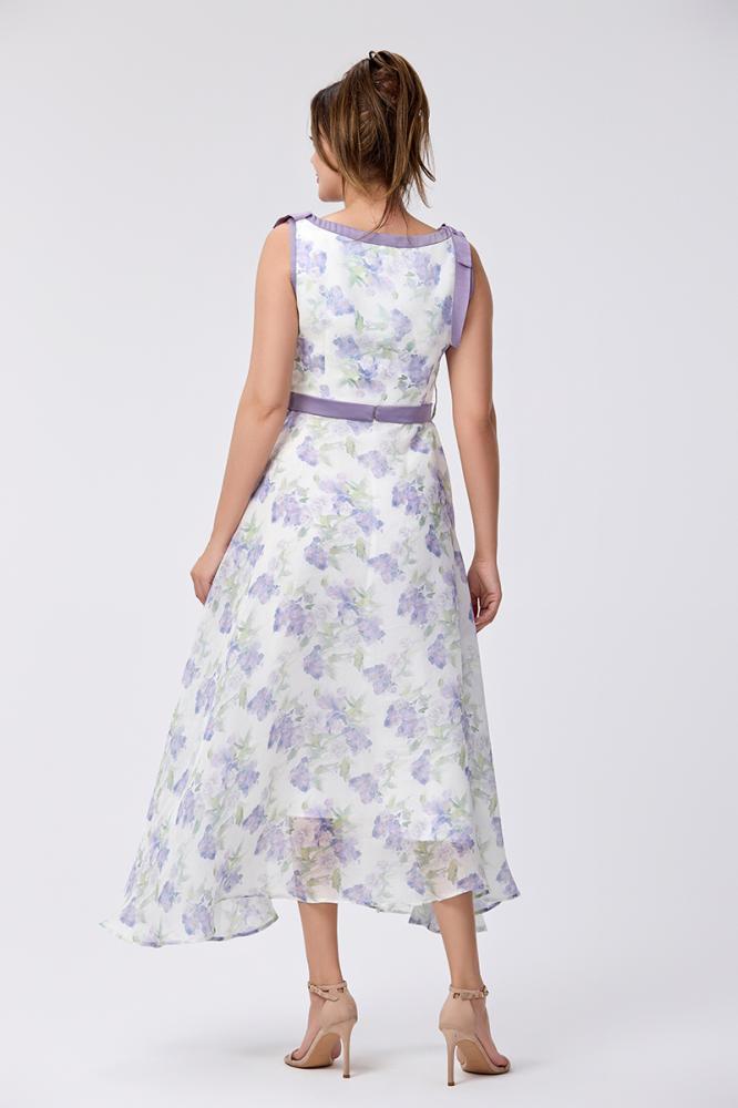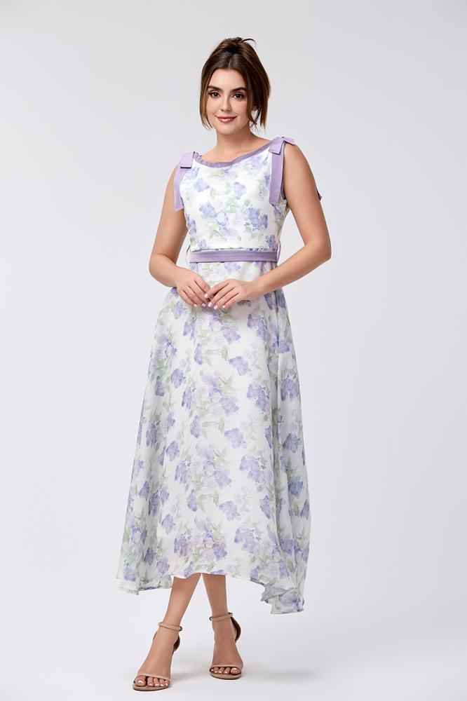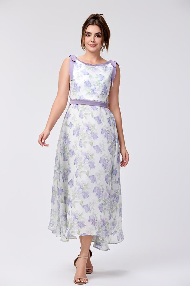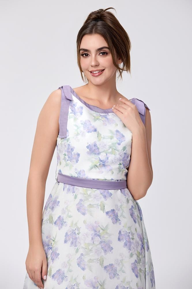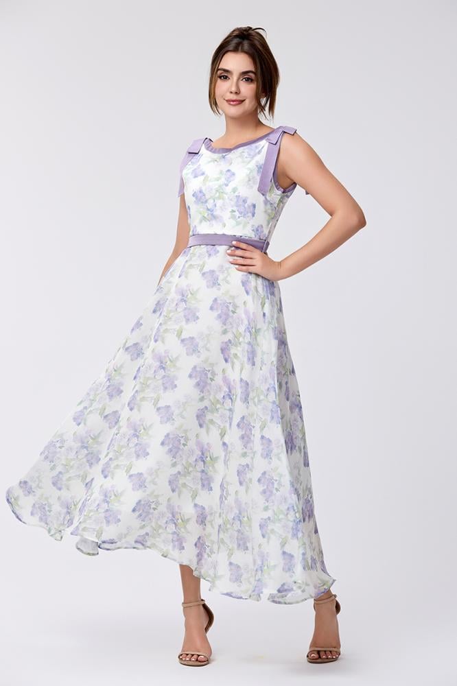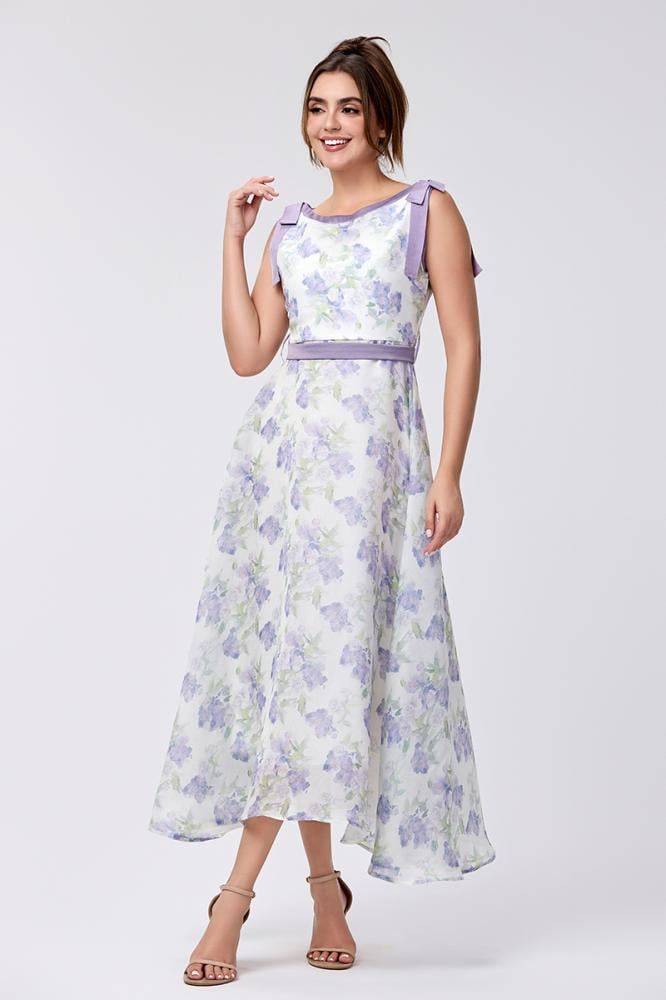 فستان شيفون بنقشة الورد البنفسجي بياقة محددة بالستان مع رباط على الكتف وحزام عريض على الخصر مع تنورة كلوش