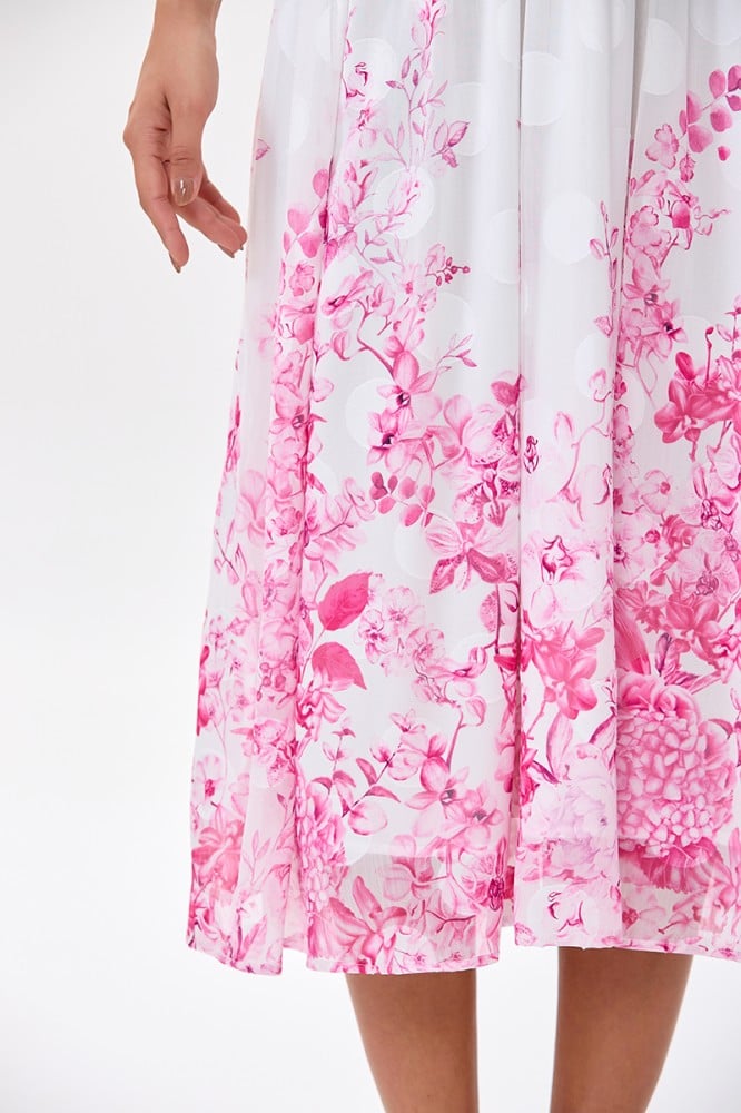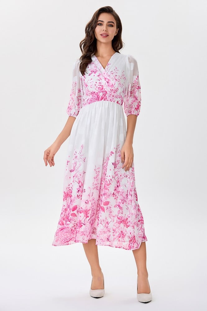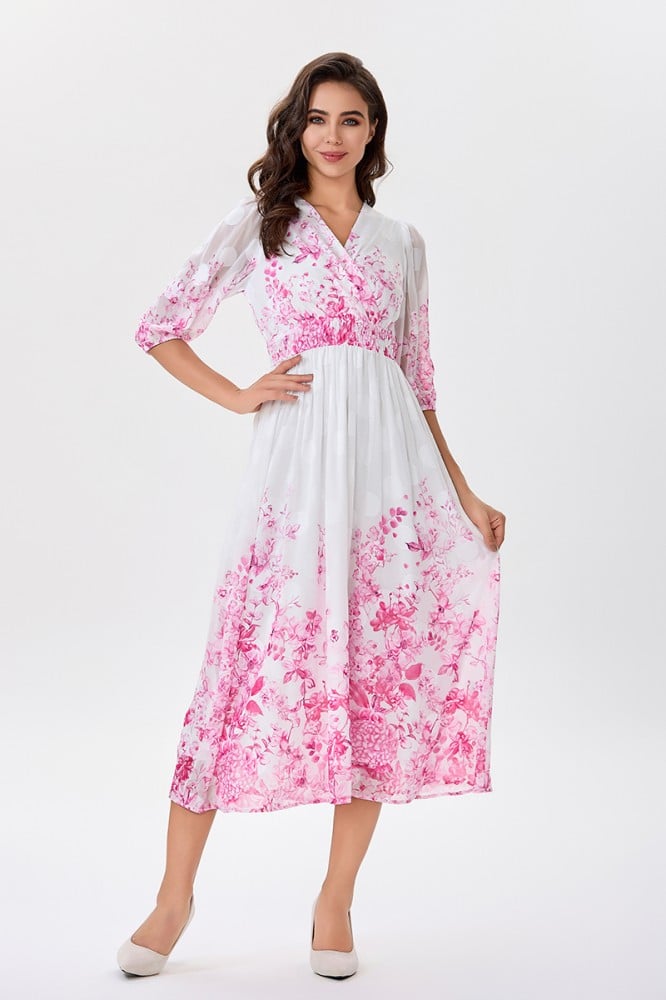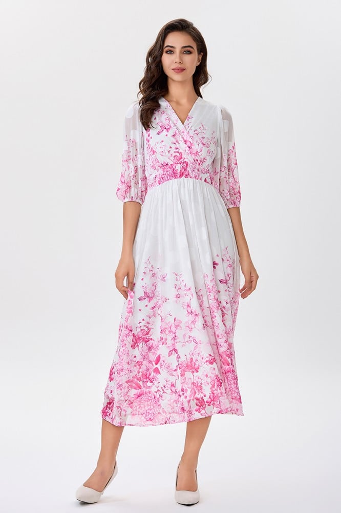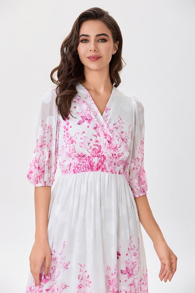فستان شيفون اوف وايت بنقشة زهري موزعة على اطراف الفستان والأكمام صدر مزدوج مع رباط على الخصر الخامة شيفون : غير قابلة للتمددسماكة النسيج : خفيفة