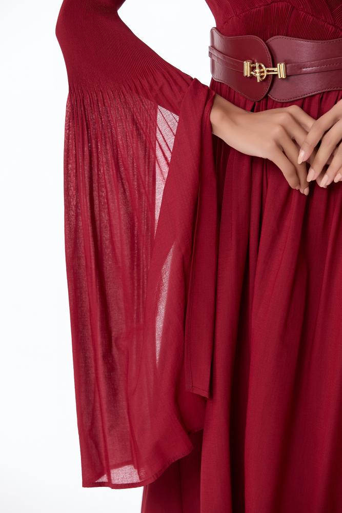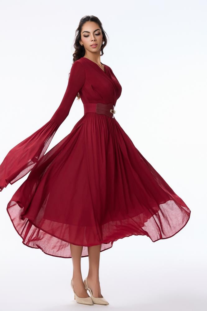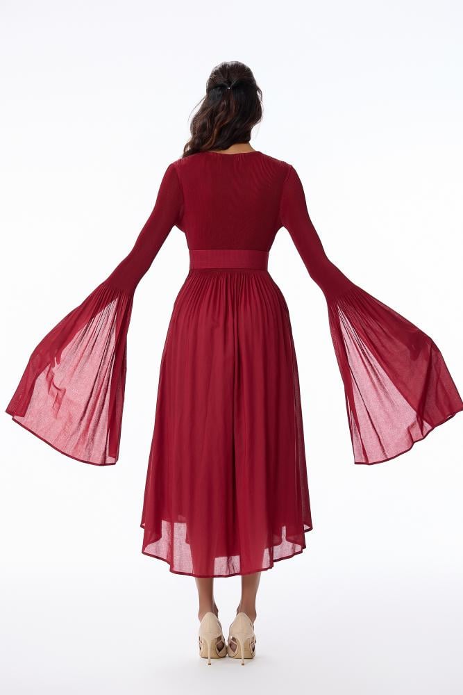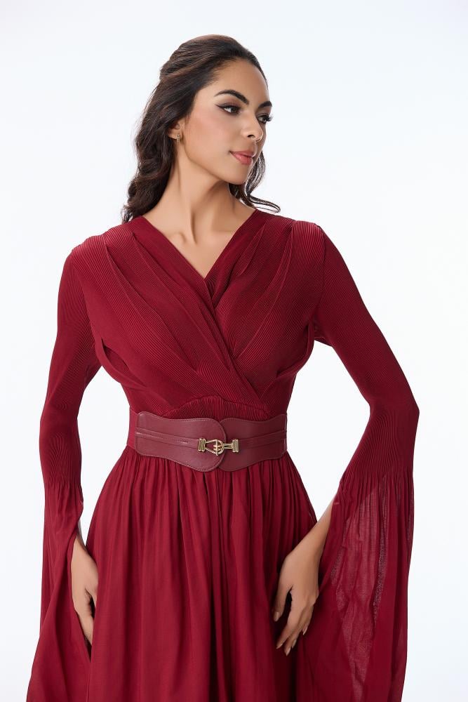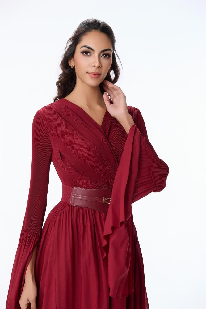 • فستان شيفون احمر بقصة صدر مزدوجة واكمام طويلة بطرف كلوش وتنورة كلوش غنية الوسع مع حزام عريض لتحديد الخصر