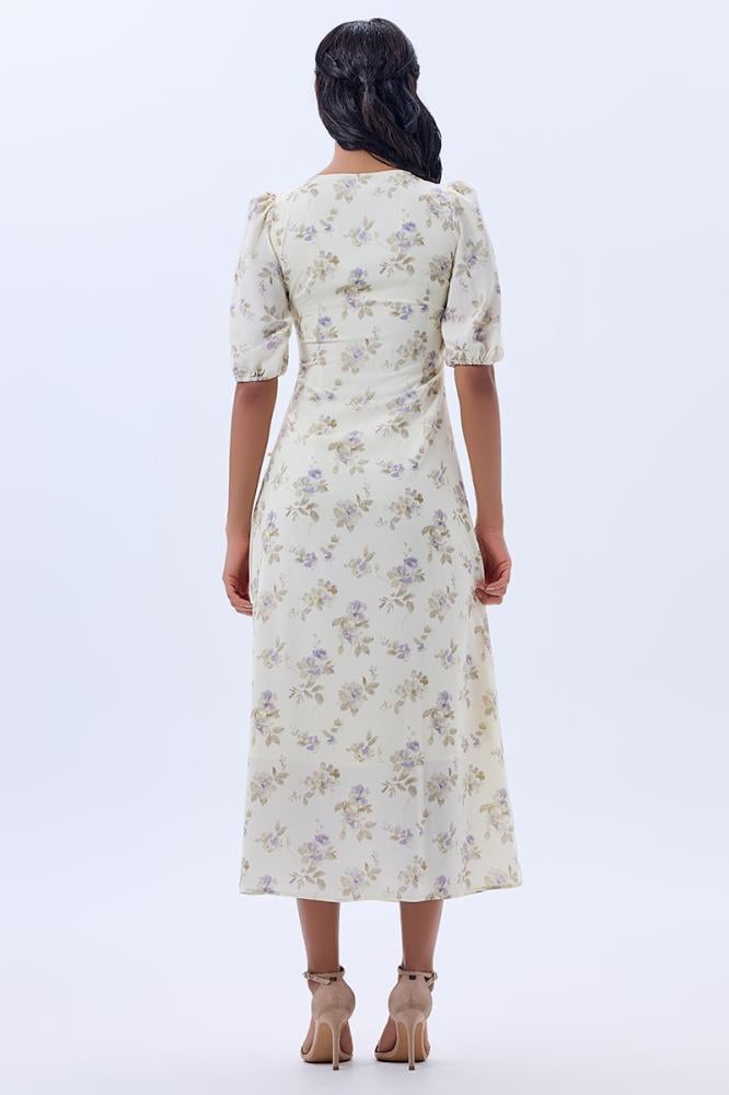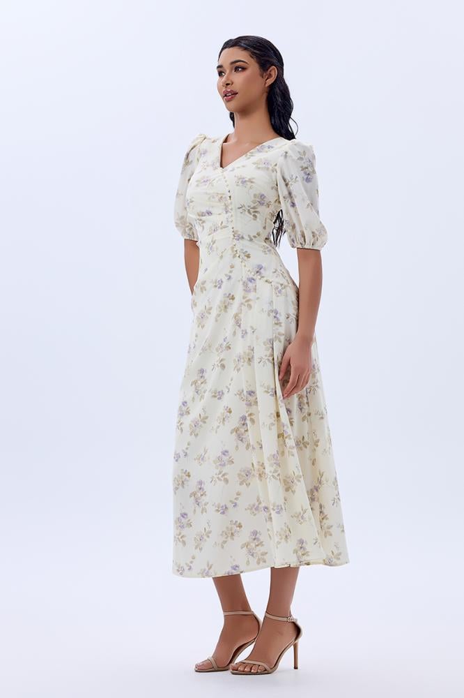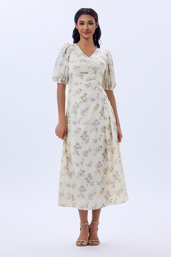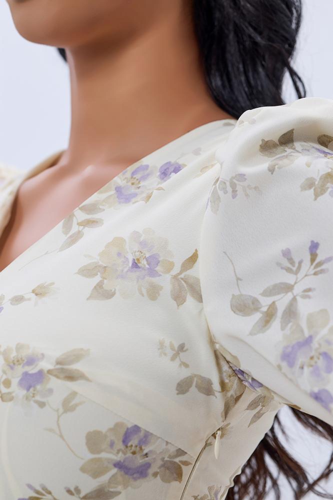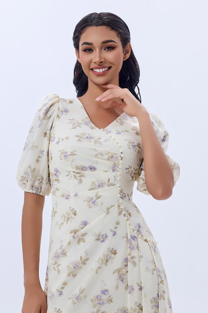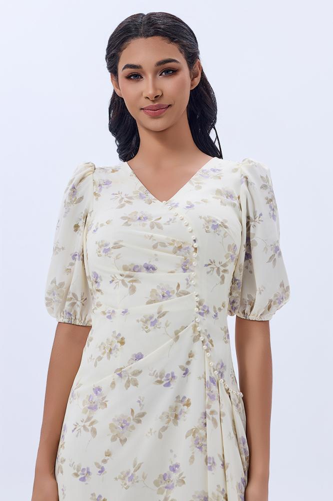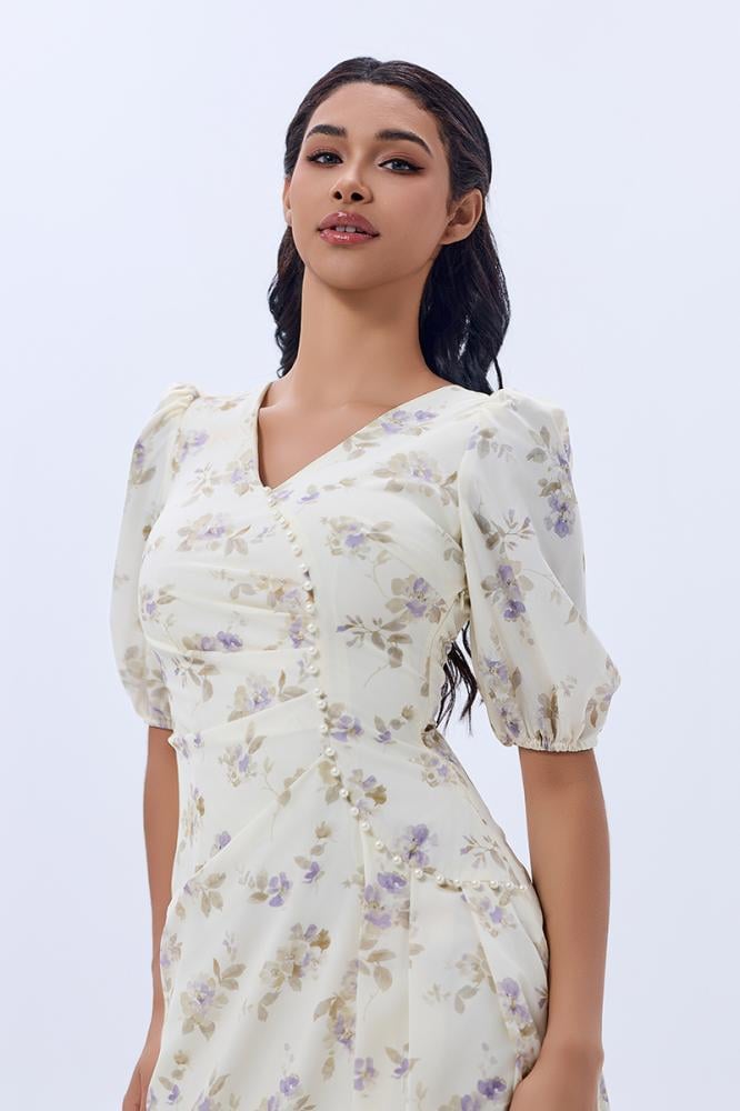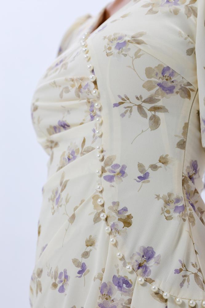 فستان شيفون بيج بطبعة الزهر البنفسجي و بثنيات على الصدر والخصر مع اكسسوار لؤلؤ متداخل في القصة