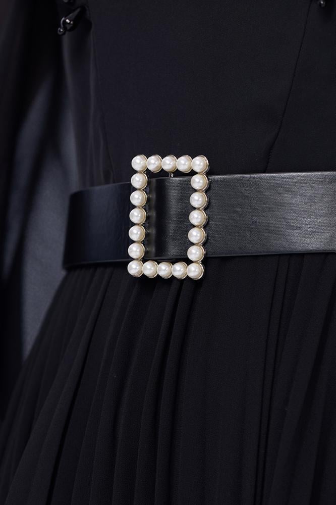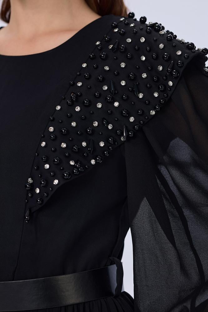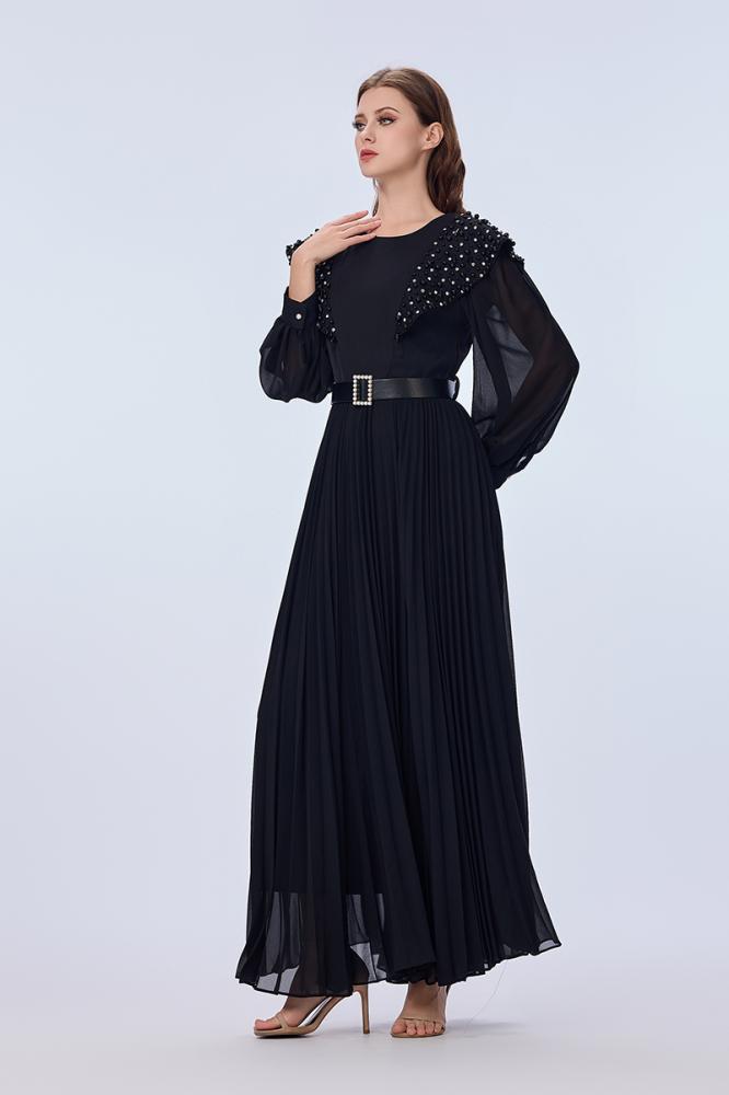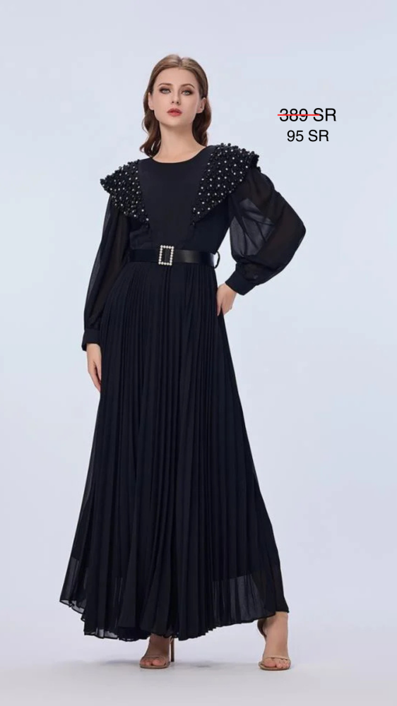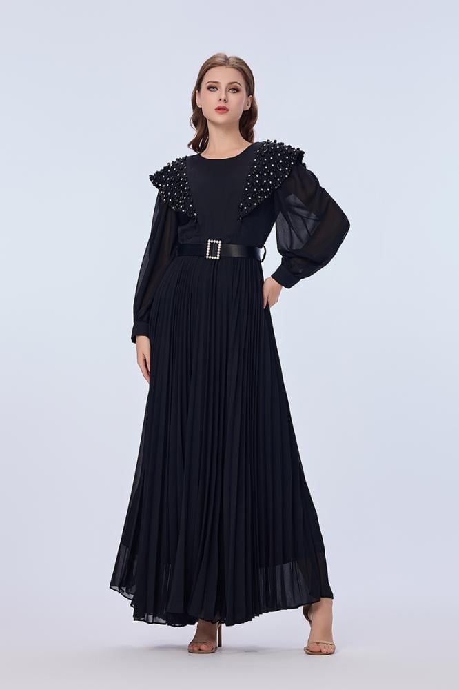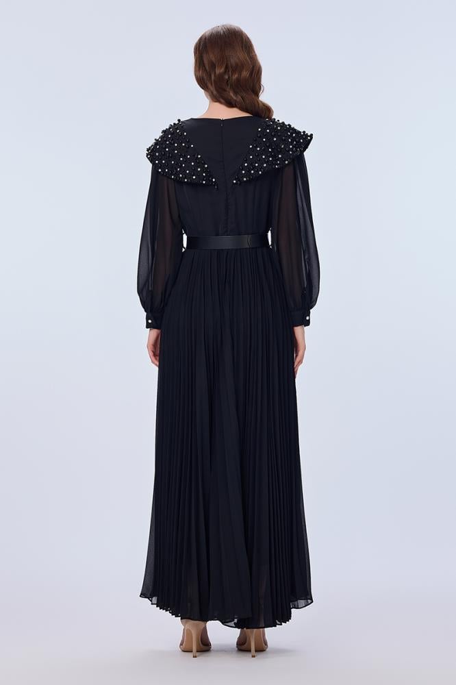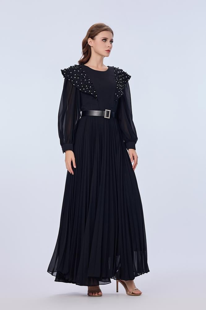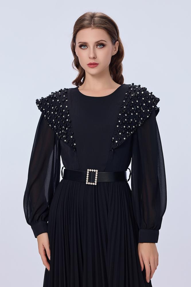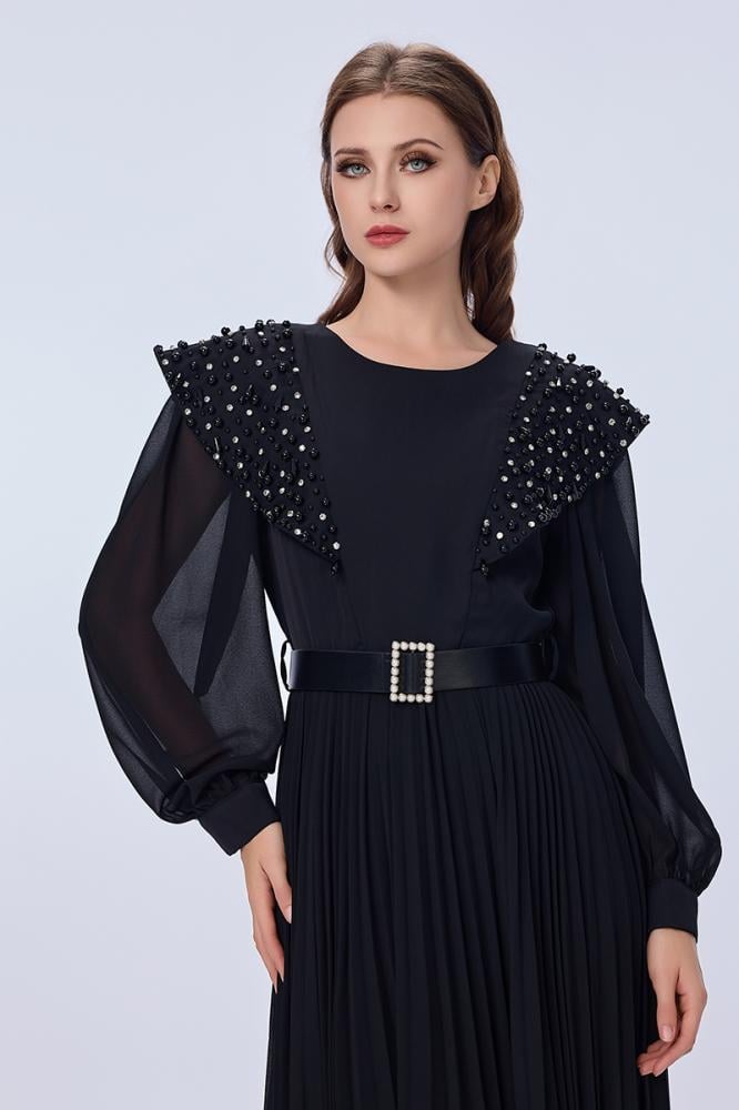 فستان شيفون اسود بقصات مميزة مزينة باللؤلؤ غلى الصدر واكمام طويلة فضفاضة مع تنورة كلوش بليسيه لتصميم ساتر وراقي