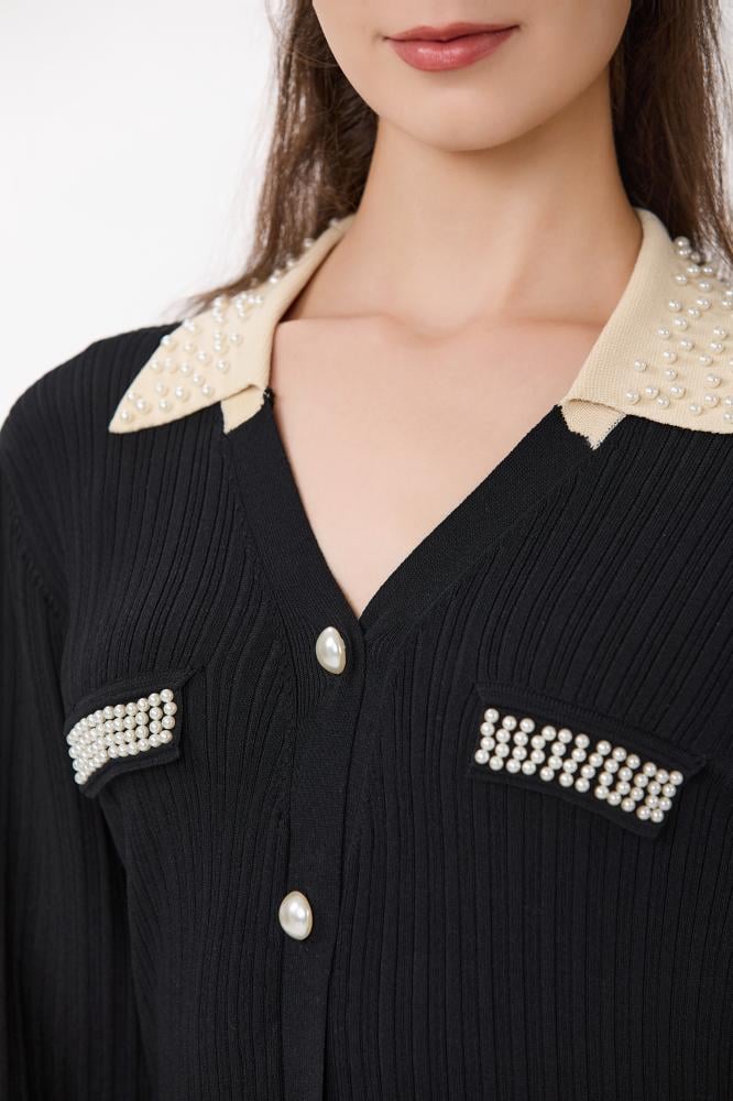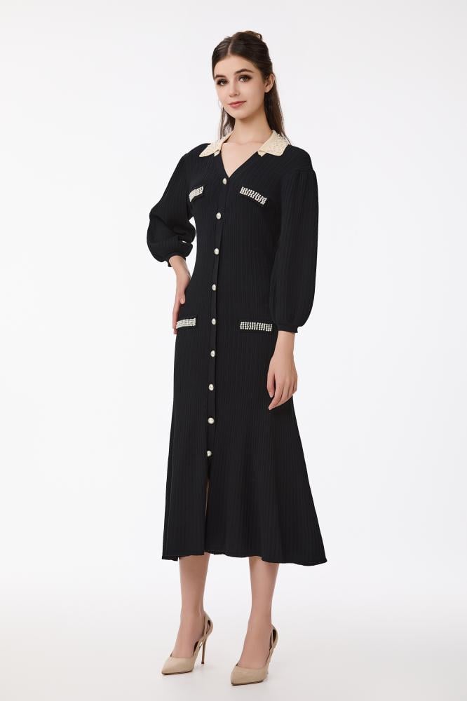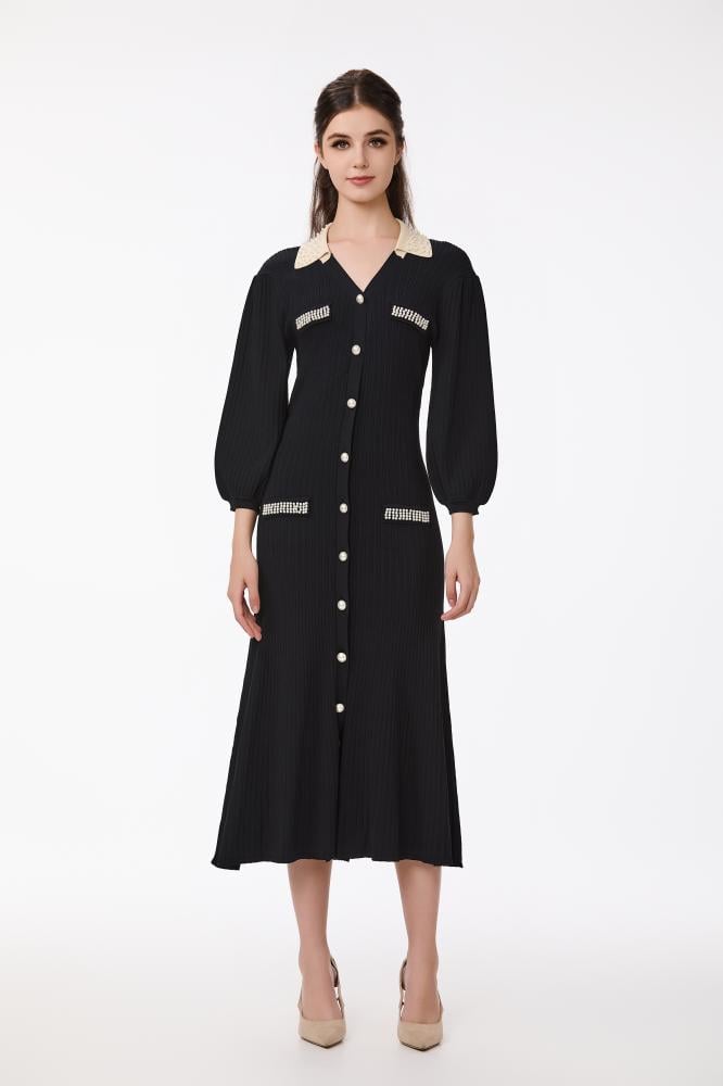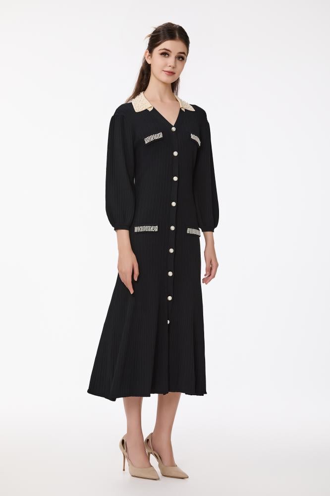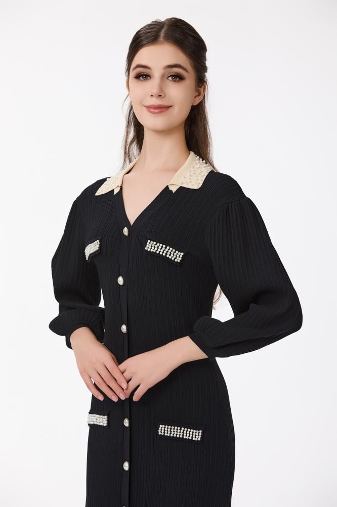 فستان صوف أسود أنيق يتميز بحياكة بارزة مميزة تضفي لمسة فريدة على التصميم. يزين الجيوب لؤلؤ فاخر، مما يضيف لمسة من الرقي والفخامة. هذا الفستان يجمع بين البساطة والتفاصيل الدقيقة، ليكون خيارًا مثاليًا للإطلالات اليومية والمناسبات الخاصة. تصميمه العصري مع الحياكة الفاخرة واللؤلؤ يجعله قطعة مميزة تعزز أناقتك بأسلوب كلاسيكي وعصري.