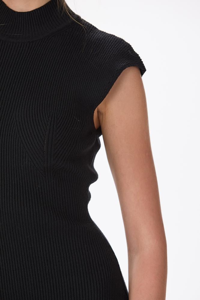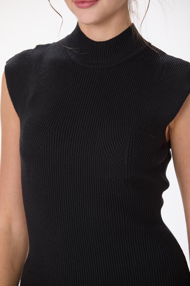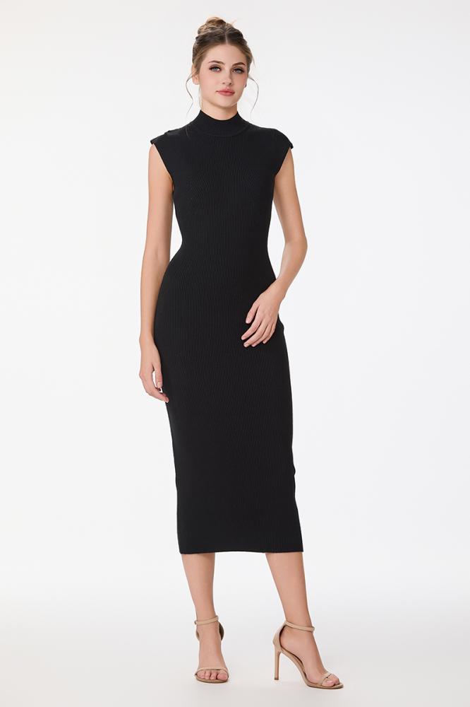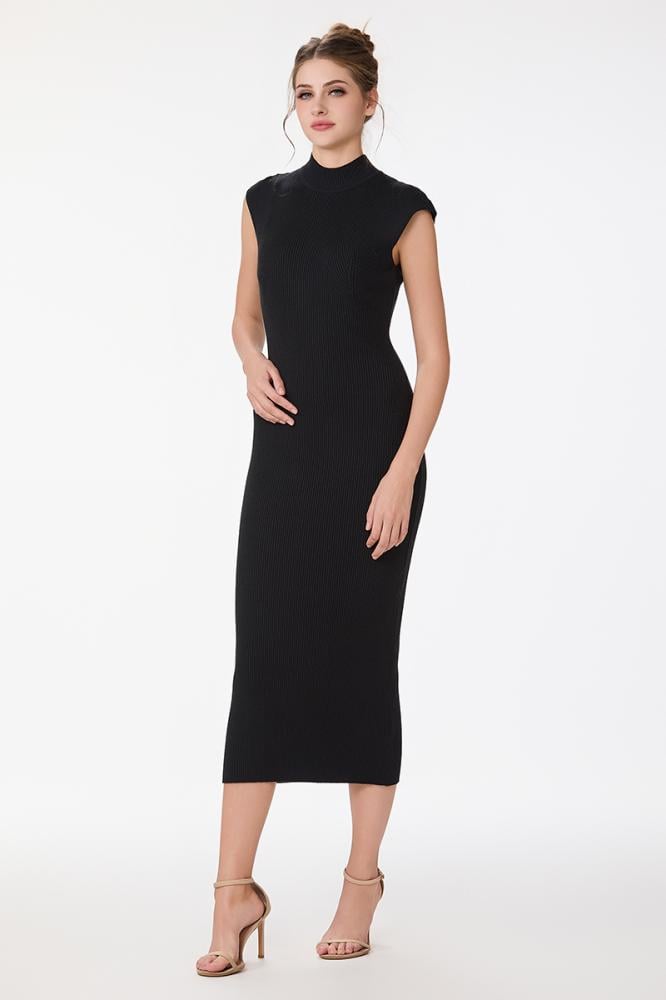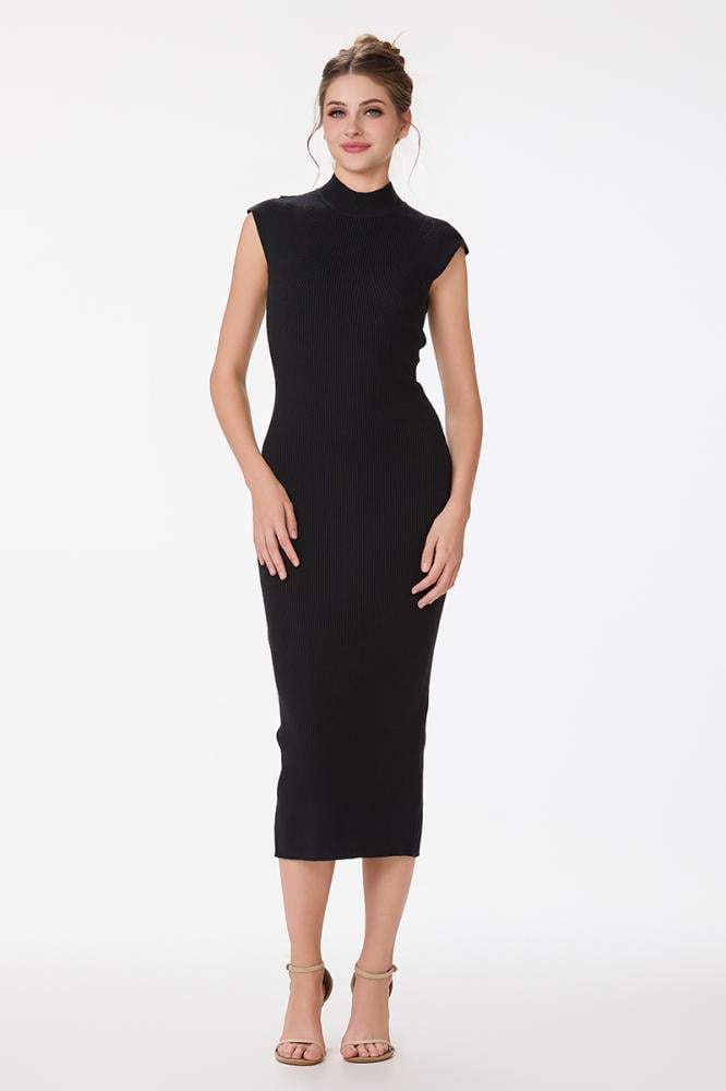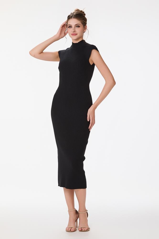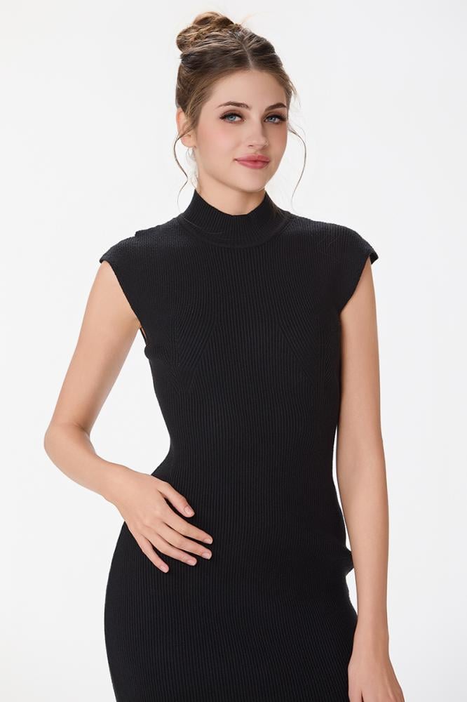فستان صوف ناعم استريتش اسود بياقة مرتفعة وقصة ماسكة من دون اكمام