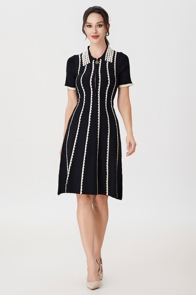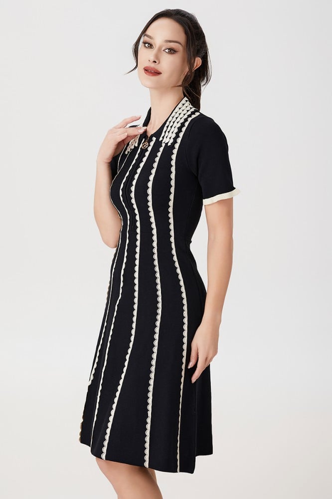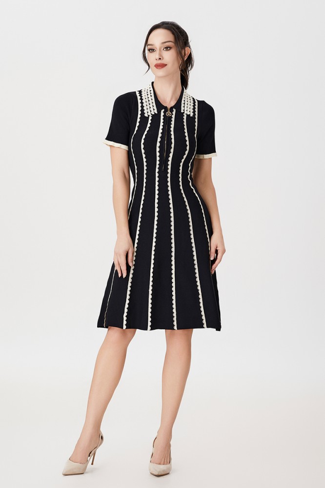 فستان صوف ناعم بأكمام طويلة ماسكة جورسية , ياقة عريضه مفتوحه مع رباط على الخصر لون اسود