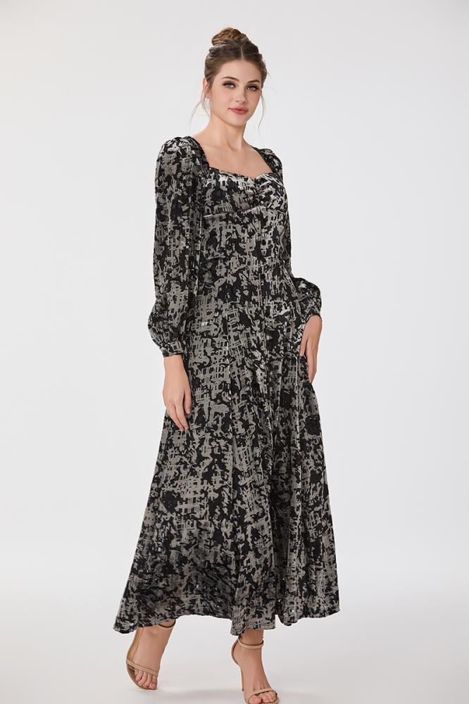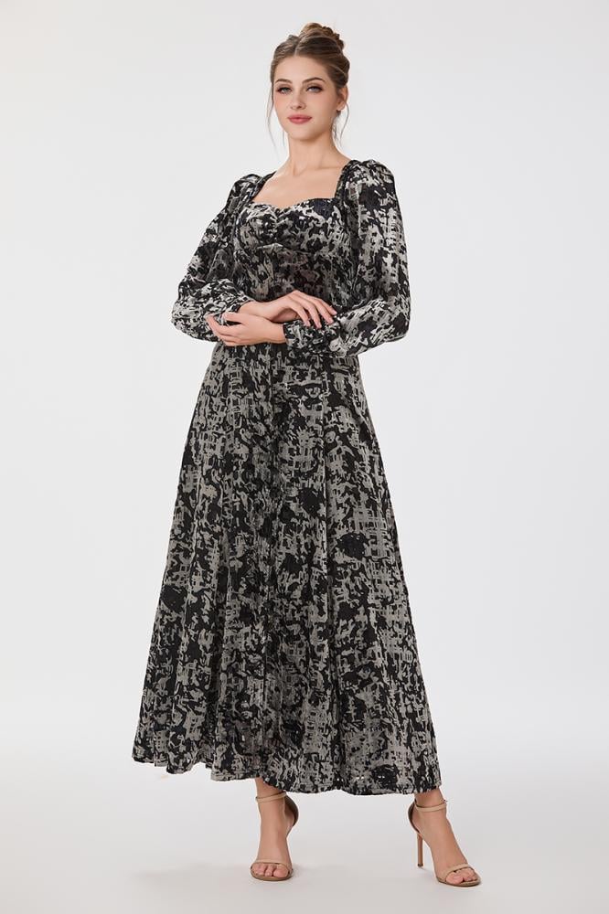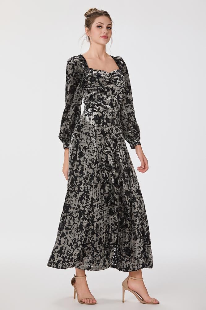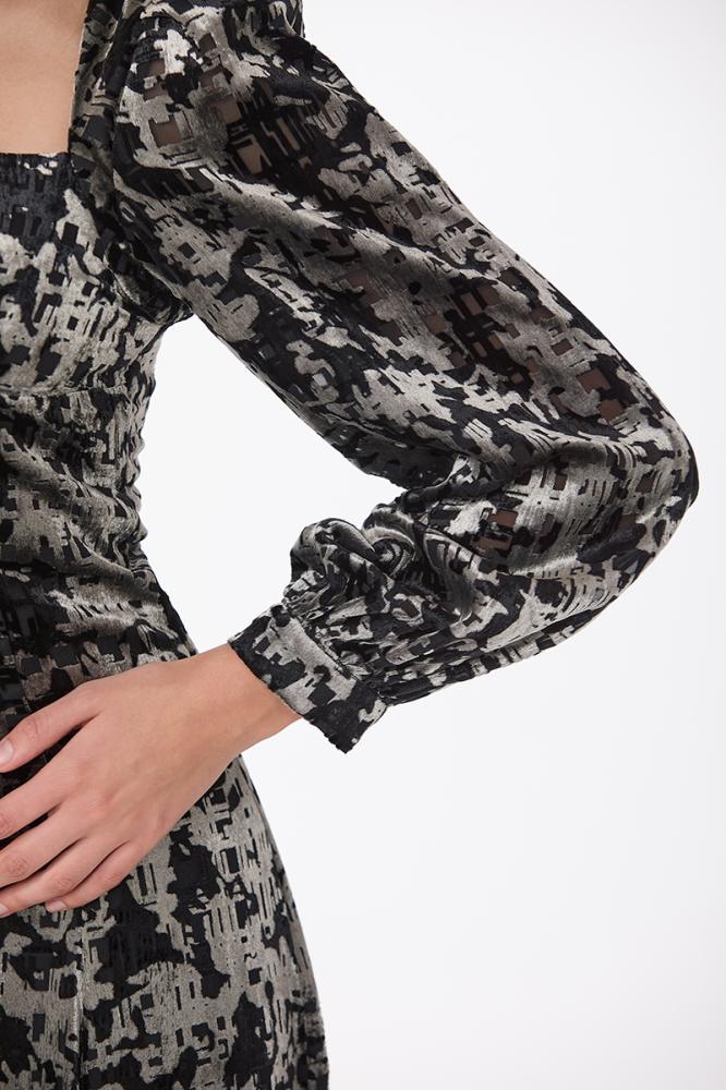 فستان طبع مخمل بقصة كورسيه مع اكمام فضفاضة وتنورة كلوش