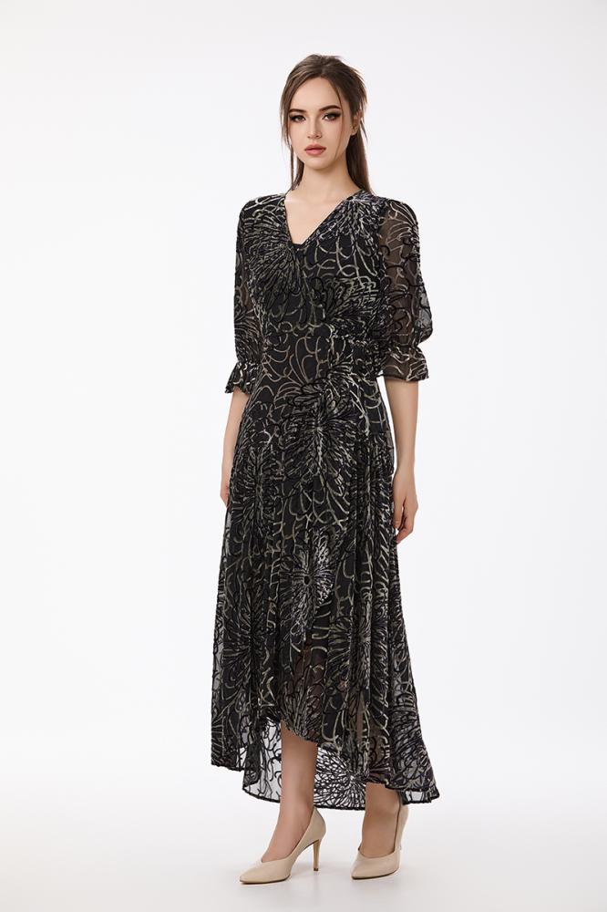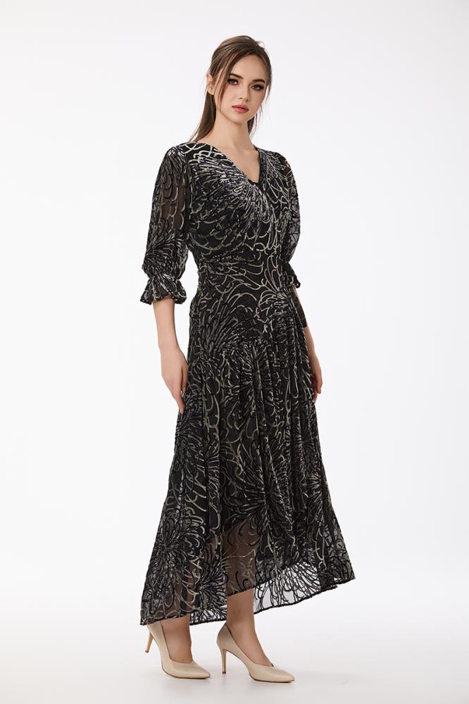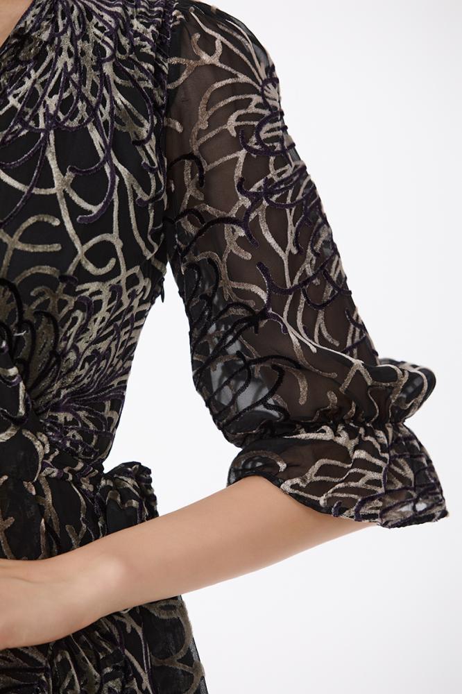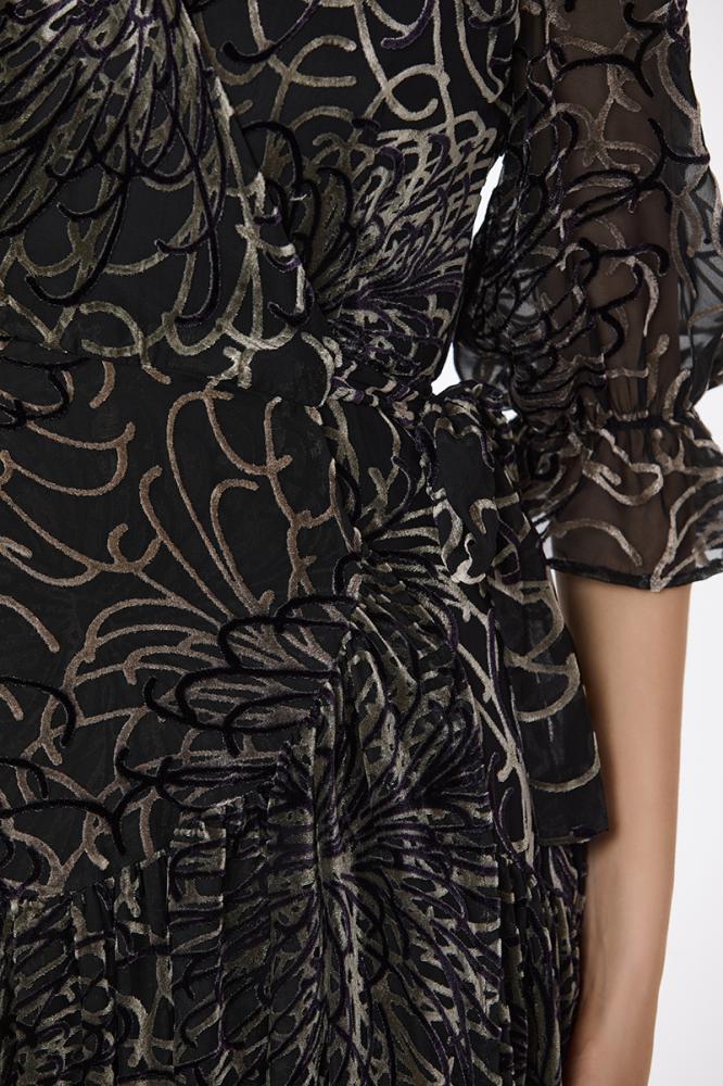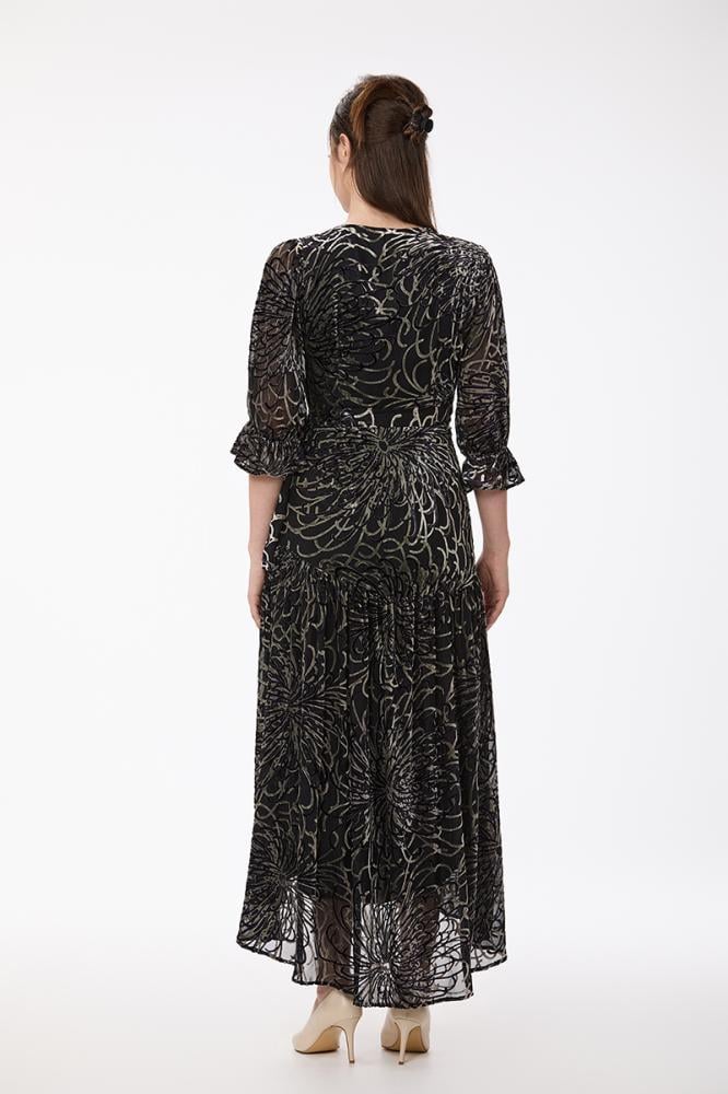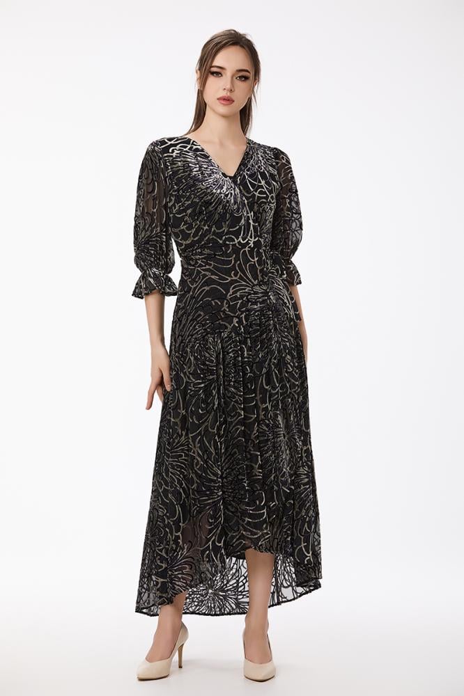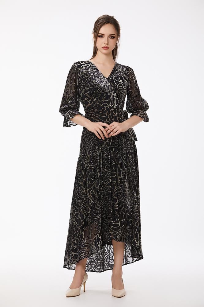• فستان طبع مخمل اسود وذهبي بقصة صدر مزدوجة واكمام بطرف كشكش مع تنورة كلوش بطول غير متوازي