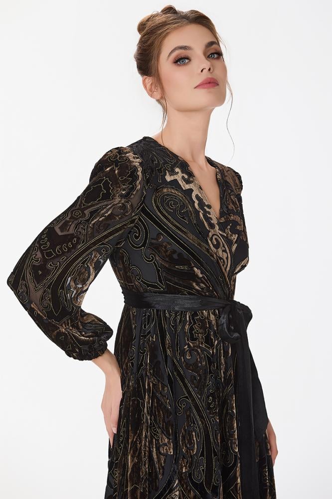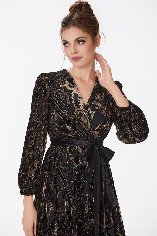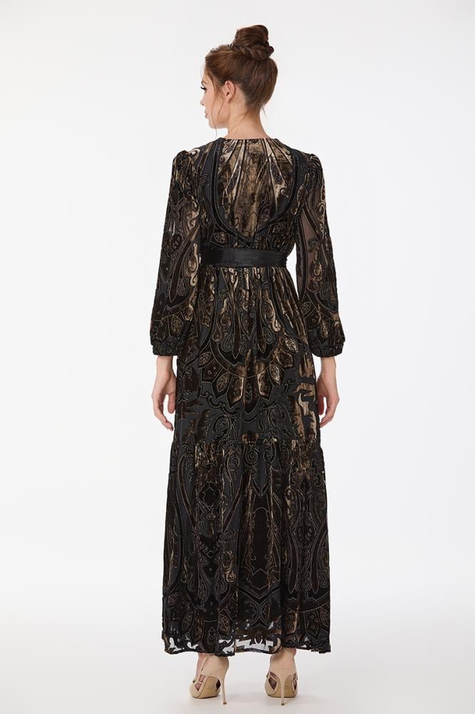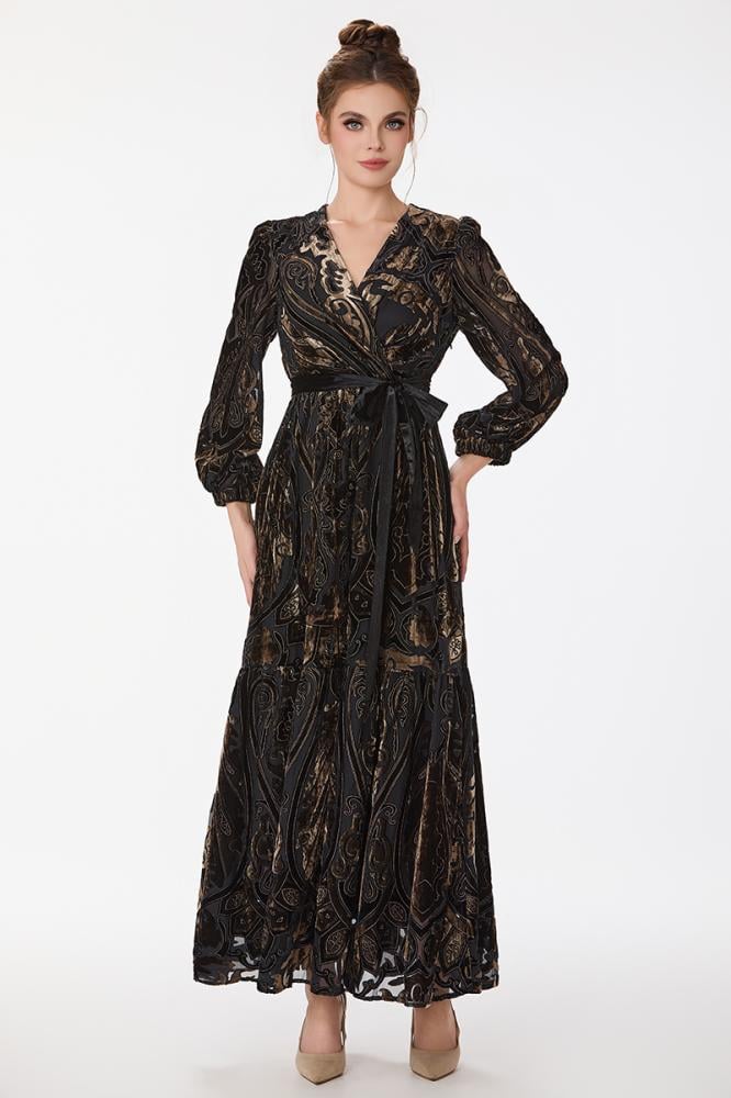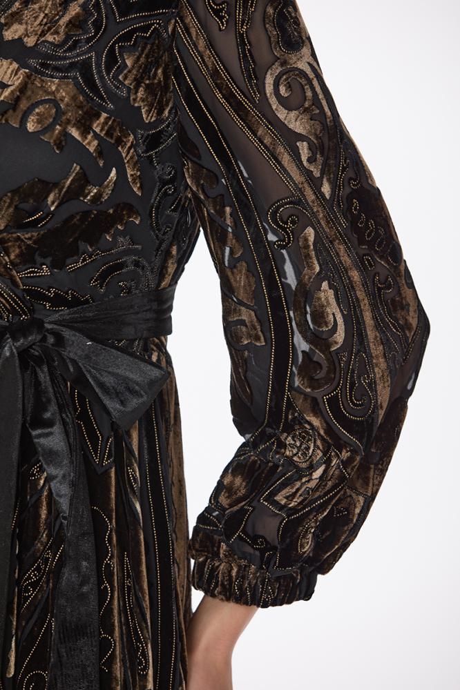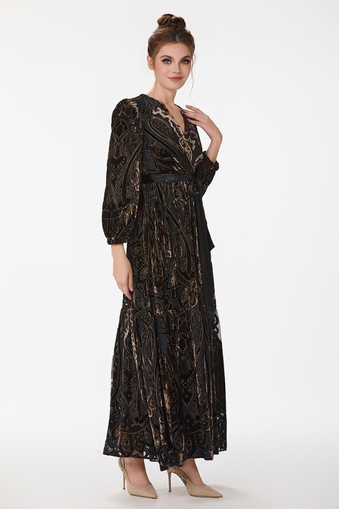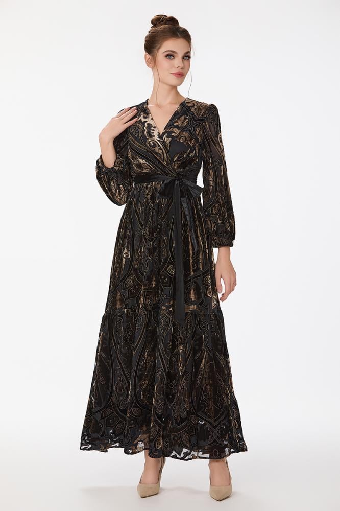 فستان طبع مخمل بقصة صدر مزدوجة مع اكمام فضفاضة ورباط على الخصر