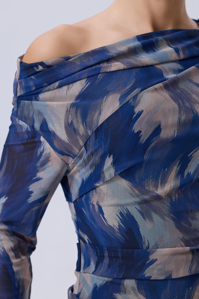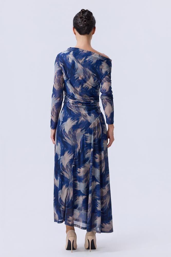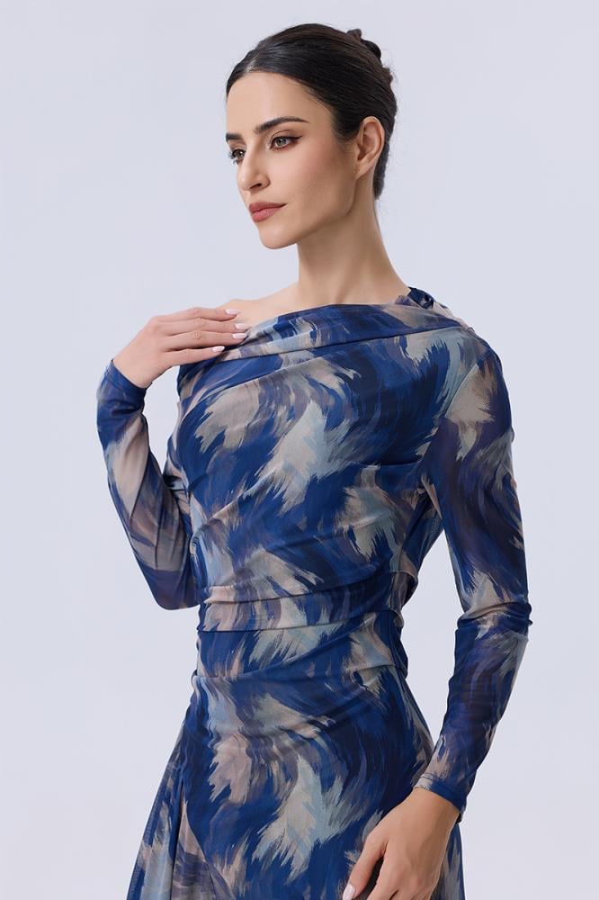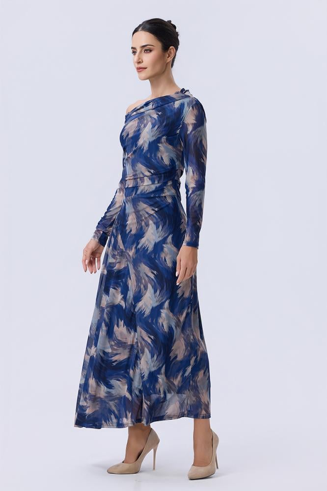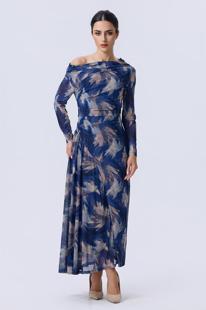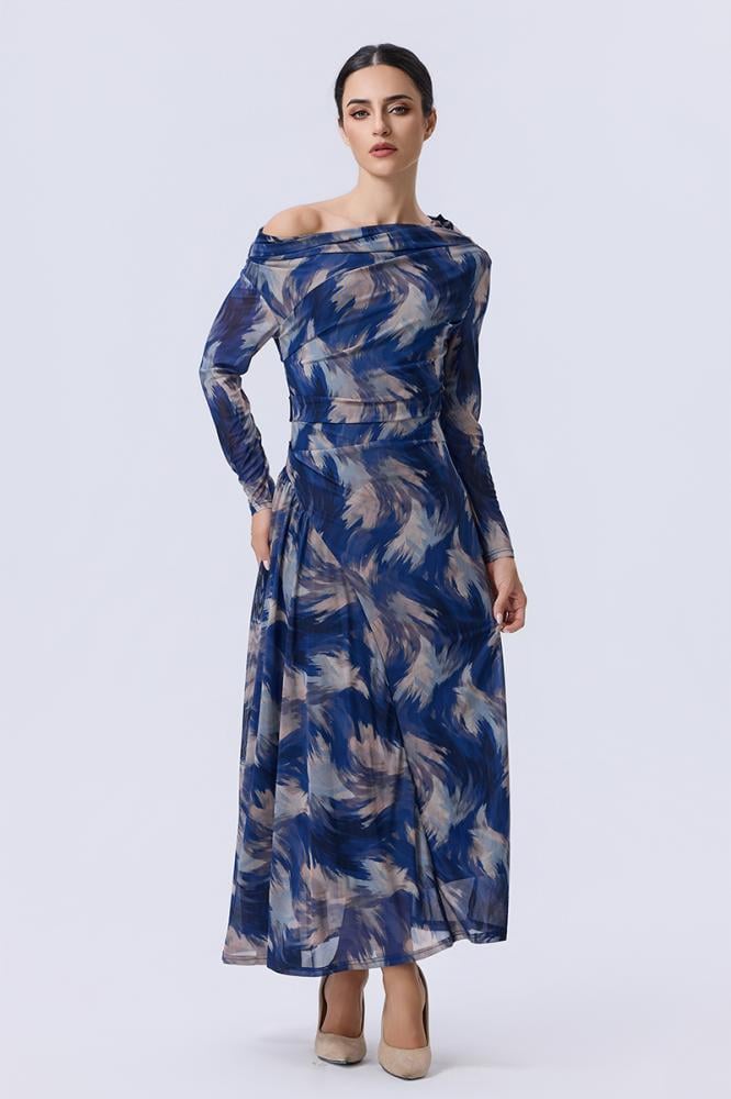 فستان طويل أزرق مطبوع بأكمام طويلة وكتف مكشوف