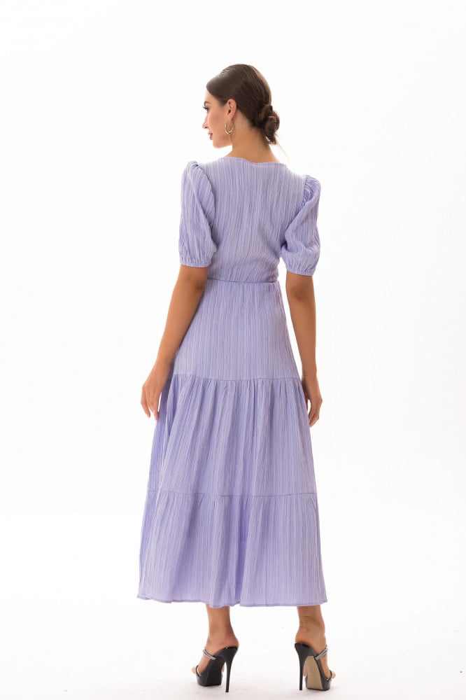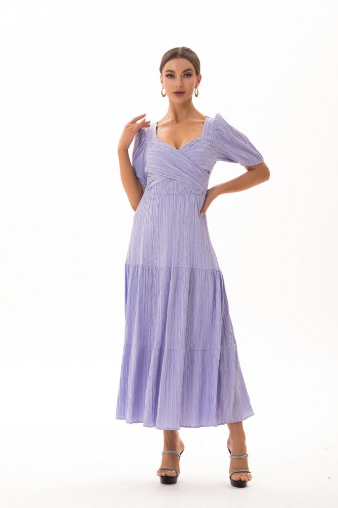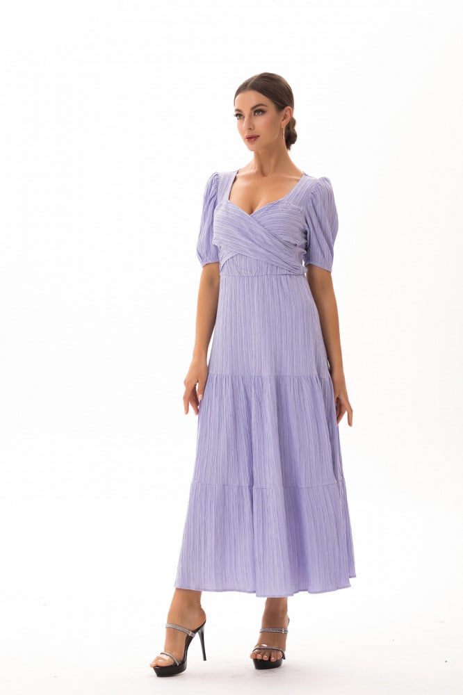 فستان ساده طويل بياقه مميزه واكمام قصيره مزمومه