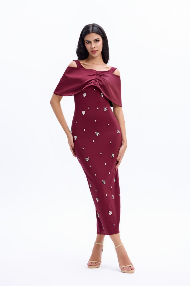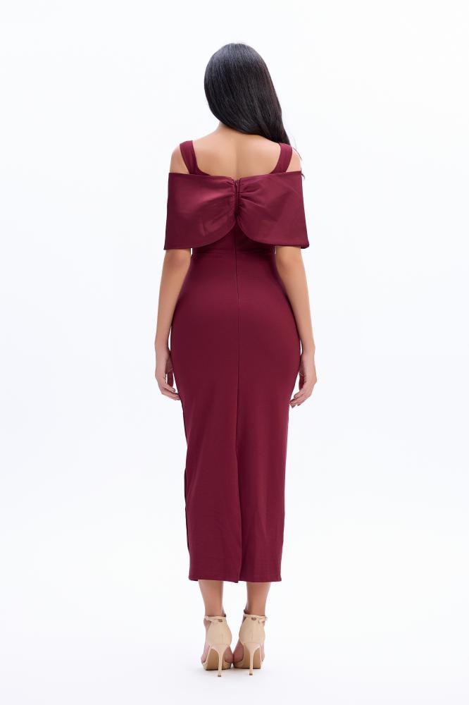 فستان بلون عنابي غني، بتصميم أنيق يبرز الأكتاف المكشوفة مع حمالات رفيعة وكاب مدمج يلتف حول الأكتاف ويعقد على شكل فيونكة بالخلف. يزين الفستان تطريز كريستالي لامع على كامل التصميم بطريقة متوازنة تضيف بريقًا ناعمًا. القصة الضيقة تبرز القوام، بينما تمنح التفاصيل الخلفية لمسة جمالية مميزة من كل الزوايا.