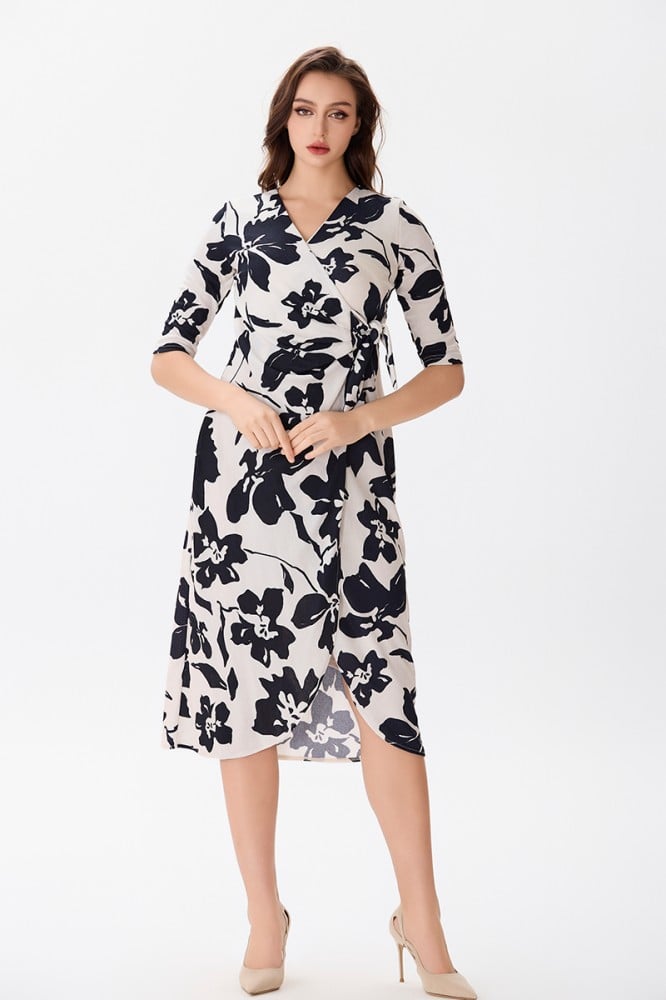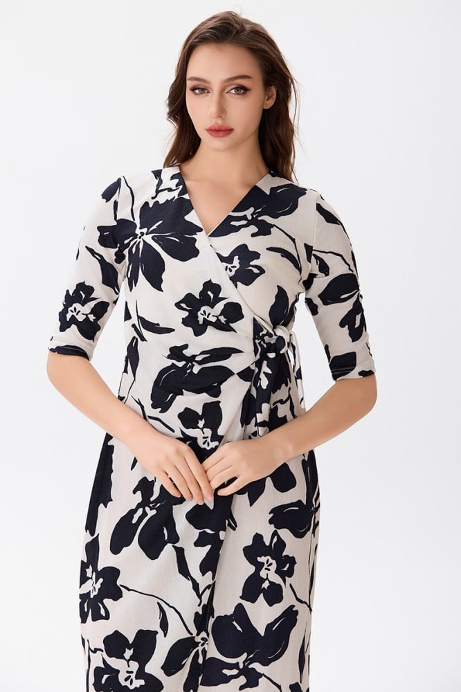 فستان قطن اوف وايت بنقشة الورد الأسود صدر مزدوج برباط جانبي على الخصرالخامة قطن : قابلة للتمددسماكة النسيج : خفيفة