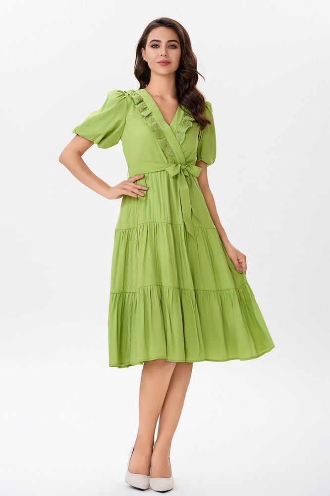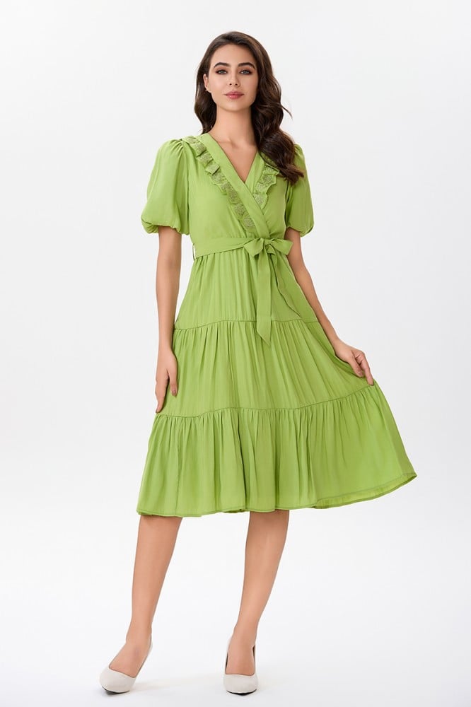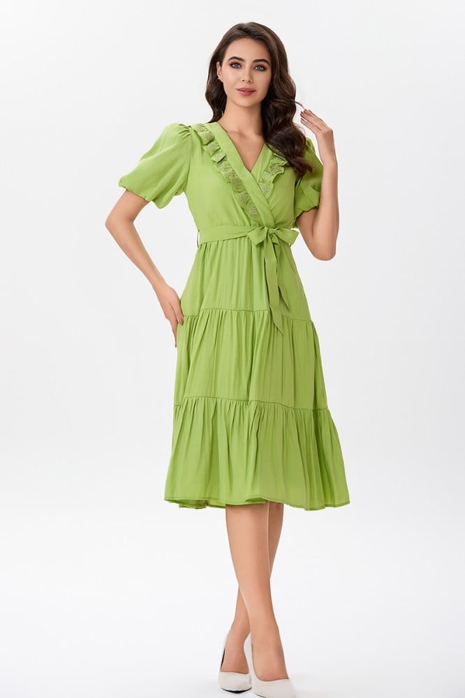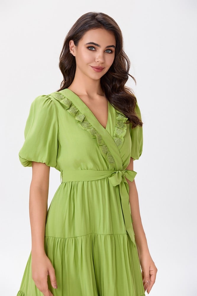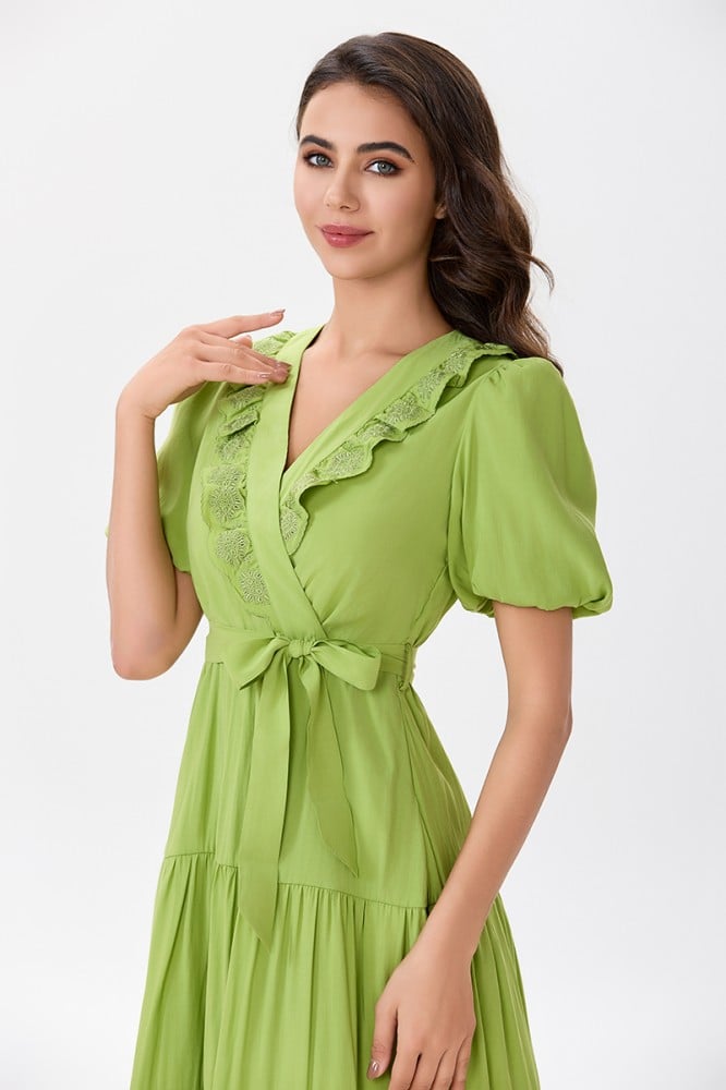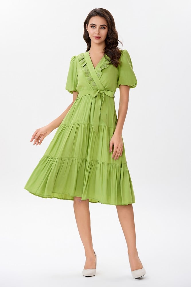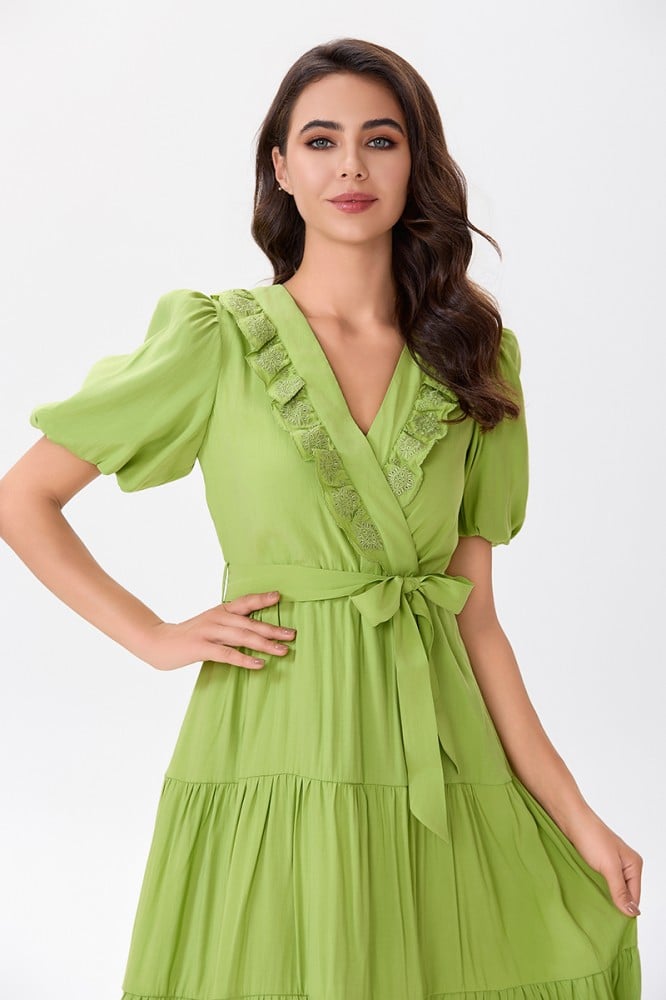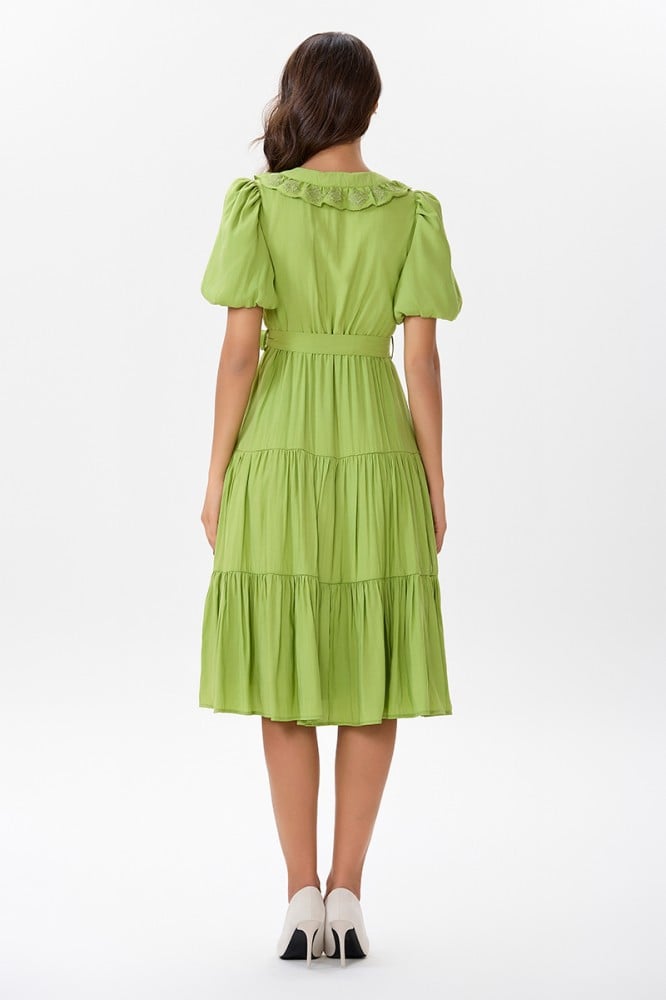 فستان قطن اخضر مع كشكش مطرز على طرف الياقة المزدوجة مع رباط على الخصر وتنورة كلوش بقصات متعددةالخامة قطن : غير قابلة للتمددسماكة النسيج : خفيفةدليل المقاسات