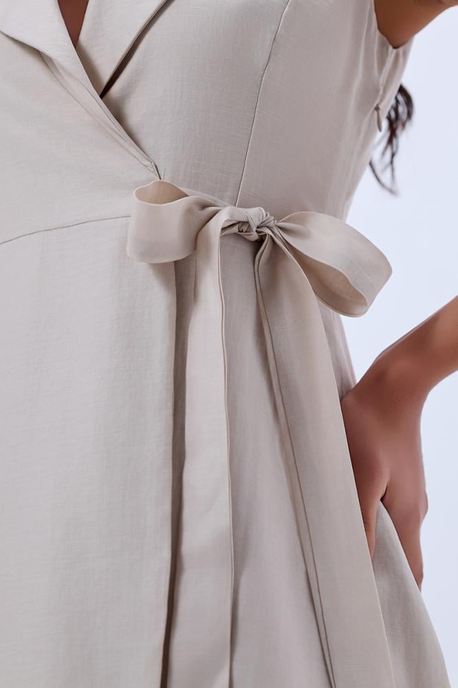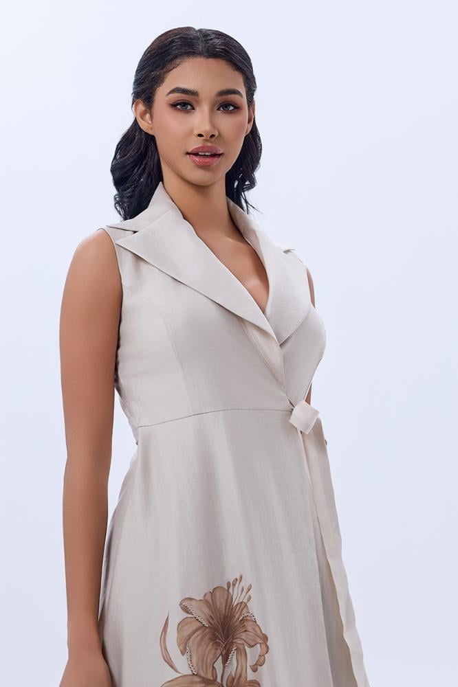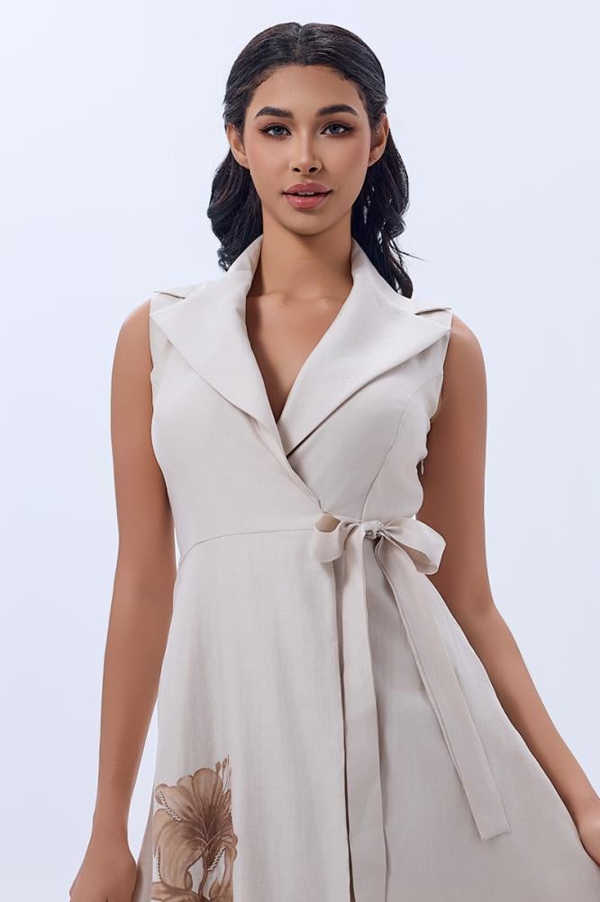 فستان كتان بيج بقصة جاكيت مزدوجة مع نقشة ورد بتطريز ناعم على طرف التنورة الكلوش