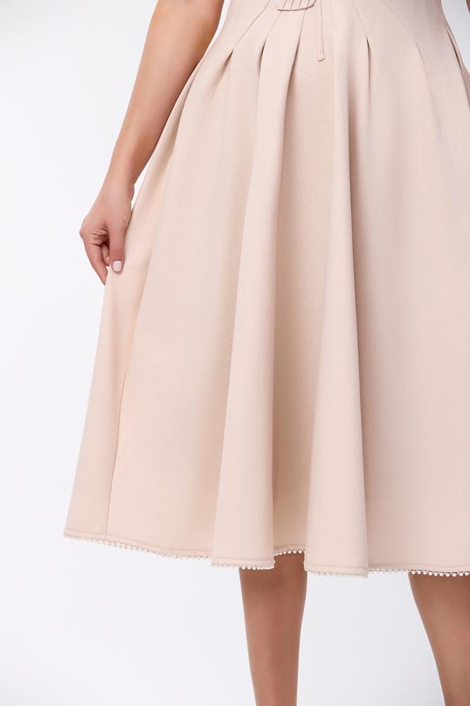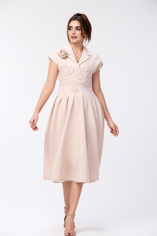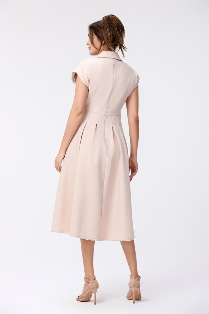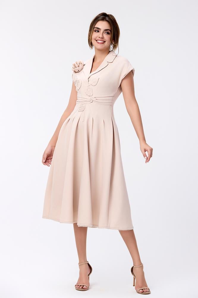 فستان كتان بيج مع قصات مميزة وحركة خام عصرية لتصميم الوردة اما قصة الفستان فهي قصة جاكيت بتنورة كلوش