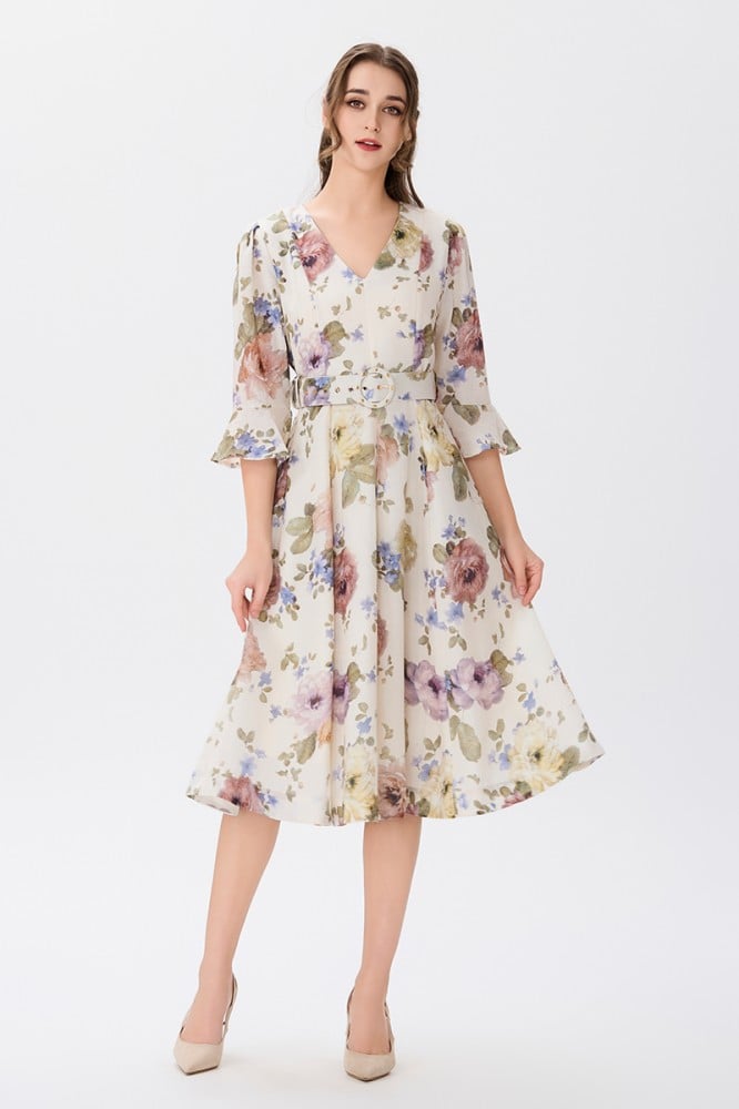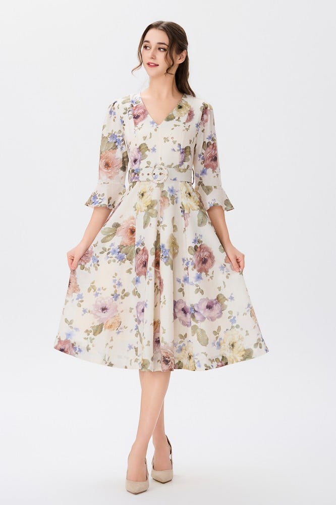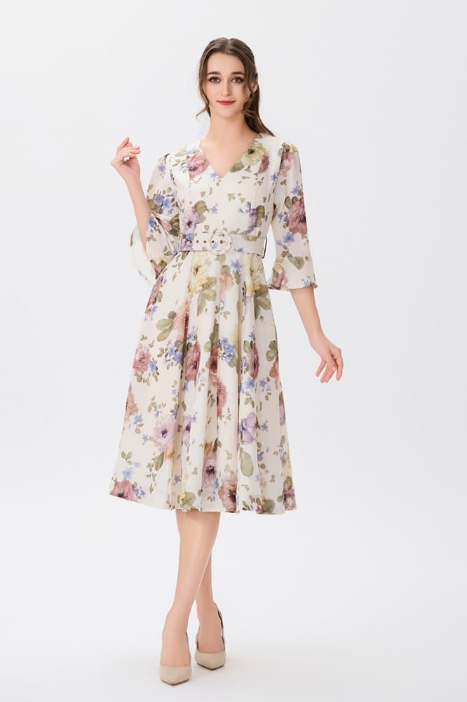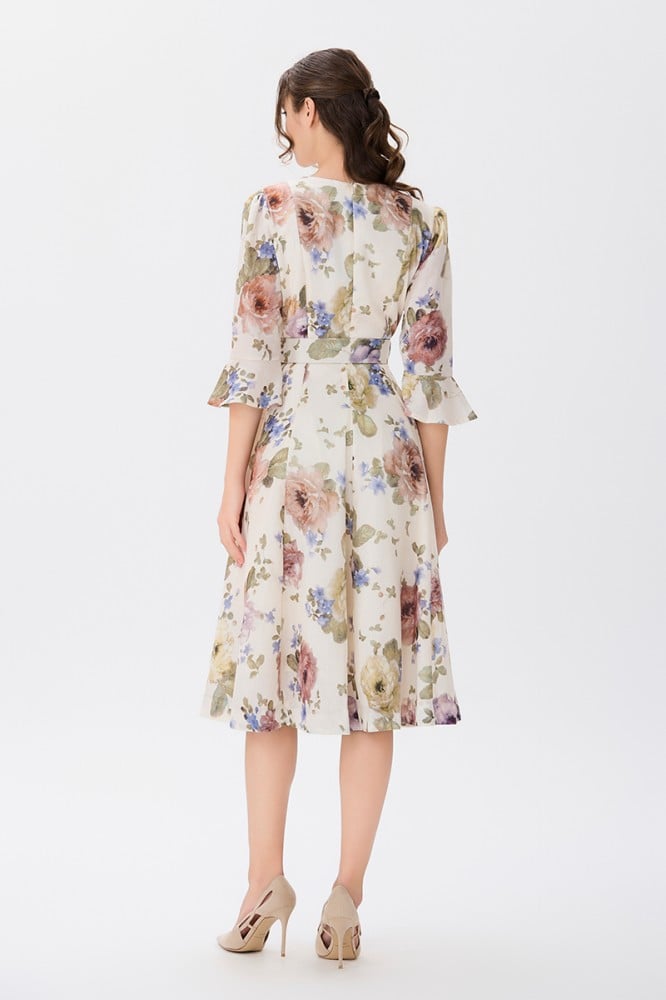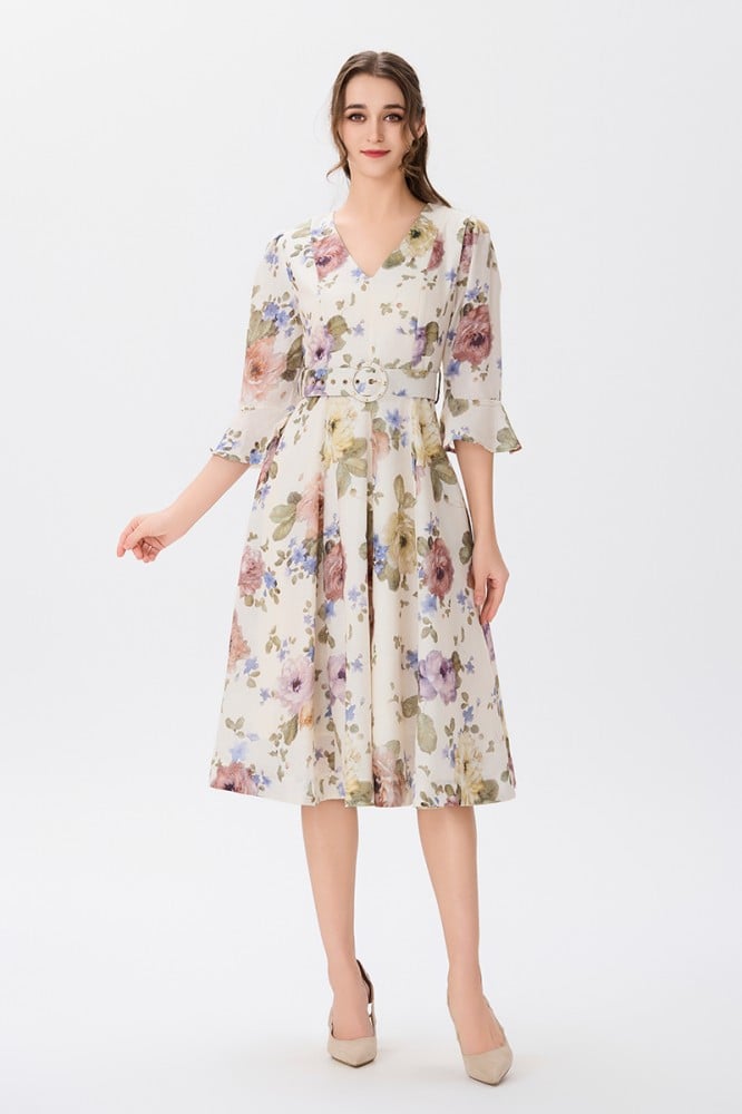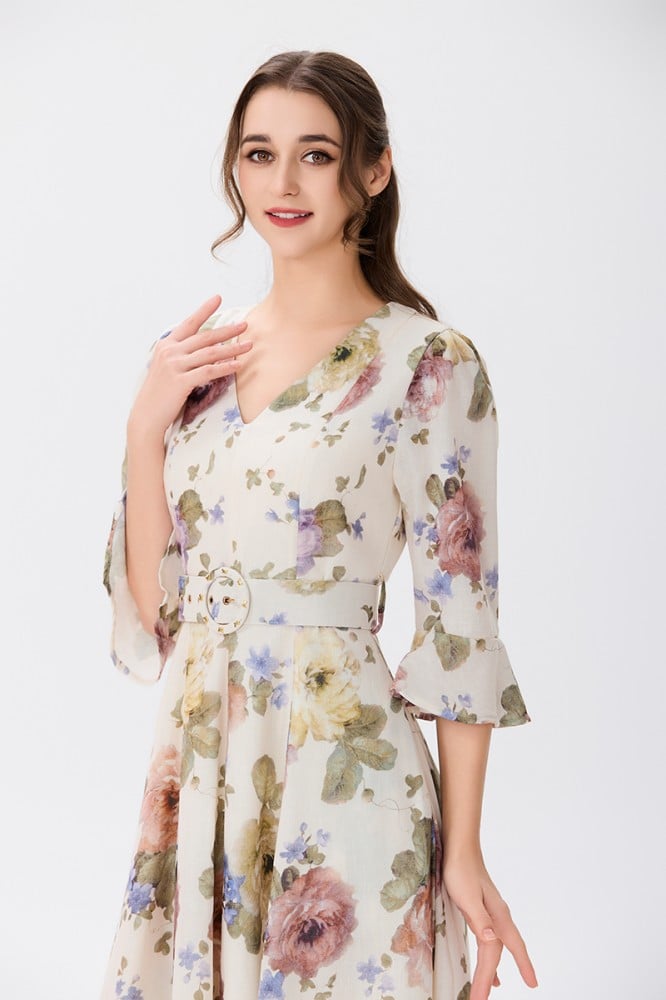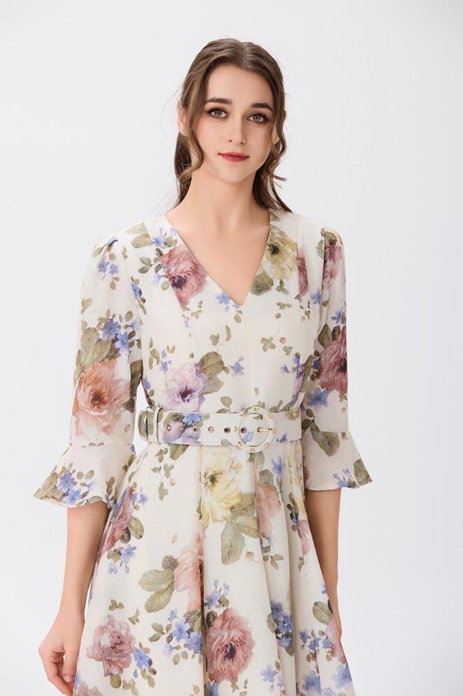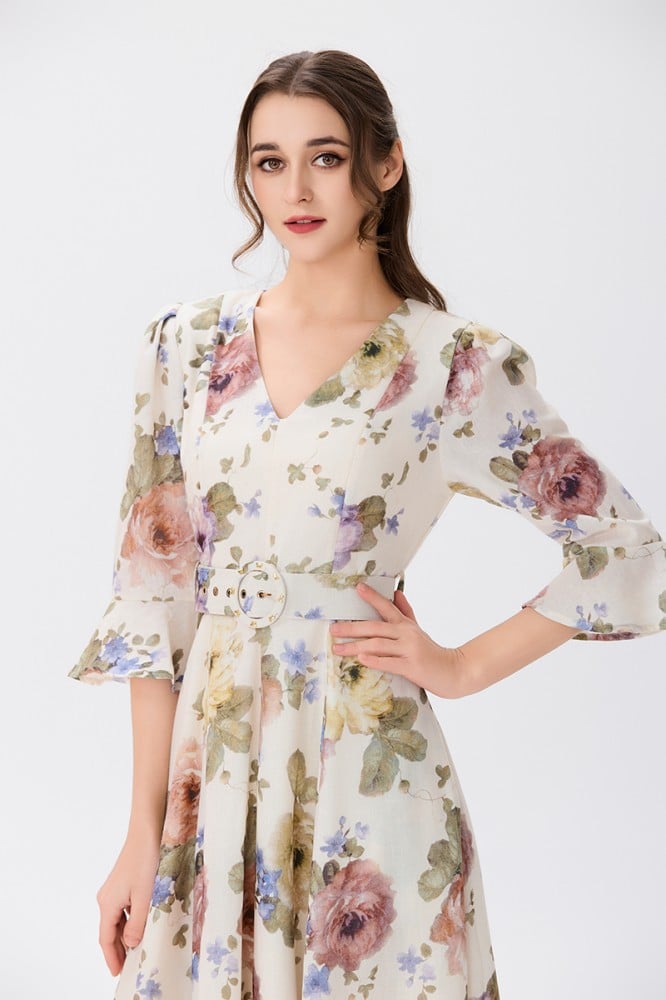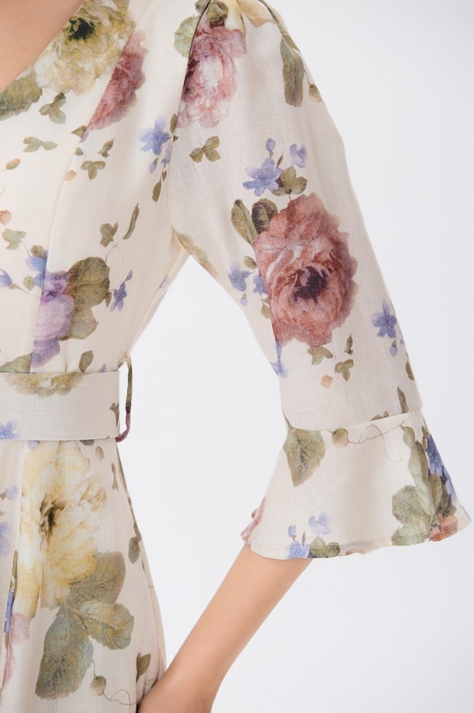 فستان كتان ناعم بنقسة الورود الملونة قصة كلاسيكية مفصلة لإبراز الجسم مع اكمام بطرف كشكش وحزام عريض لتحديد الخصر بتنورة كلوش بوسع غني