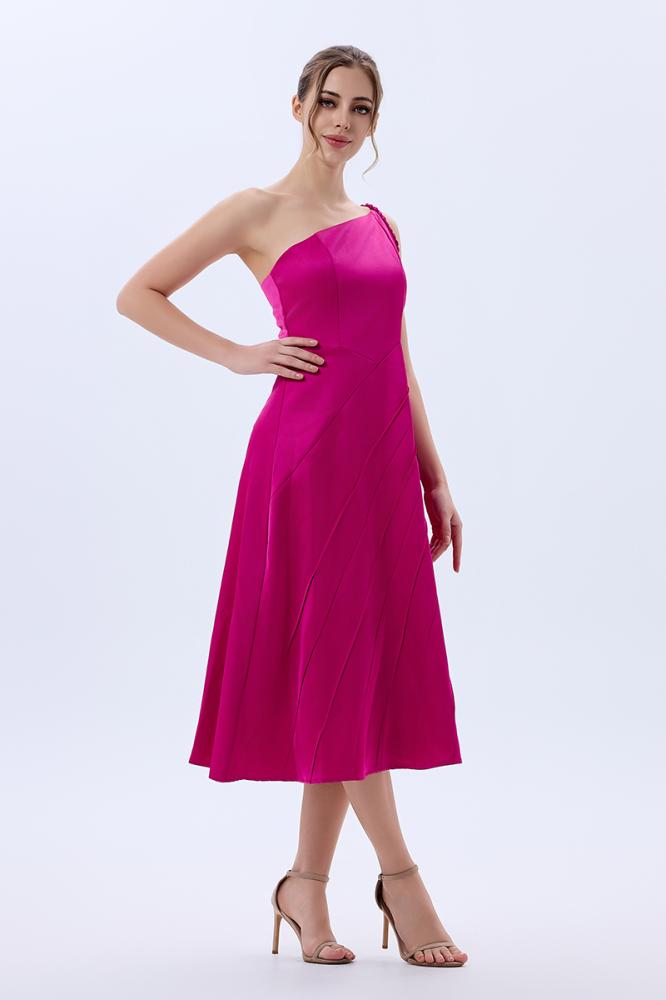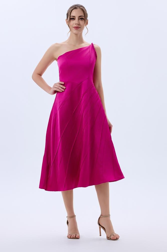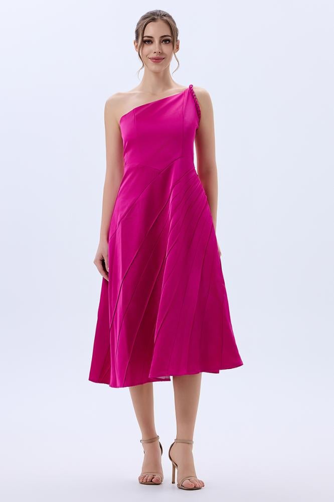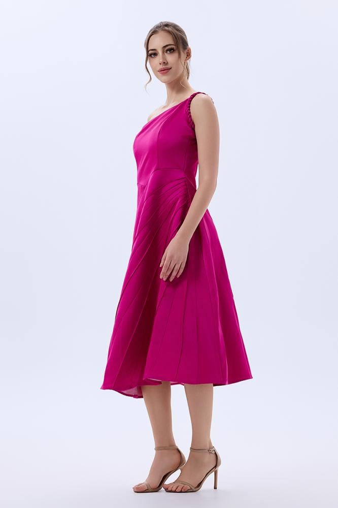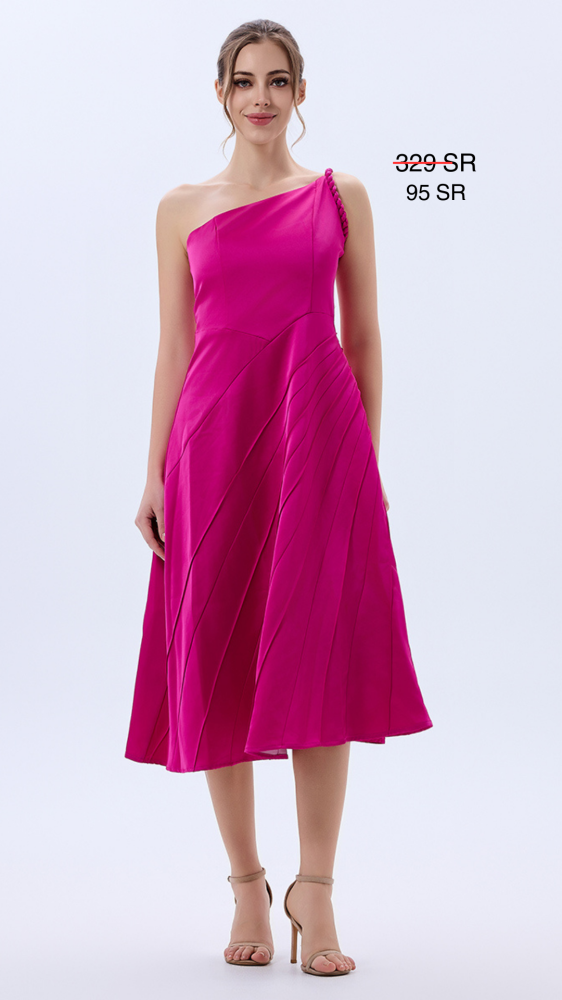 فستان كلوش كريب لون فوشيا بقصات بارزة وكتف روماني بتصميم عصري لافت