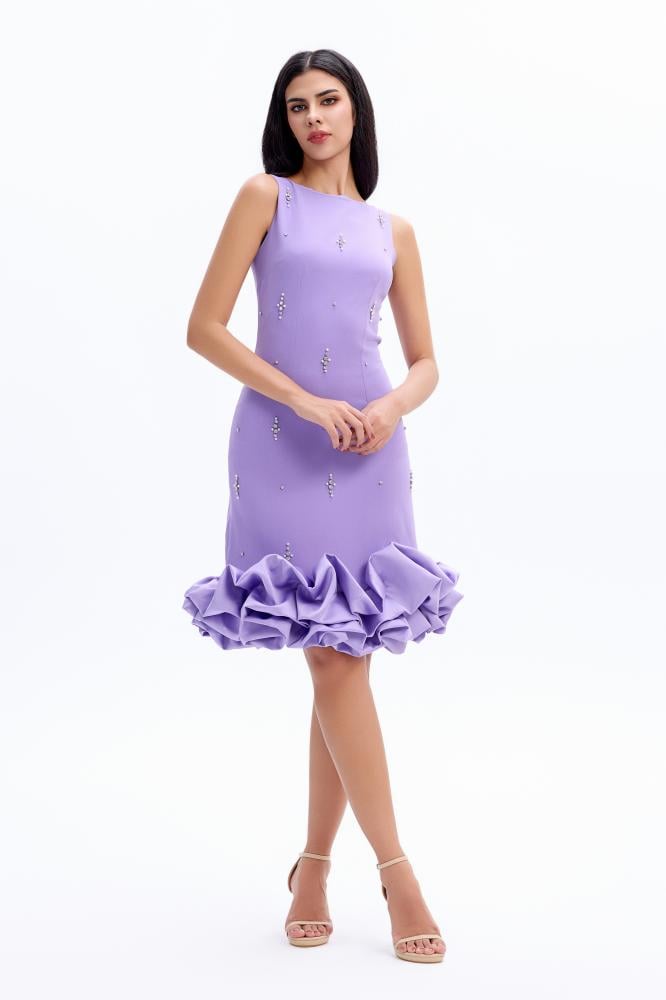 فستان كريب بنفسجي فاتح بدون أكمام مزين بكرستالات ولمسة كشكش أنثوية