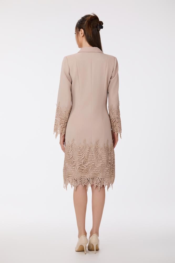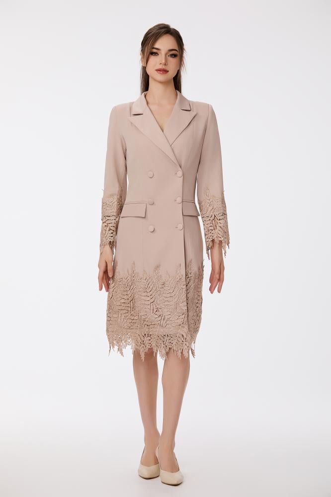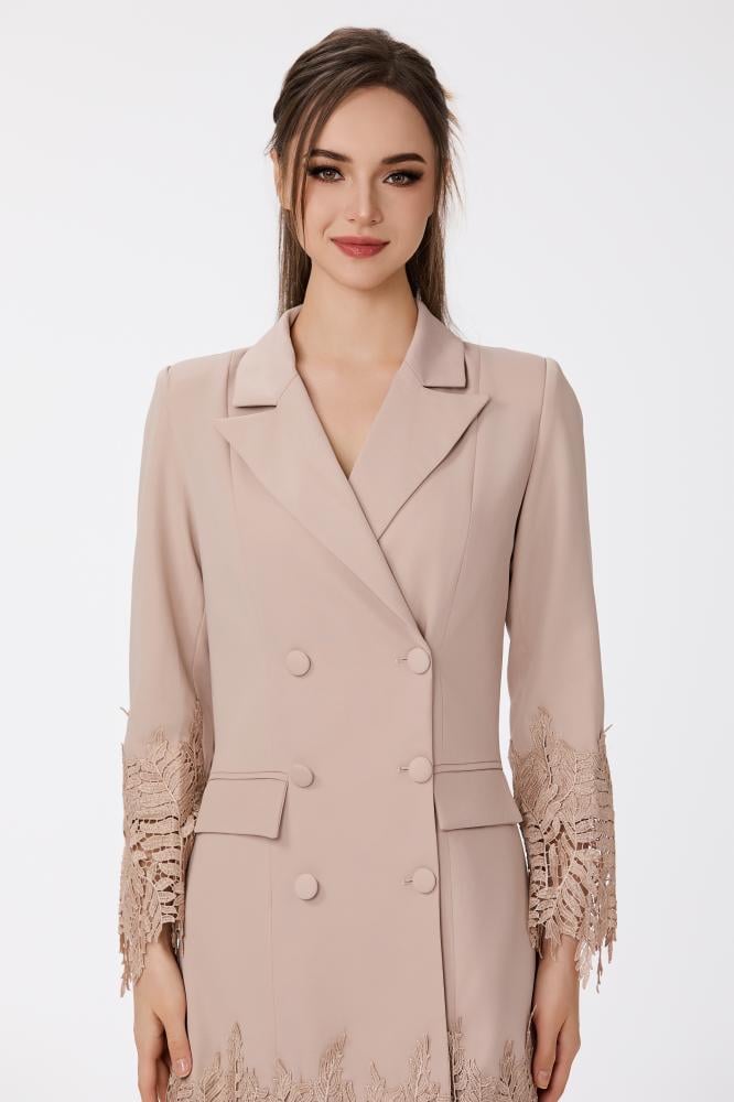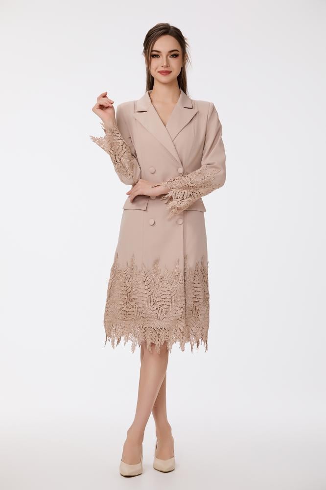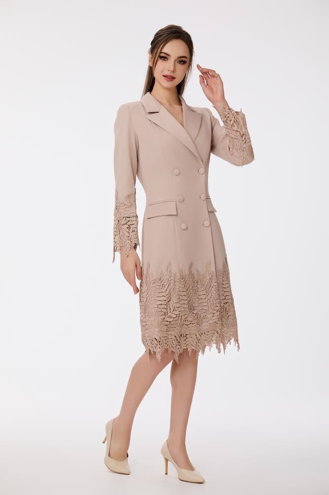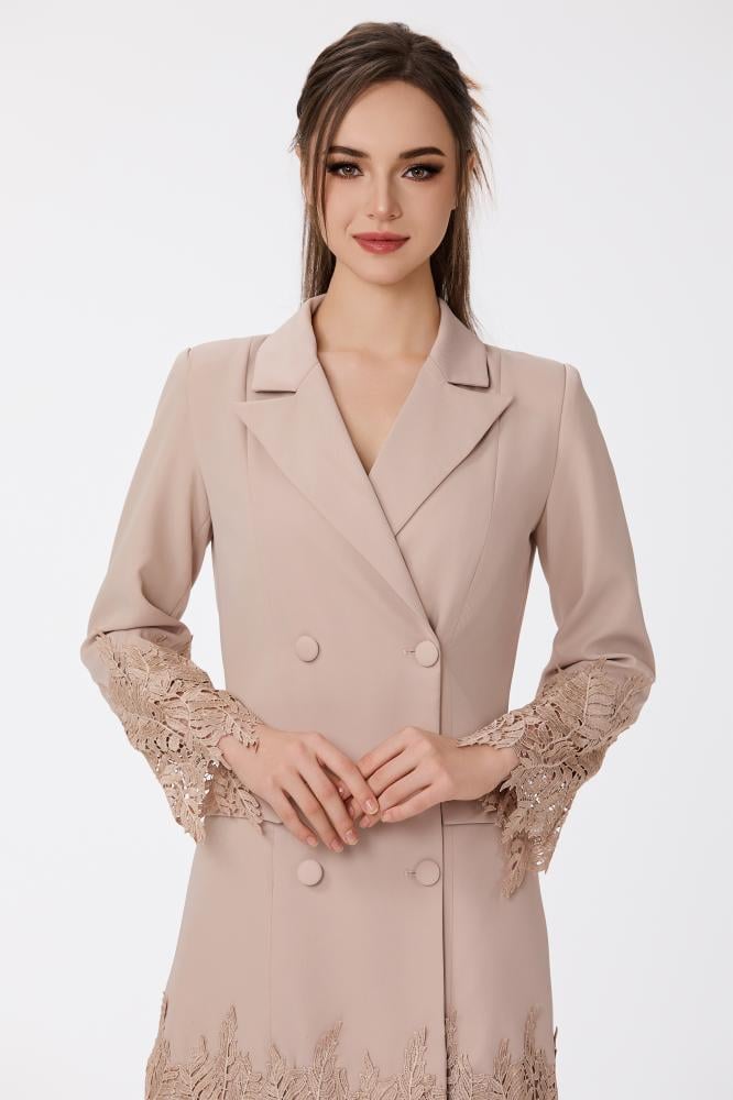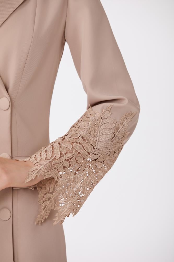 فستان كريب أنيق بتصميم قصة جاكيت باللون البيج، يتميز بصدر مزدوج يمنحه مظهراً كلاسيكياً وجذاباً. يزين طرف الأكمام كلف غيبور فاخر، ليضفي لمسة راقية على التصميم. هذا الفستان مثالي للمناسبات الرسمية والإطلالات الراقية، حيث يجمع بين الأناقة والراحة في آنٍ واحد. تفاصيله الدقيقة تضيف لمسة من الفخامة، ليكون خيارك الأمثل لإطلالة مميزة.